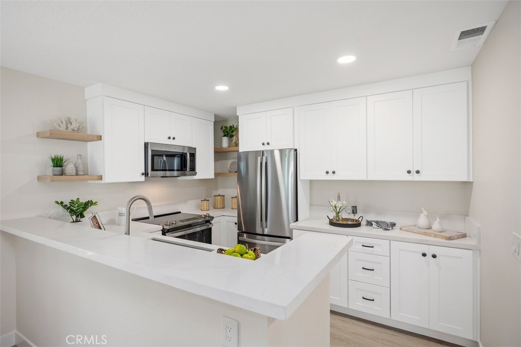 Welcome to 9 Brighton, your beautifully and completely remodeled haven in the Beacon Hill Seawatch community of Laguna Niguel. Prepare to be amazed, this home has undergone an extensive transformation, featuring an array of upgrades that elevate its style and comfort and single level living with no steps. Step inside to discover the elegance of Milgard windows and sliders, which flood the space with natural light that reveals peaceful and attractive surrounding landscapes. New luxury vinyl flooring and baseboards throughout. The kitchen has been completely reimagined with new cabinets, quartz countertops, and brand new stainless steel appliances. The addition of can lighting and sleek white oak floating shelves enhances the modern and coastal aesthetic. Every room in this home has been thoughtfully upgraded, including the bathrooms, which now boast a bathtub and raised modern style shower head, beautiful Bedrosian Chloe tile shower, new glass doors, vanities, mirrors, toilet and light fixtures. Both bedrooms have new ceiling fans for added comfort, and the mirrored closet doors add a touch of sophistication and greatly expanded sense of space. With fresh paint throughout and Pottery Barn and Crate & Barrel light fixtures in the dining and entry way, this home is truly move-in ready, offering a blend of style and functionality that is second to none. The covered patio is accessible through both the Primary bedroom and the dining area located in a garden setting for outdoor entertainment. Only 2 miles to Salt Creek beach, 5 star resorts, restaurants and shops. Steps away from community pools, tennis courts, parks and Award winning school - John Malcom Elementary. HOA dues include water and trash. VA APPROVED COMPLEX