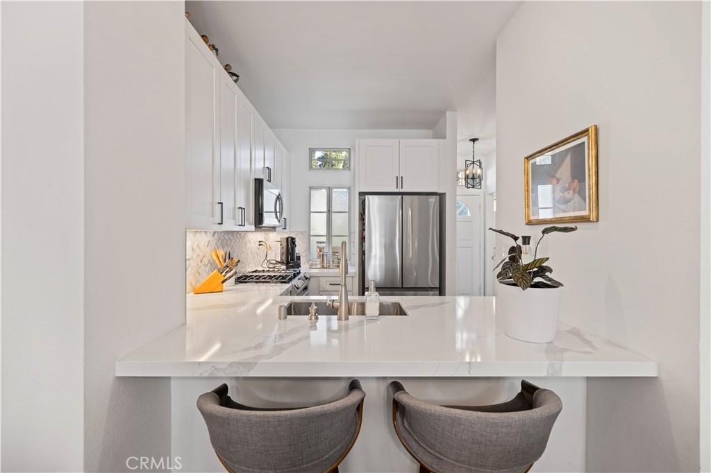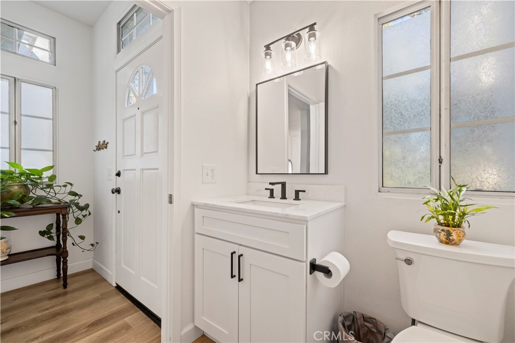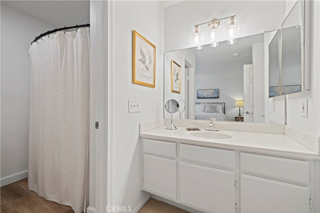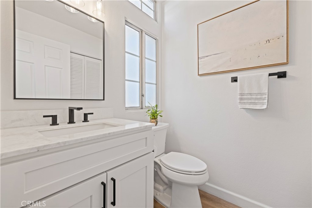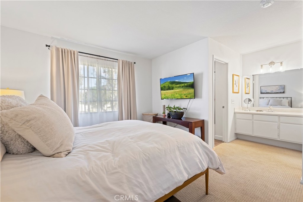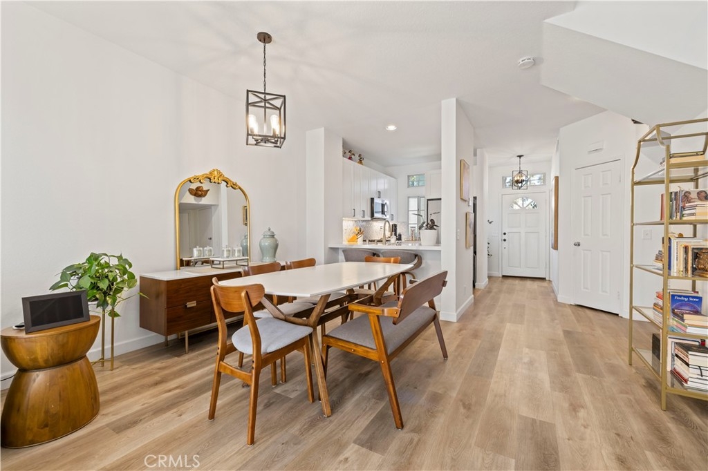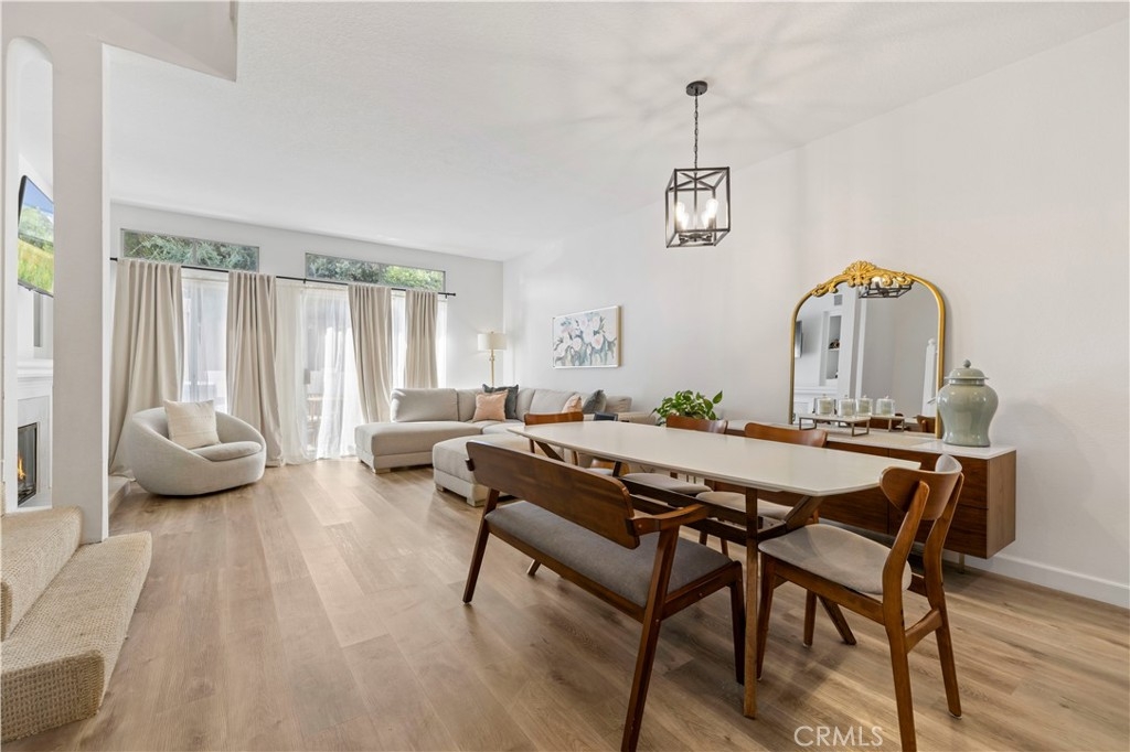Tucked inside the gated community of Bridgeport Terrace, this stylish two-story townhome offers modern updates and a prime Laguna Niguel location. The neighborhood features just 48 residences surrounded by well-manicured landscaping and peaceful greenbelts. This 2-bedroom, 2.5-bath home with direct-access garage entry showcases 9-foot ceilings and a beautifully remodeled interior. The kitchen boasts white shaker cabinetry with soft-close doors, Calacatta Leon quartz countertops, a chevron glass backsplash, under-cabinet lighting, matte black hardware, and stainless steel appliances. The main level features luxury vinyl plank flooring, tall baseboards, and upgraded lighting, including a matte black chandelier in the dining area and a coordinating stairwell sconce. The living room centers around a cozy wood-burning fireplace and opens to a private patio with white vinyl fencing and direct access to the greenbelt, perfect for relaxing or entertaining. Upstairs, you’ll find two spacious primary suites, each offering its own ensuite bath and sizeable walk-in closet. A convenient main-level powder room and interior laundry area complete the home’s layout. Plus, there is an additional assigned parking space tucked conveniently behind the unit. Bridgeport Terrace residents enjoy gated access, a community pool and spa, plus BBQ and picnic areas. HOA dues cover basic AT&T cable, trash service, exterior maintenance, landscaping, and structure insurance. FHA and VA approved. Conveniently located near the 73 Toll Road, I-5, local shopping, dining, entertainment, Saddleback College, and just a short drive to beaches and Dana Point Harbor.
