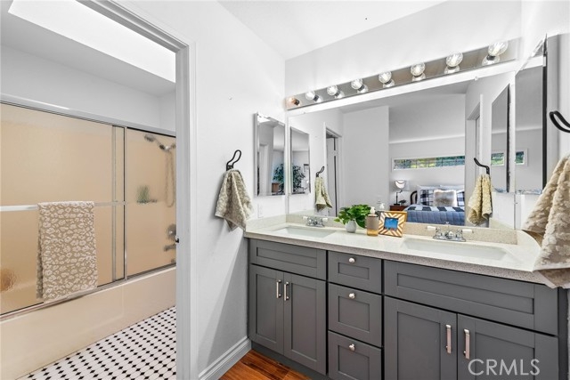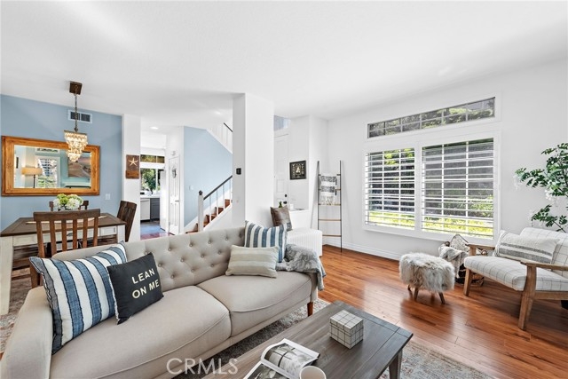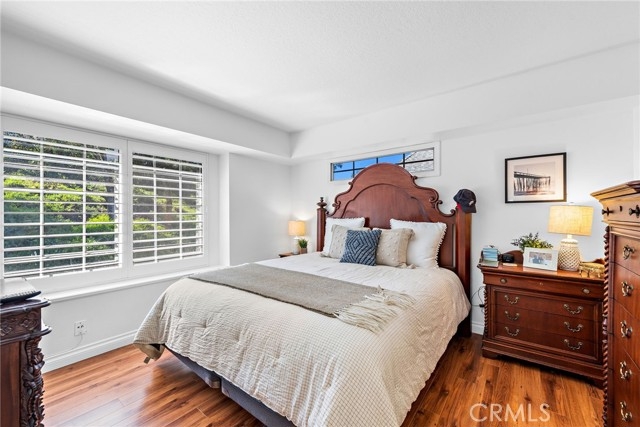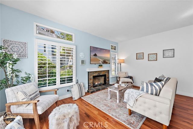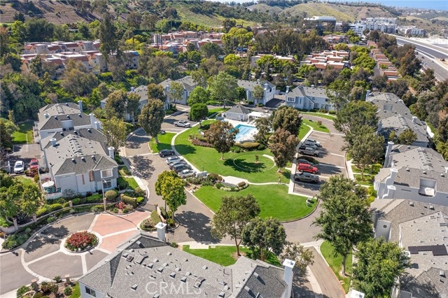This charming 2-bedroom, 2.5-bath home is perfectly situated along a serene greenbelt, offering a sense of privacy. With high ceilings and abundant windows, the home is bathed in natural light. The living room features views of the greenbelt, a cozy fireplace, and rich luxury laminate wood-like floors. A stylish chandelier adds a touch of flair to the dining room. Conveniently, a powder room is located off the living area completing the lower level. The updated kitchen boasts matte tile floors, a combination of white and gray shaker-style cabinets, quartz countertops, a subway tile backsplash, and modern stainless steel appliances. The spacious enclosed patio, accessible from the kitchen, is perfect for gatherings and overlooks a large greenbelt area instead of neighboring homes. Upstairs, the light-filled second story includes two bedrooms, each with an ensuite bath and walk-in closet, as well as a dedicated laundry room. The bathrooms have been tastefully updated with shaker-style cabinets, quartz countertops, and new sinks and faucets. The entire house is immaculate, crisp, and move-in ready, with recent painting and roof completed by the HOA adding extra value. Bridgeport Terrace is a gated community of just 49 homes, close to shopping, freeways, and local beaches. Located in Laguna Niguel, it is approximately one hour north of San Diego and one hour south of Los Angeles, with the coastal towns of Dana Point and Laguna Beach just a short drive away.