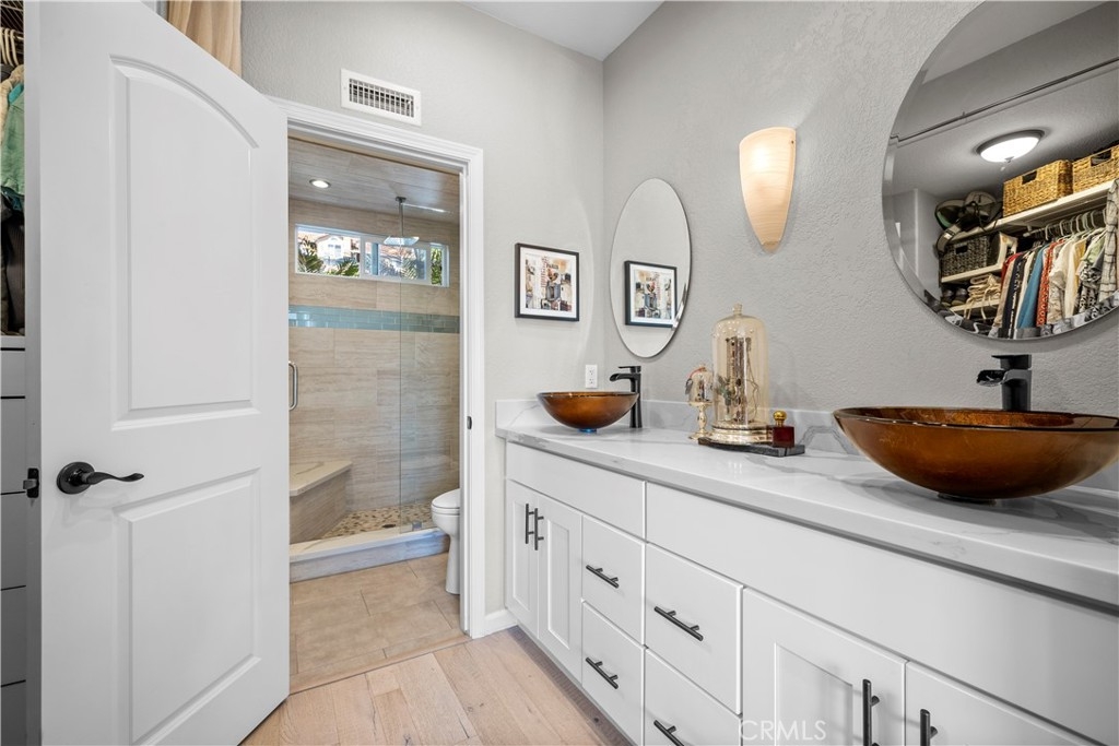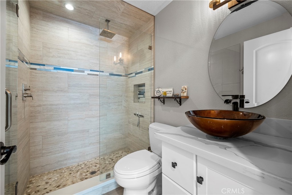 Welcome to 29386 Via Napoli, Laguna Niguel – a completely remodeled gem that perfectly blends style, comfort, and convenience. This turnkey, single-level home offers 2 bedrooms, 2 bathrooms, 1,037 sq ft of thoughtfully designed living space. Every inch of this home has been meticulously upgraded with high-end finishes, from the sleek kitchen to the modern bathrooms. The open and spacious floor plan is enhanced by high ceilings throughout, creating a sense of airy elegance. Exquisite solid French oak flooring and custom paint add warmth and character to every room. The inviting living room features French doors that open to a private patio, and a custom stone fireplace with reclaimed wood above the mantel – adding a touch of rustic charm. The beautifully remodeled kitchen flows seamlessly into the living area, perfect for entertaining. It boasts pendant lighting, quartz countertops, white wood cabinetry, a tile backsplash, floating shelves, recessed lighting, stainless steel appliances, and a garden window that lets in natural light. The spacious primary bedroom offers a stunning custom reclaimed wood accent wall and French doors that lead to the private patio. The ensuite bathroom features dual sinks, quartz countertops, white cabinetry, and a custom tile shower with a sleek glass enclosure. The guest bathroom is equally impressive, with quartz countertops, white cabinetry, and a custom tile shower. Additional highlights include a one-car garage with direct access, extra storage, and an electric charger for convenience. Located in the coveted Capri Community, this home offers a peaceful environment with lush landscapes and desirable community amenities. Plus, it’s just minutes away from shopping, dining, parks, walking trails, and the finest beaches in Southern California, with easy access to major freeways. Whether you’re relaxing or entertaining, this home provides the ideal space for both. With its stunning updates and unbeatable location, it's not just a house – it’s a lifestyle. Don’t miss out on the opportunity to make this beautiful property yours!