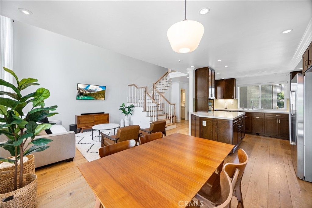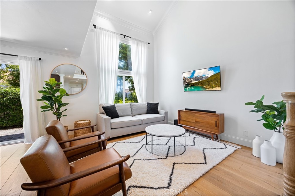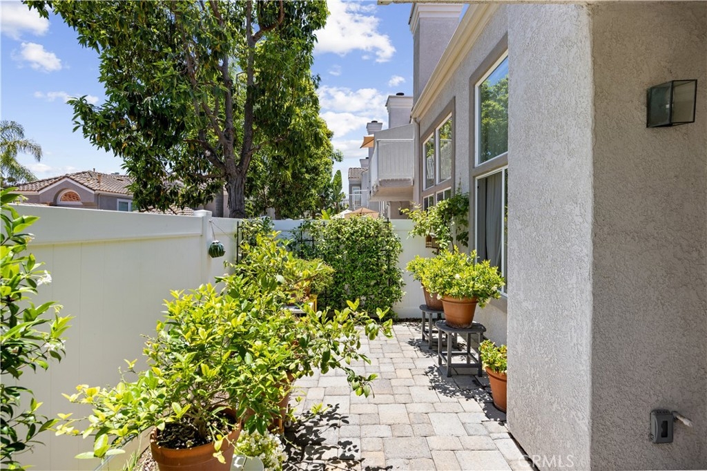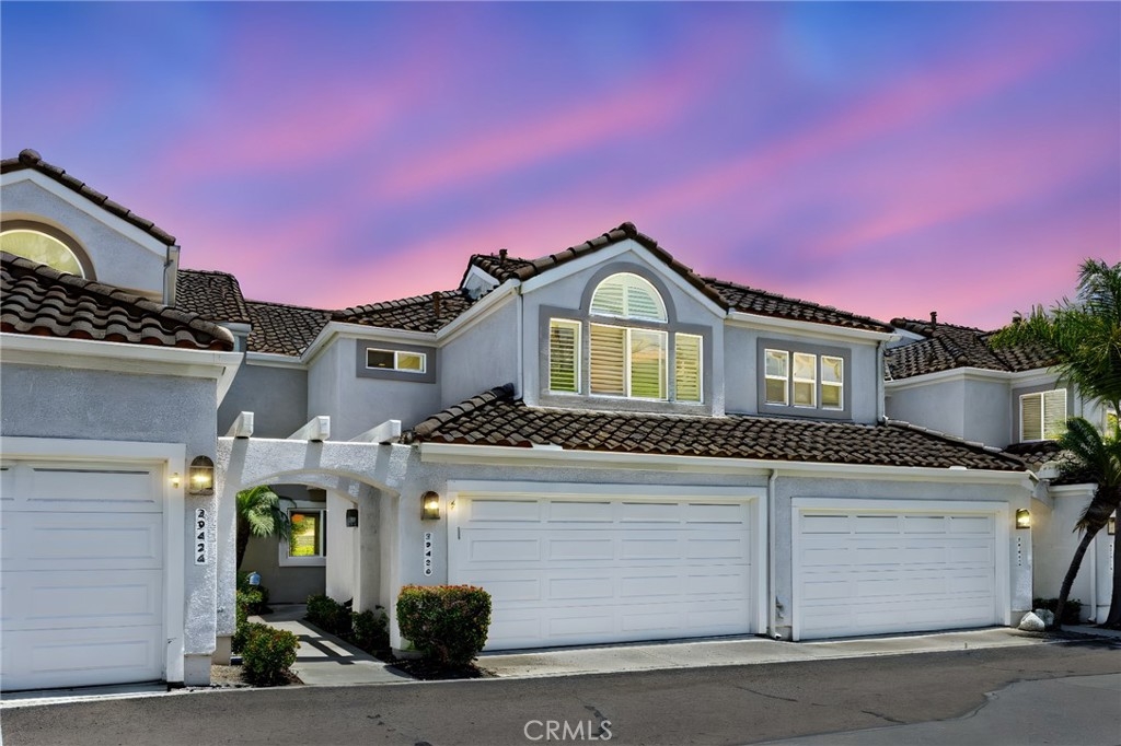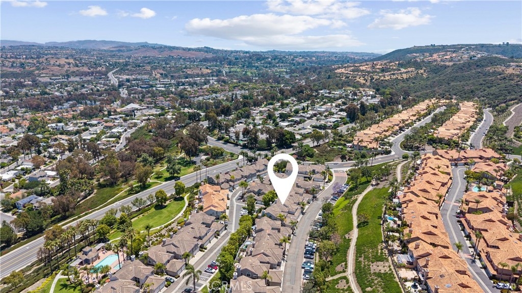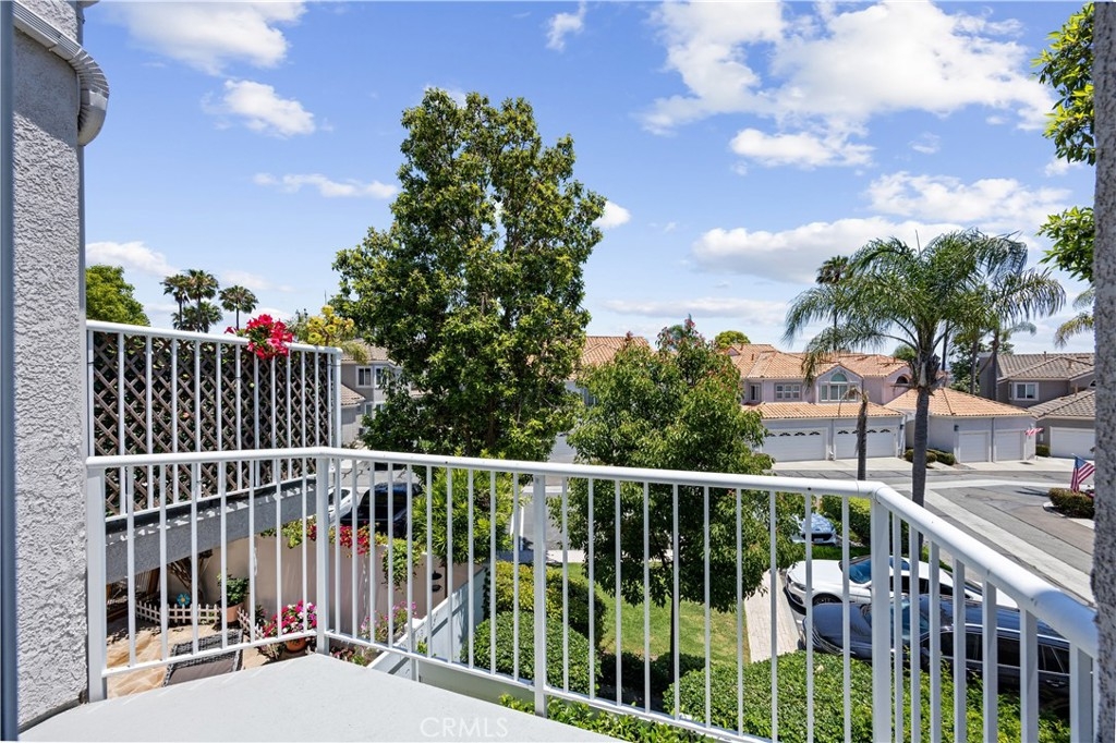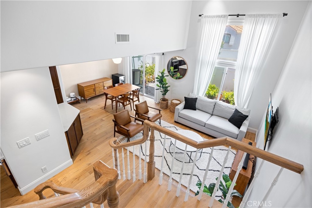 Beautiful home in the highly desirable Capri community located in the city of Laguna Niguel. Pristine and bright home with neutral colors through out just waiting for your personal touch to complement the palette of your choice. As you enter the front door you are greeted by white oak floors that lead you to an expansive open living room with soaring high ceilings. Natural light cascades in which highlight the openness of the living room design. This two story home offers 2 bedrooms and 2 full baths upstairs and 1 half bath conveniently located downstairs. The home has been thoughtfully designed for ease of movement. Entertaining will be a pleasure in this living room space thanks to a convenient slider adjacent to dining room for easy access. The kitchen is beautifully designed with a window that permits you to see the landscape outside and enjoy the beautiful outdoors along with Quartz counter tops. The kitchen has been upgraded with custom made wood cabinets, custom kitchen pullouts throughout and as an added bonus- a pull out pantry that enhances the design. A custom back splash adds an eye catching detail that bounces reflective light. High end stainless steel appliances are included like Bosch refrigerator and dishwasher, a New Air wine refrigerator, 5 burner Dacor luxury range stove and a Sharp microwave. The adjacent dining room conveniently has a slider that takes you to a large patio- perfect for your morning coffee or entertaining. Pendent lighting adds a touch of elegance in the dining room. The home features crown molding through out which enhances the modern floor plan design. The attached garage provides easy access to your Samsung washer and dryer and with groceries. The garage has a 2024 new Lift Master Garage door opener. The new water heater was installed in 2024 and is permitted. The upstairs offers two spacious bedrooms each with a fan and two upgraded bathrooms. The spacious primary bedroom is both light and bright with a ceiling fan and offers a custom walk in closet. Additionally the primary bathroom offers custom quartz tile, towel warmer and custom shower niches and dual sinks for your convenience. Enjoy many resort -style amenities including a sparkling pool, spa, walking trails nearby and beautifully maintained grounds. This home is conveniently located to shopping, dining, and award winning schools. Walk at nearby beaches and enjoying sunset views will be a delight.