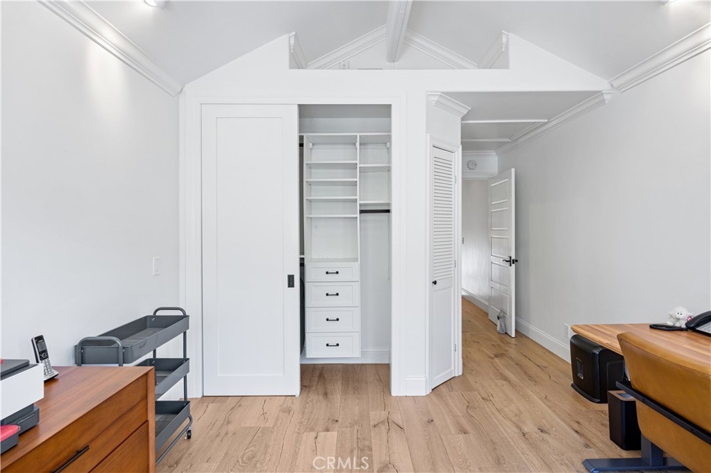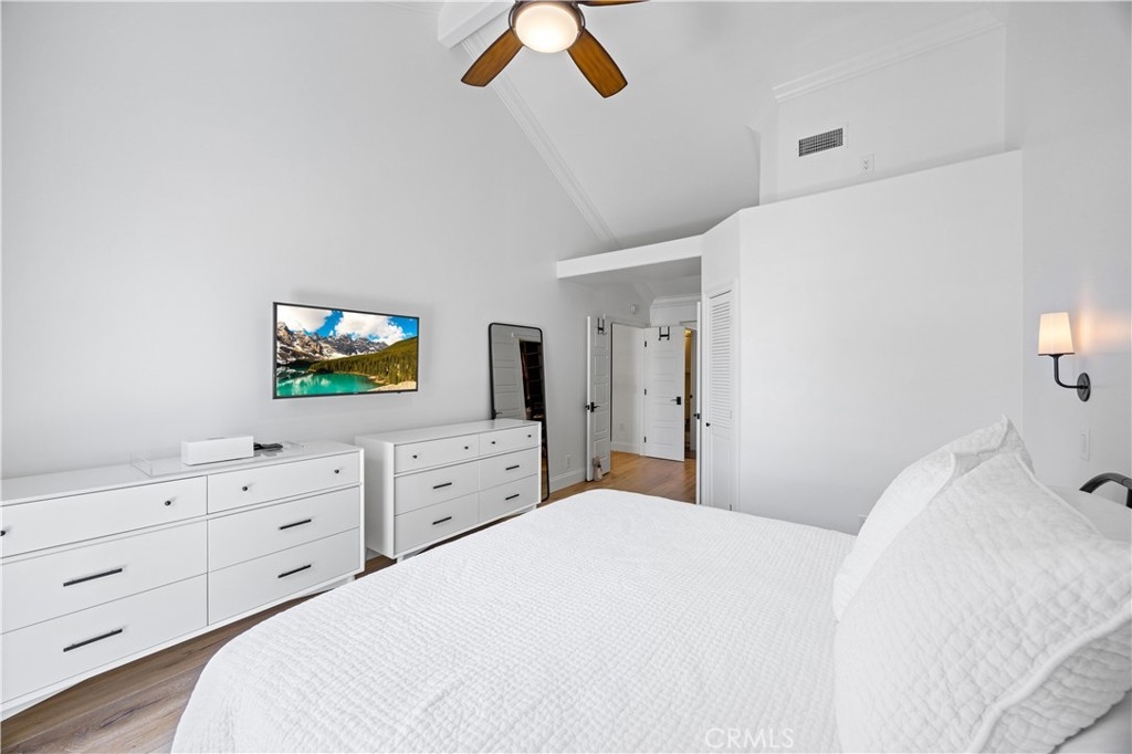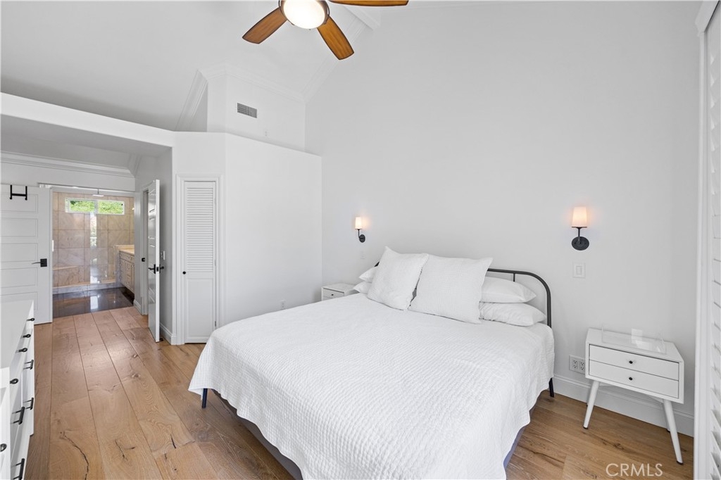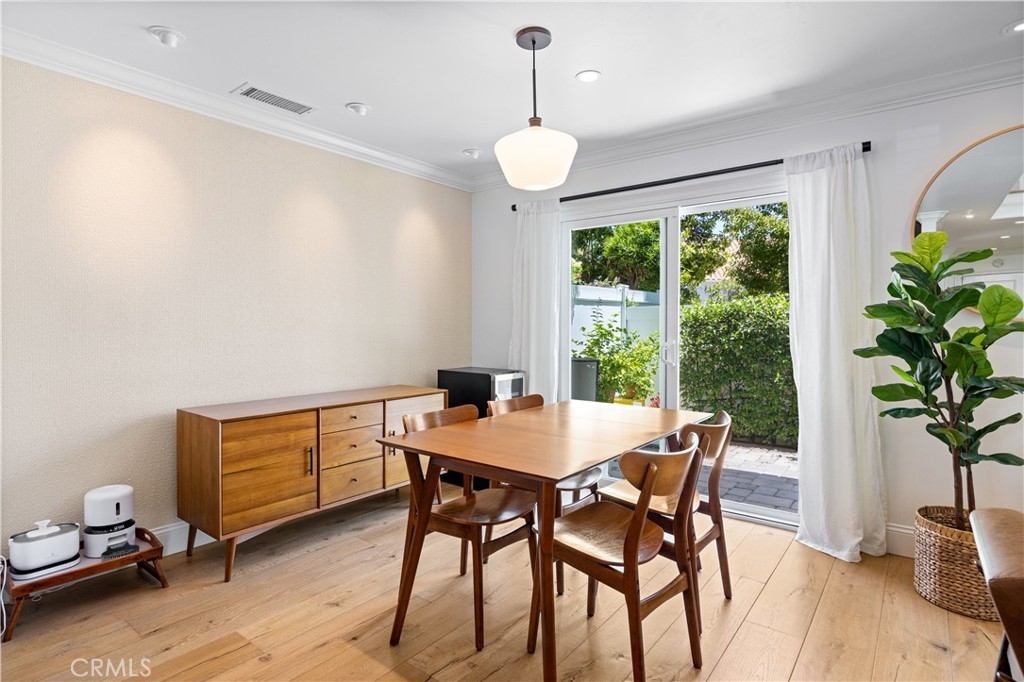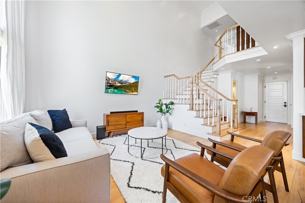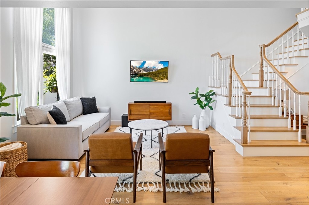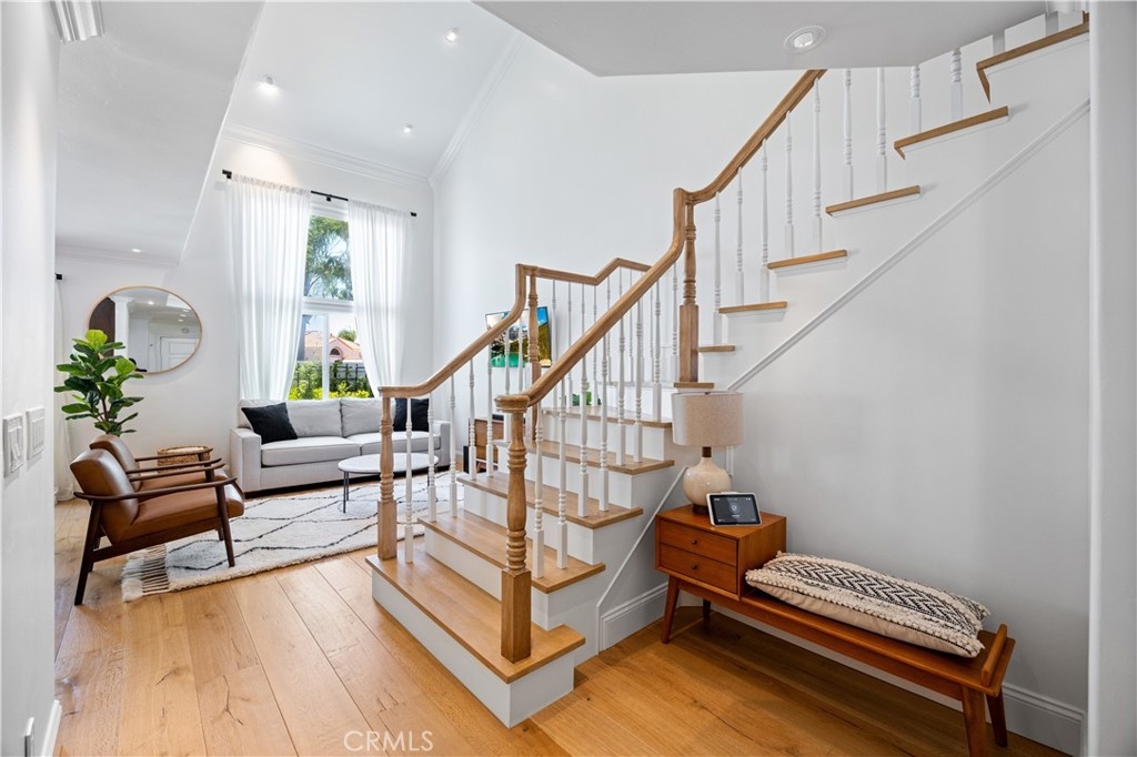 Beautiful home in the highly desirable Capri community located in the city of Laguna Niguel. Pristine and bright home with neutral colors through out just waiting for your personal touch to complement the palette of your choice. As you enter the front door you are greeted by white oak floors that lead you to an expansive open living room with soaring high ceilings. Natural light cascades in which highlight the openness of the living room design. This two story home offers 2 bedrooms and 2 full baths upstairs and 1 half bath conveniently located downstairs. The home has been thoughtfully designed for ease of movement. Entertaining will be a pleasure in this living room space thanks to a convenient slider adjacent to dining room for easy access. The kitchen is beautifully designed with a window that permits you to see the landscape outside and enjoy the beautiful outdoors along with Quartz counter tops. The kitchen has been upgraded with custom made wood cabinets, custom kitchen pullouts throughout and as an added bonus- a pull out pantry that enhances the design. A custom back splash adds an eye catching detail that bounces reflective light. High end stainless steel appliances are included like Bosch refrigerator and dishwasher, a New Air wine refrigerator, 5 burner Dacor luxury range stove and a Sharp microwave. The adjacent dining room conveniently has a slider that takes you to a large patio- perfect for your morning coffee or entertaining. Pendent lighting adds a touch of elegance in the dining room. The home features crown molding through out which enhances the modern floor plan design. The attached garage provides easy access to your Samsung washer and dryer and with groceries. The garage has a 2024 new Lift Master Garage door opener. The new water heater was installed in 2024 and is permitted. The upstairs offers two spacious bedrooms each with a fan and two upgraded bathrooms. The spacious primary bedroom is both light and bright with a ceiling fan and offers a custom walk in closet. Additionally the primary bathroom offers custom quartz tile, towel warmer and custom shower niches and dual sinks for your convenience. Enjoy many resort -style amenities including a sparkling pool, spa, walking trails nearby and beautifully maintained grounds. This home is conveniently located to shopping, dining, and award winning schools. Walk at nearby beaches and enjoying sunset views will be a delight.