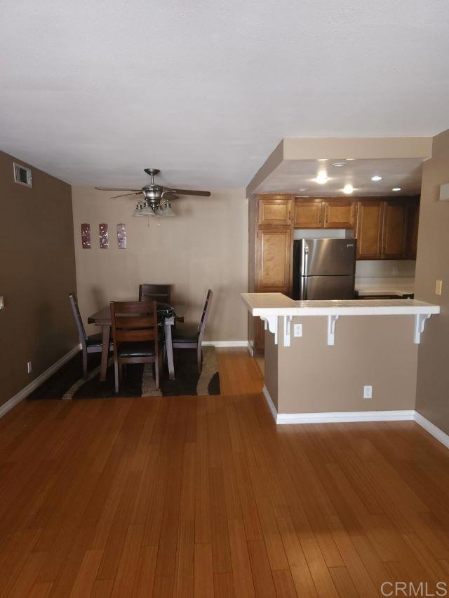Charming 1 bedroom, 1 bath condo in "Casa La Paz". Just 144 units right across the street from shopping and restaurants. This is a single level, upstairs end unit with balcony. Amenities include pool, spa, clubhouse and adjacent huge private park with picnic tables, two lighted tennis courts, a fenced dog park and ball fields, all for exclusive use of residents. This perfect location is just a few minutes to the 73-toll road and the 5 Fwy, and about 15–20-minute drive to beautiful Laguna Beach and Dana Point. Stainless appliances and microwave, wood flooring & new carpeting in the bedroom which features a walk-in closet. Added ceiling fan in eating area for great air circulation. Inside stacking washer/dryer closet for convenience, Washer/dryer and refrigerator stays. HOA.