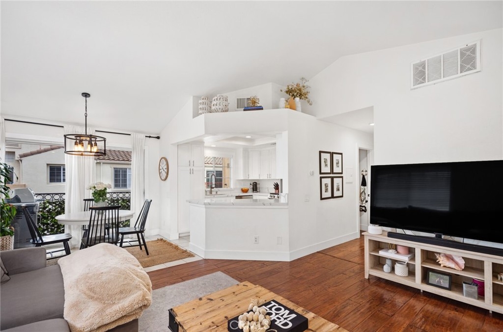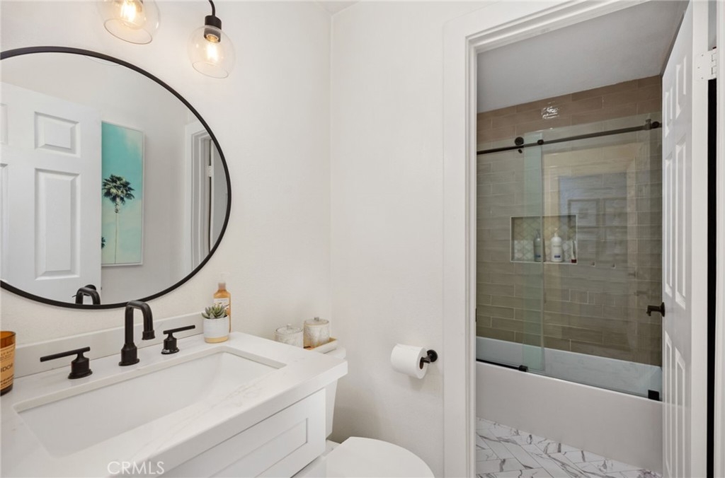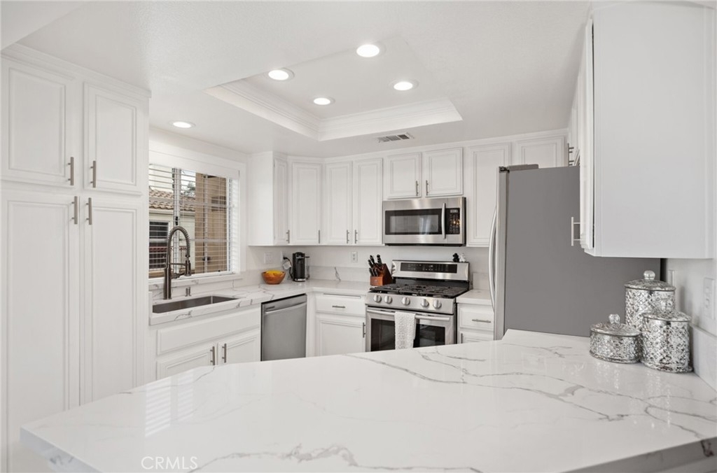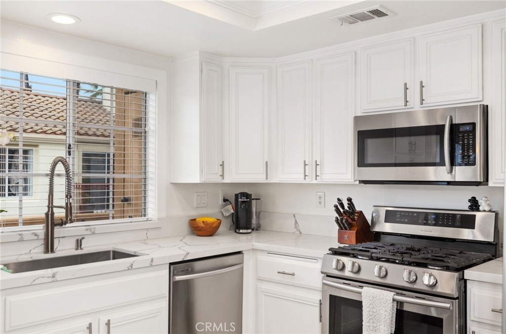 This chic end unit condo located in Marina Hills' Chandon community will check every box on your wishlist. You'll be greeted by high ceilings and beautiful wood floors when you walk in. The living room, kitchen, and dining area are all connected making for an open concept floor plan. The elegant kitchen features newer appliances, white cabinets, and quartz counters. The home has many windows throughout, bringing in an abundance of natural light. There is one beautifully remodeled bathroom located off the hallway, as well as the secondary bedroom, currently set-up as a nursery. The primary bedroom is located at the end of the hallway and has very high ceilings. The renovated primary bathroom features a double vanity and marble herringbone floor tiles. The home also features two balconies and an oversized 2 car garage. The entire complex has been repiped with PEX piping. Marina Hills features lush landscaping, pools and spas, tennis courts, pickleball courts, a clubhouse, and parks. It’s also easy access to Dana Point Harbor, Laguna Beach, and the 73 toll road.