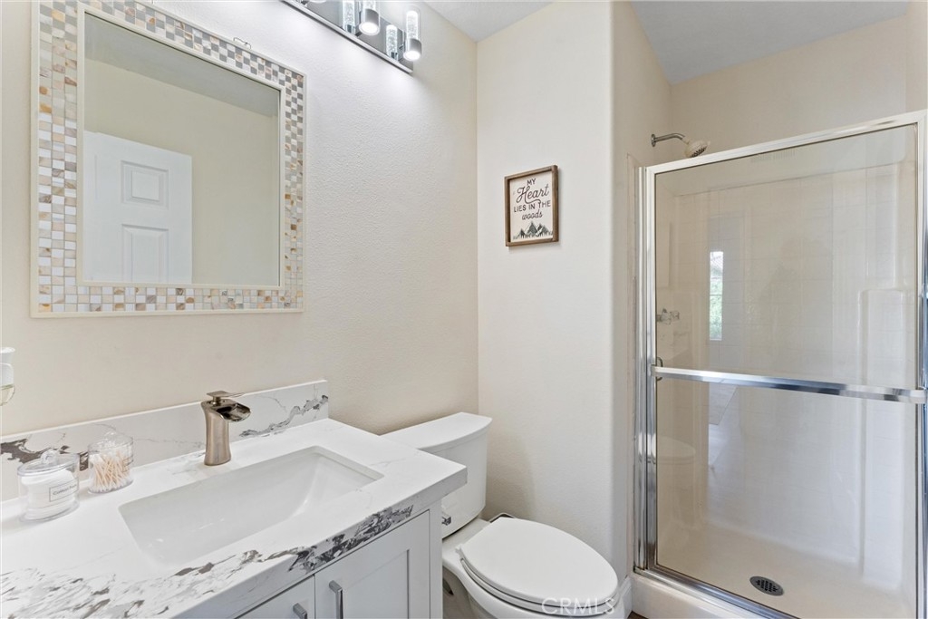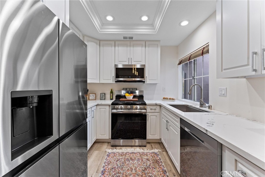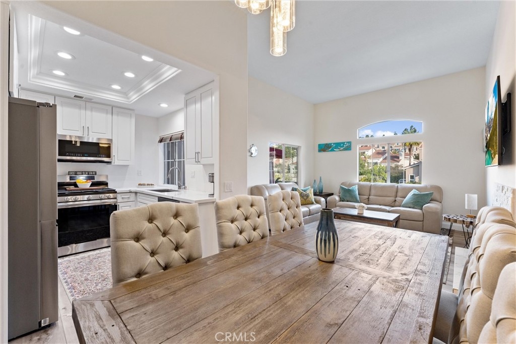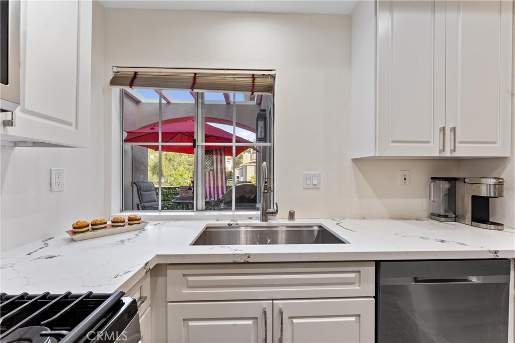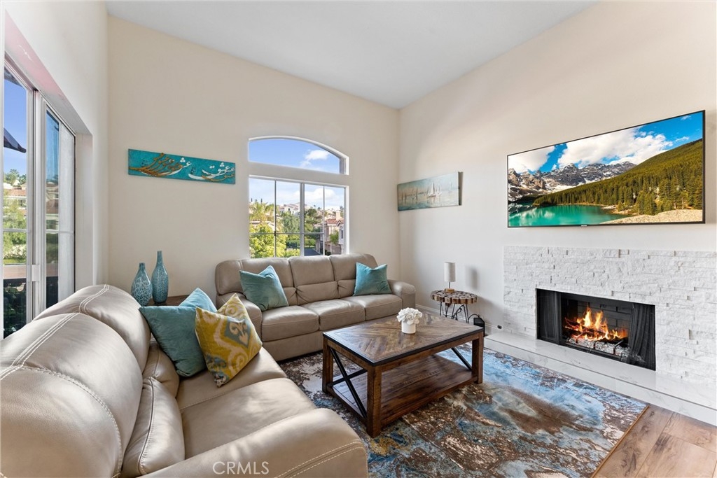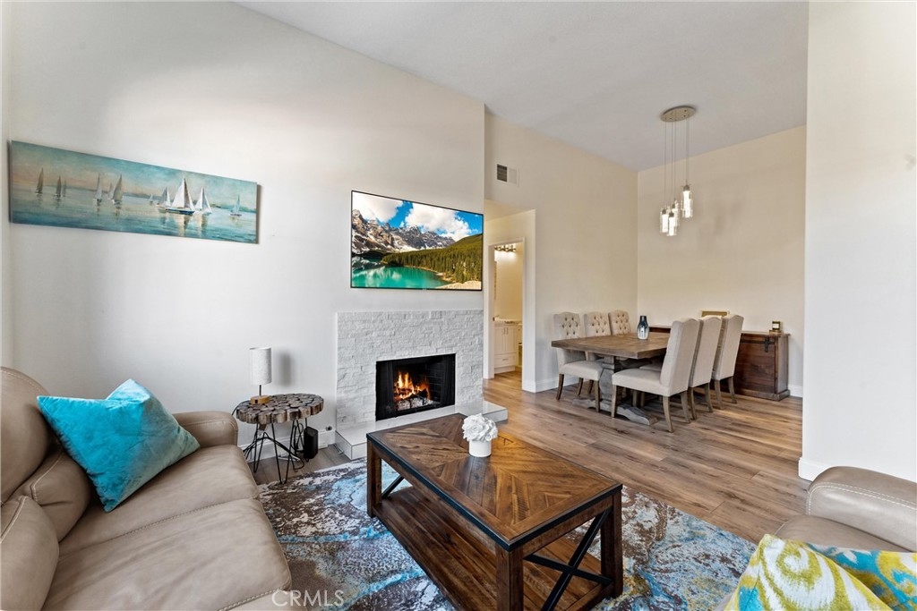 Beautifully remodeled 2 bedroom, 2 bathroom home with an open floorplan and plenty of light. Upon entry you will be entranced by the stacked stone fireplace with glass fire rocks. New wide plank laminate flooring throughout this modern charming home. The kitchen has been remodeled with Quartz counters, new white, soft close Shaker cabinets, stainless steel appliances and recessed lights. Large primary suite has views of the Laguna Niguel Regional Lake and dual closets. Primary bathroom has been tastefully upgraded with a gorgeous Quartz walk-in shower and Quartz vanity. Secondary bedroom with mirrored closet doors. The secondary bathroom has been updated with a Quartz vanity and new cabinetry. Detached garage and purchase pass for an additional space. Desirable Costa Brava community of Rancho Niguel offers pool/spa, play area for kids and is perfectly located for commuter or outdoor enthusiast. The lake and many nearby trails for walking, biking and many hiking areas too. Located near shopping, dining and entertainment areas and are a short distance to the beach. Optional membership in Rancho Niguel Recreation Club. Amenities include racquetball, pickleball, basketball, volleyball, tennis courts, playground, soccer field, gym and exercise room.