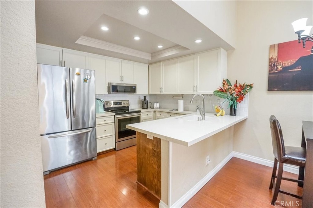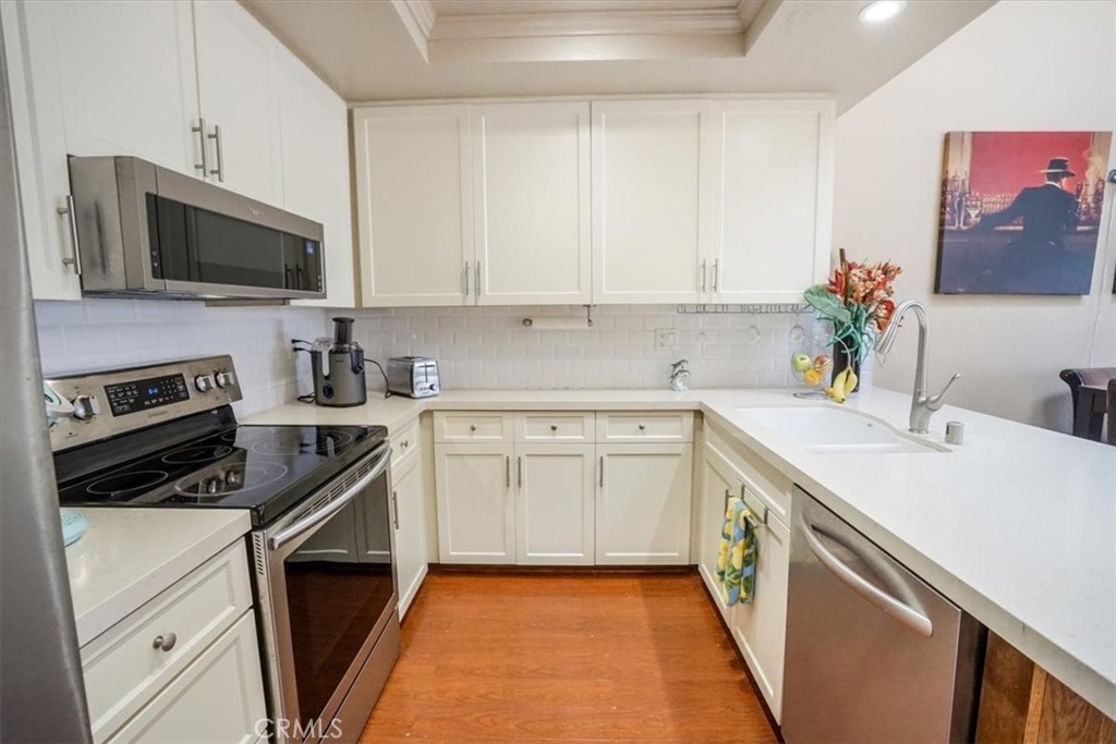Welcome to your gem home in Laguna Niguel featuring HIGH VAULTED ceilings, open floor plan, updated kitchen with two bedrooms, and two full bathrooms. Quietly nestled in the back of the track, this end unit is up one flight of steps with no one above you. The entry welcomes all with a spacious living area, updated fireplace, eating area and updated kitchen. The kitchen features white cabinetry, quartz countertops, and a timeless subway tile backsplash. All this topped off with stainless-steel appliances, plus the included refrigerator. Added features include spacious bedrooms with high ceilings, added light fixtures in the closets, an in-unit washer and dryer, also included, and parking for two cars with one being an assigned coveted end spot carport with storage! You are close to one of the two swimming pools, but not so close that you hear them. Quick access to the back parking for friends and family. Mere steps away from the "Bluff Trail" for fun hikes and all the open space behind the track. Crystal Cay boasts amenities including a dog park, two pools and spas, greenbelts and walking paths, and trash collection is included with your HOA dues. The beach is a short drive away along with the Mission Viejo Mall for shopping and dining. Easy access to the 5 freeway and 73 Toll Road. Come see your new home today!