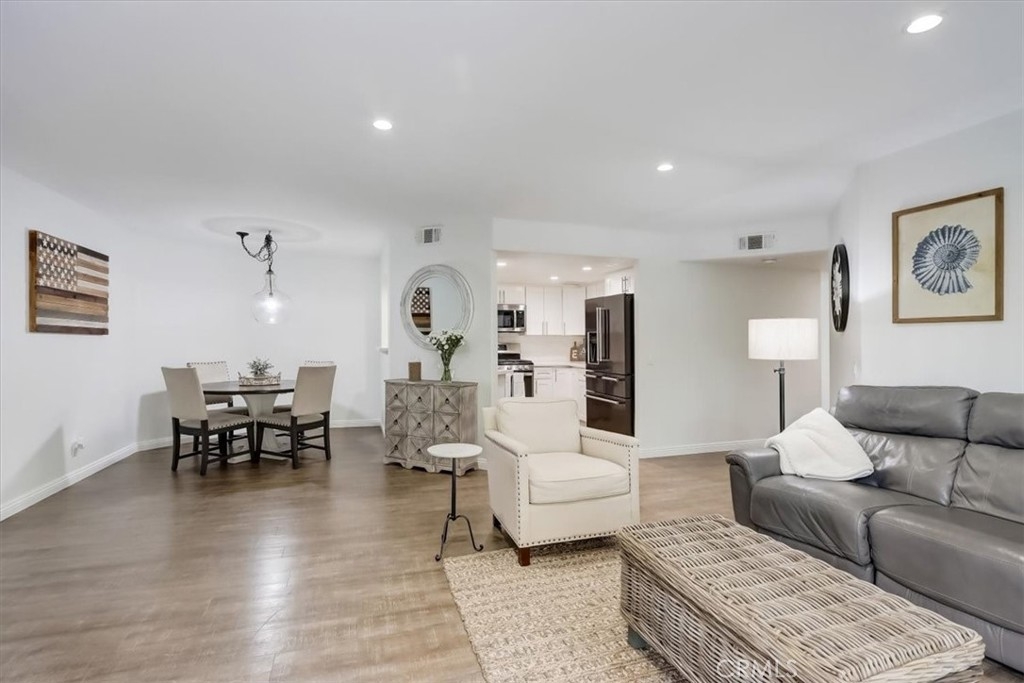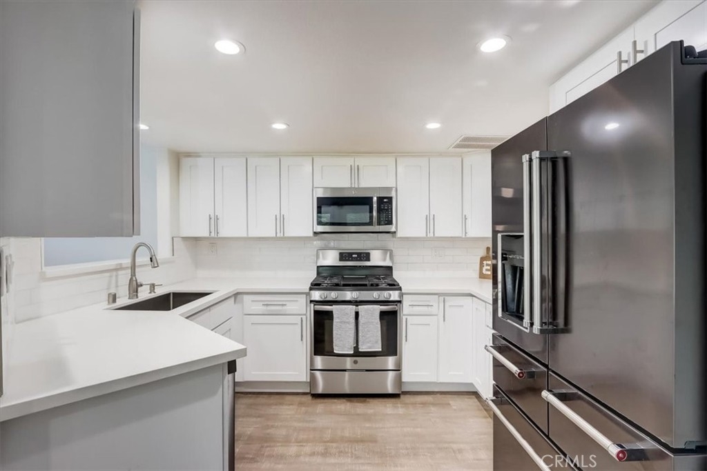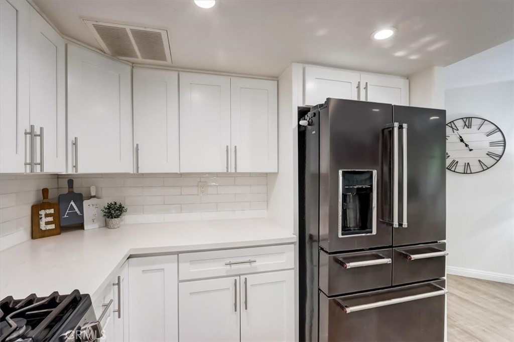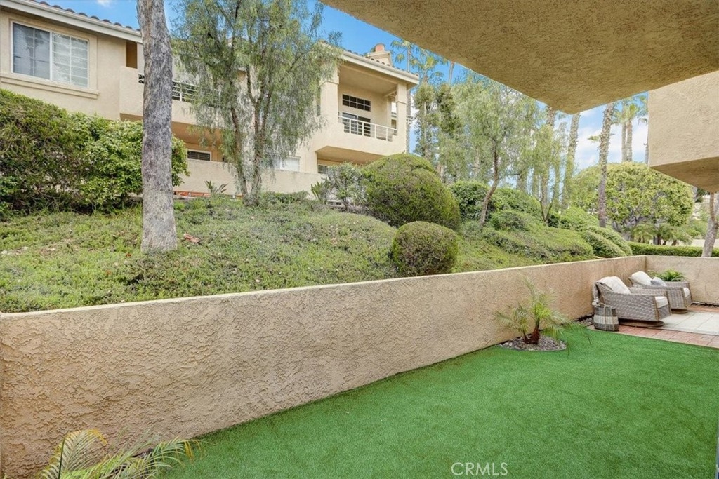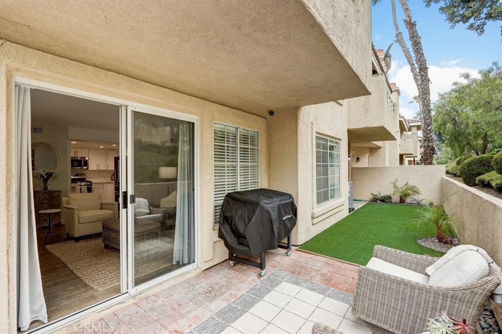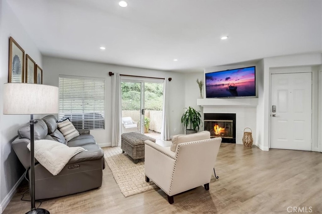 Beautifully remodeled, this Del Prado condo is truly turnkey! Warm vinyl wood floors, recessed lighting and custom finishes throughout complement the bright and open floorplan. Enter into the inviting living room featuring a cozy fireplace and sliding doors to the back patio that seamlessly flows to the dining area and to the kitchen. The kitchen is upgraded with fresh white cabinets, quartz counters, subway tile backsplash and stainless steel appliances. Down the hall, the primary bedroom offers light-catching sliding doors to the back patio and an en-suite primary bathroom with a quartz topped vanity with dual sinks and a walk-in shower with decorative tile. The secondary bedroom is generously sized, features a shiplap wall and is adjacent to the full hall bathroom. Additional features include a brand new HVAC, newer water heater and direct-access to the two-car garage with convenient laundry hook ups. Relax in the spacious back patio featuring low-maintenance artificial grass. Enjoy the nearby community pool, spa and playground. Located near shopping and dining options, easy freeway and toll road access and award-winning schools!