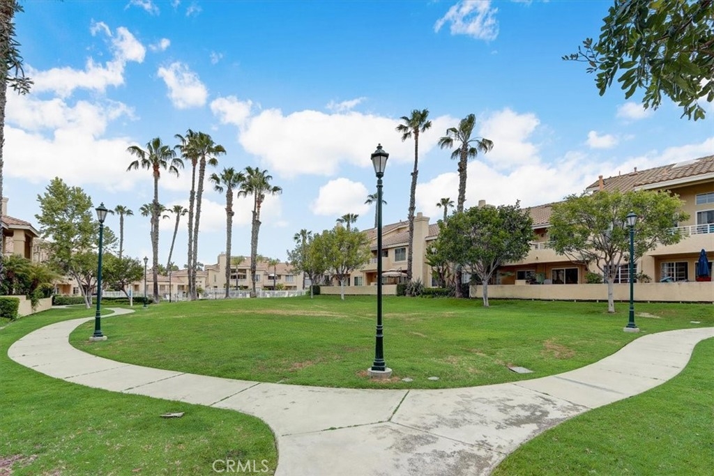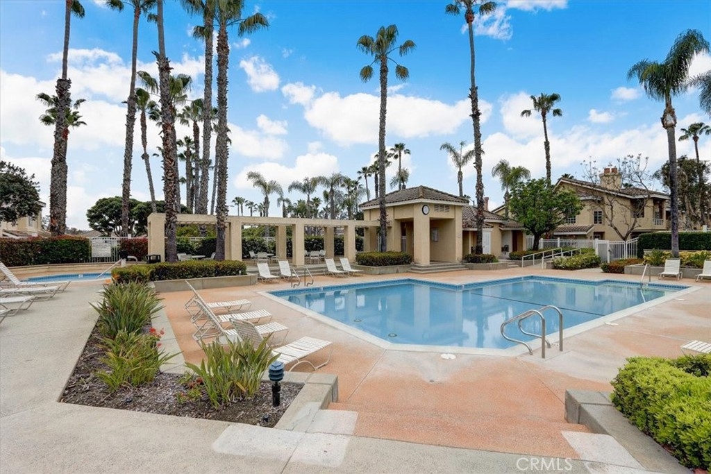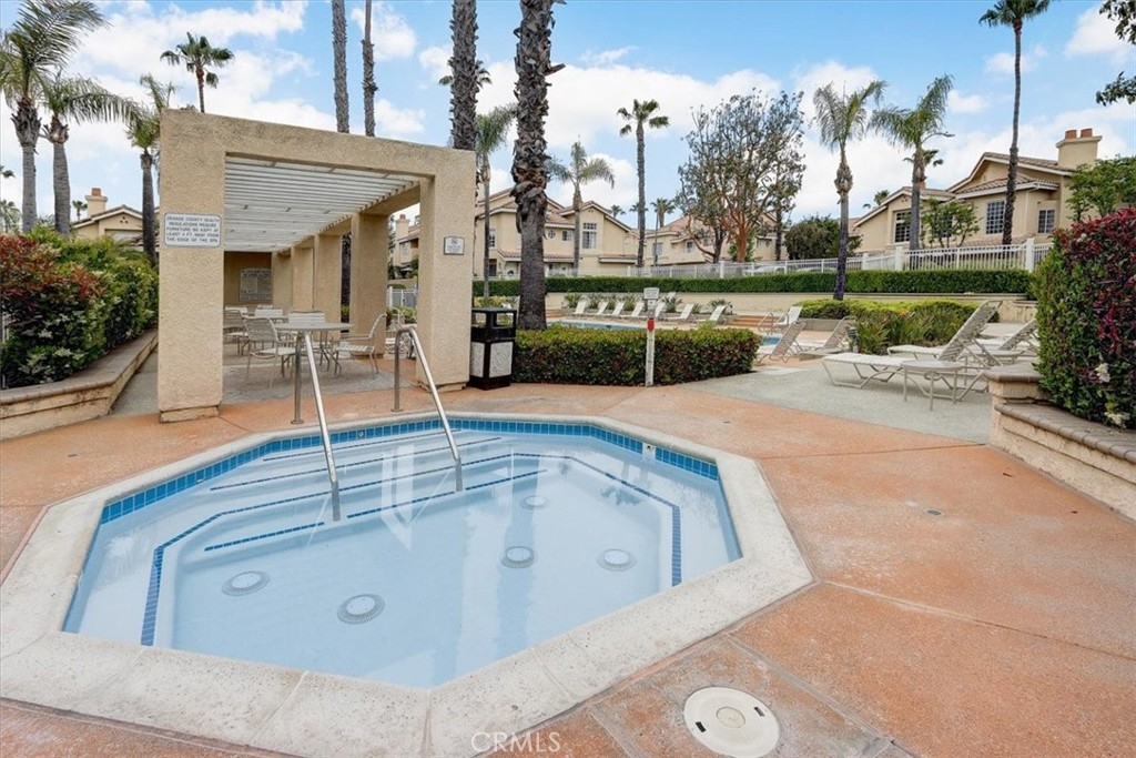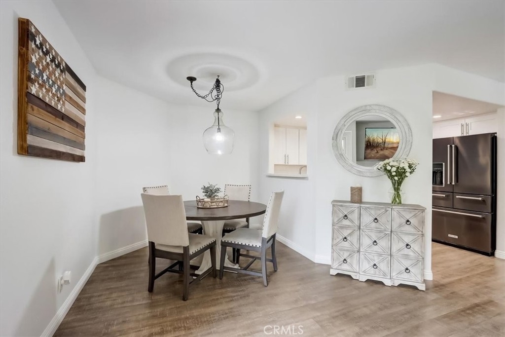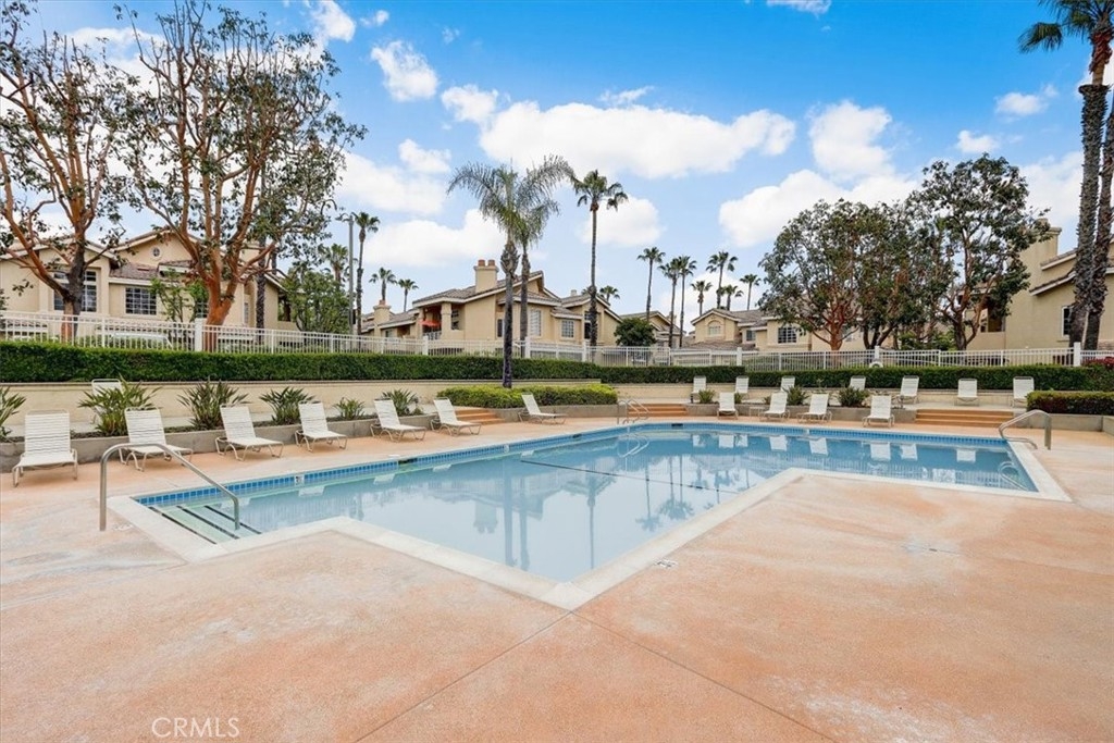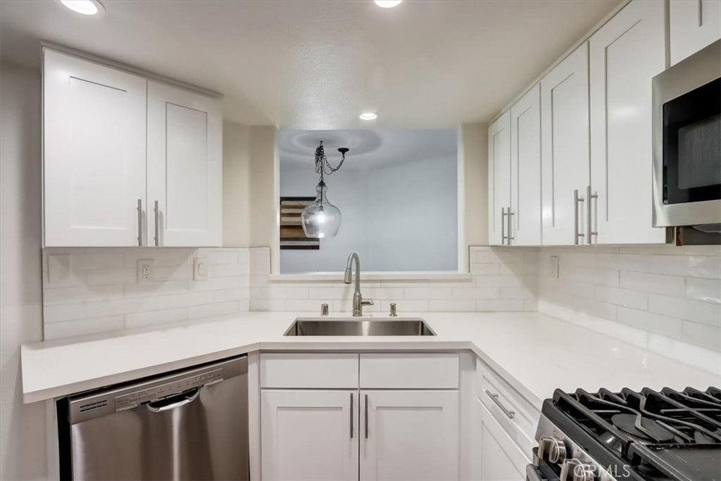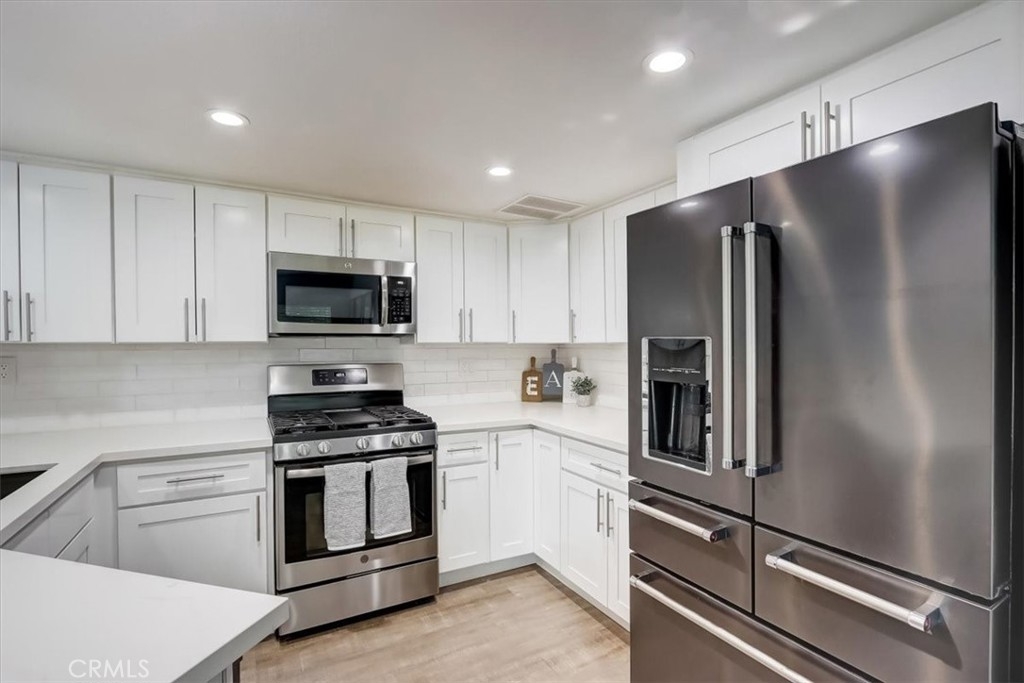 Beautifully remodeled, this Del Prado condo is truly turnkey! Warm vinyl wood floors, recessed lighting and custom finishes throughout complement the bright and open floorplan. Enter into the inviting living room featuring a cozy fireplace and sliding doors to the back patio that seamlessly flows to the dining area and to the kitchen. The kitchen is upgraded with fresh white cabinets, quartz counters, subway tile backsplash and stainless steel appliances. Down the hall, the primary bedroom offers light-catching sliding doors to the back patio and an en-suite primary bathroom with a quartz topped vanity with dual sinks and a walk-in shower with decorative tile. The secondary bedroom is generously sized, features a shiplap wall and is adjacent to the full hall bathroom. Additional features include a brand new HVAC, newer water heater and direct-access to the two-car garage with convenient laundry hook ups. Relax in the spacious back patio featuring low-maintenance artificial grass. Enjoy the nearby community pool, spa and playground. Located near shopping and dining options, easy freeway and toll road access and award-winning schools!