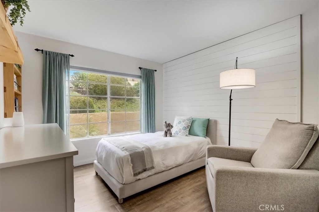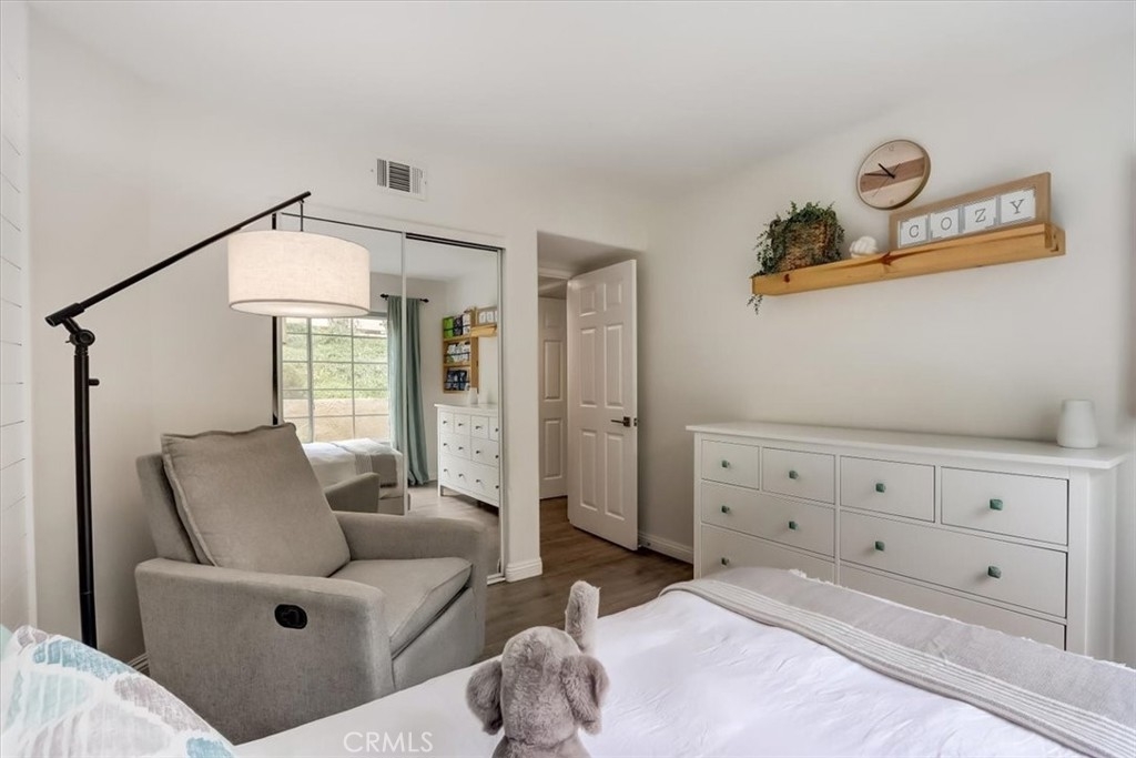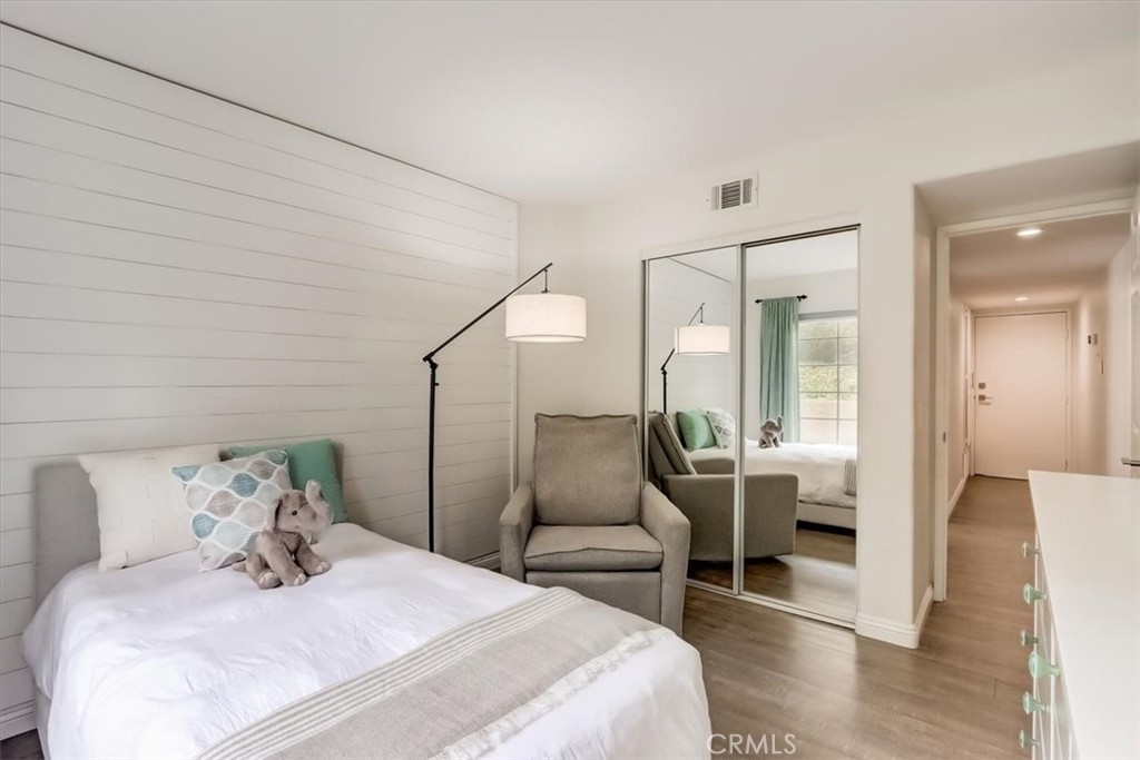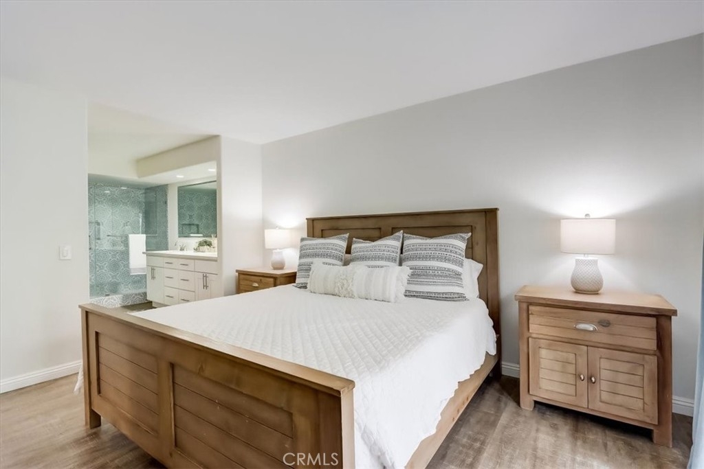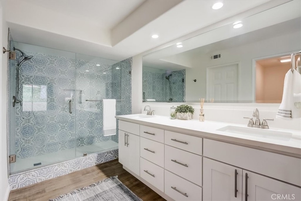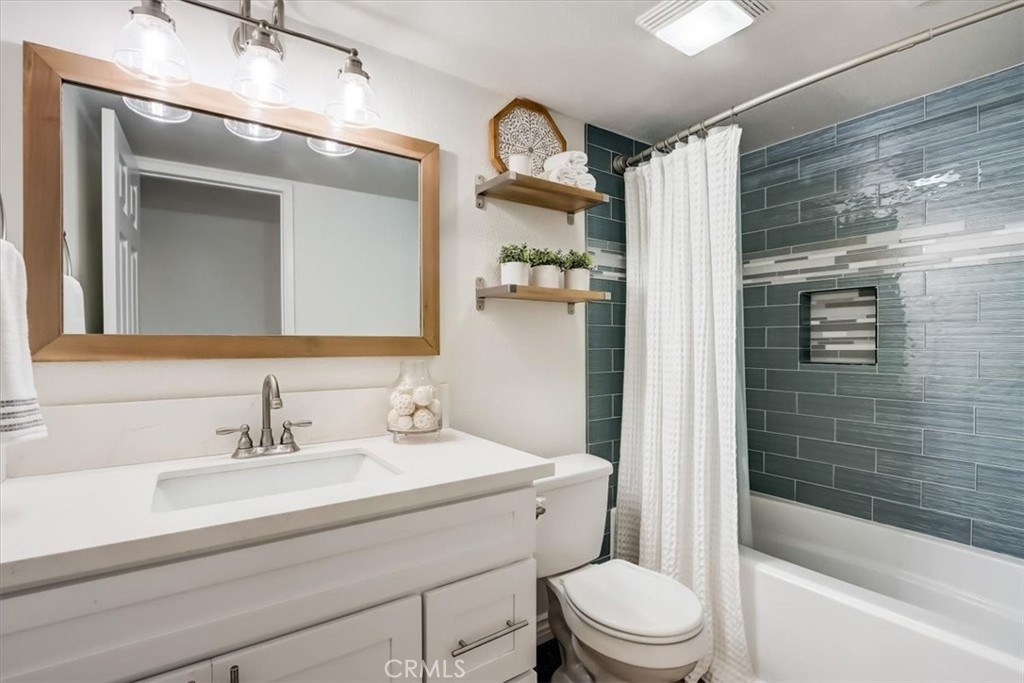 Beautifully remodeled, this Del Prado condo is truly turnkey! Warm vinyl wood floors, recessed lighting and custom finishes throughout complement the bright and open floorplan. Enter into the inviting living room featuring a cozy fireplace and sliding doors to the back patio that seamlessly flows to the dining area and to the kitchen. The kitchen is upgraded with fresh white cabinets, quartz counters, subway tile backsplash and stainless steel appliances. Down the hall, the primary bedroom offers light-catching sliding doors to the back patio and an en-suite primary bathroom with a quartz topped vanity with dual sinks and a walk-in shower with decorative tile. The secondary bedroom is generously sized, features a shiplap wall and is adjacent to the full hall bathroom. Additional features include a brand new HVAC, newer water heater and direct-access to the two-car garage with convenient laundry hook ups. Relax in the spacious back patio featuring low-maintenance artificial grass. Enjoy the nearby community pool, spa and playground. Located near shopping and dining options, easy freeway and toll road access and award-winning schools!