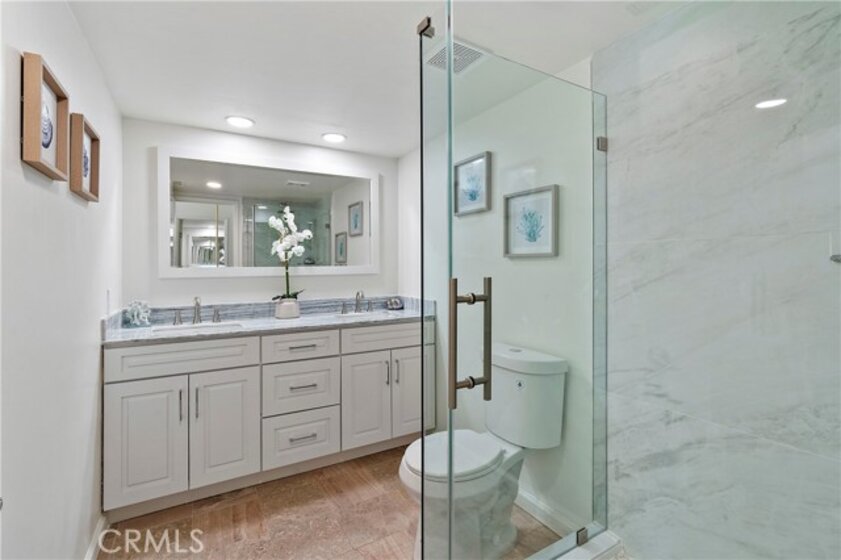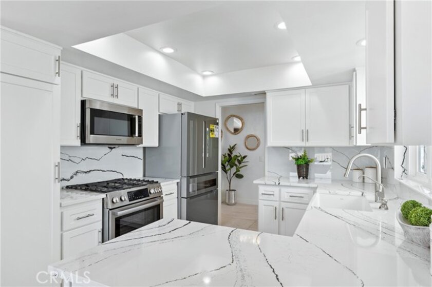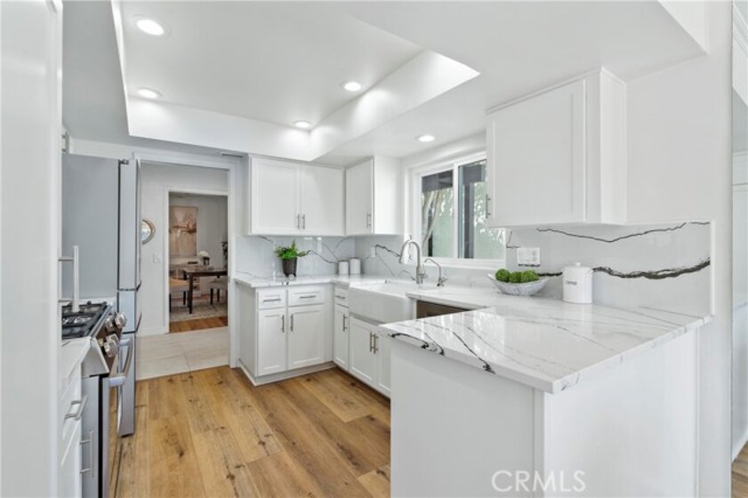 Welcome to this beautifully renovated, single-level townhome in the highly desirable El Niguel Terrace community of Laguna Niguel. Offering 4 bedrooms and 2.5 bathrooms, this move-in ready residence showcases a bright, open-concept layout paired with modern, thoughtfully curated finishes throughout. The heart of the home is a stunning, chef-inspired kitchen featuring quartz countertops, Bosch appliances, a farmhouse sink, gas range, built-in microwave, soft-close cabinetry, and generous pantry storage—perfect for both everyday living and effortless entertaining. It has a breakfast bar and opens to the dining area. The spacious living room is warm and inviting, complete with a cozy fireplace. Brand new French doors from both the dining area and the living room open to a private backyard, creating a seamless indoor-outdoor flow ideal for dining, relaxing, or enjoying the coastal sunshine. The primary suite serves as a peaceful retreat featuring wall-to wall closets with mirrored doors. There are 3 additional bedrooms and 2 bathrooms. The fully renovated primary bathroom offers a 2-sink vanity and a custom designed shower stall. The French Doors along with the sliding door in the primary suite open to the patio, providing unobstructed views of the Saddle Back hill tops in the distance. The patio is perfect for coffee in the morning or unwinding in the evening. Additional highlights include luxury vinyl plank and tile flooring, dual-pane windows, custom made front door, central A/C, and a 2-car garage with laundry hookups and extra storage. Fashionable modern light fixtures have been installed at the entry & over the dining table. The entry also boasts a covered pergola along the side of the house to the entrance to welcome visitors. Residents of El Niguel Terrace enjoy access to a community pool and scenic walking trails, all while being just minutes from Salt Creek Beach, El Niguel Golf Course, Laguna Niguel Regional Park, and Laguna Coast Wilderness Park. Shopping, dining, and some of Southern California’s best beaches are all within close reach. Nearby, "The Cove at El Niguel"—a proposed 22-residence townhome development—adds future appeal and interest to the area. Offering a rare blend of privacy, comfort, and prime coastal proximity, this home truly captures the best of Laguna Niguel living.