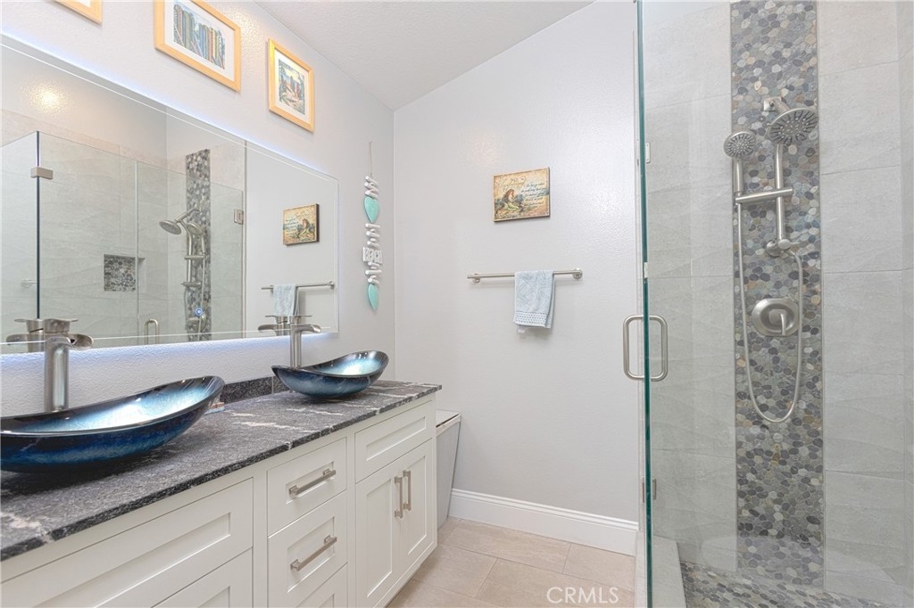 Nestled in the Heart of Laguna Niguel, you will find peace and serenity in the highly sought after and ocean close community of Encore in Marina Hills. The Jewel of Laguna Niguel! Owner has spared no expense and completely remodeled the home! New Mohawk vinyl plank flooring installed throughout the home, complemented by newer Milgard windows that enhance both energy efficiency and aesthetic appeal. The kitchen has recently been remodeled with new pure Quartz Tahoe Blue countertops & reverse osmosis water filtration. Kitchen also features a metal graphite farm sink paired with a modern touchless faucet, combining style with convenience. Both bathrooms have been tastefully remodeled, featuring new vanities, granite countertops, dual sinks and beautifully updated stonework in the showers. All soft close drawers and cabinets. This home also features recessed lighting with LED lights and all electrical for the tv's has been tucked into the wall. Oversized 2 car garage with shelving and epoxy flooring! This property features one of the largest driveways in the community, perfect for accommodating family gatherings and guest parking! The Marina Hills Community clubhouse offers a full-kitchen and fireplace adjacent to the pool area, a 75 ft. Junior Olympic size swimming pool, wader pool, spa, showers and restrooms. There are barbeque areas, 6 tennis courts and pickleball courts. A walking path off Parc Vista leads down to Salt Creek Trail by which you can walk all the way to Salt Creek Beach. Marina Hills Park has soccer fields, basketball courts, bocce ball courts, picnic tables and a play structure. Conveniently located near shopping, dining, hiking and biking trails, public and private schools, local beaches and the harbor.