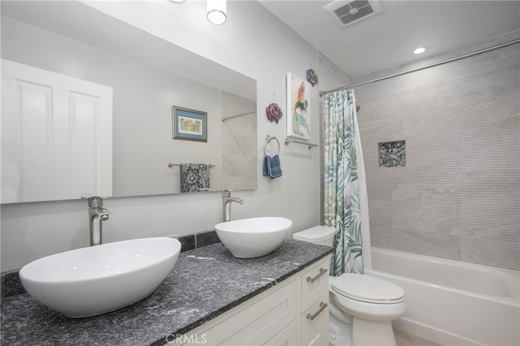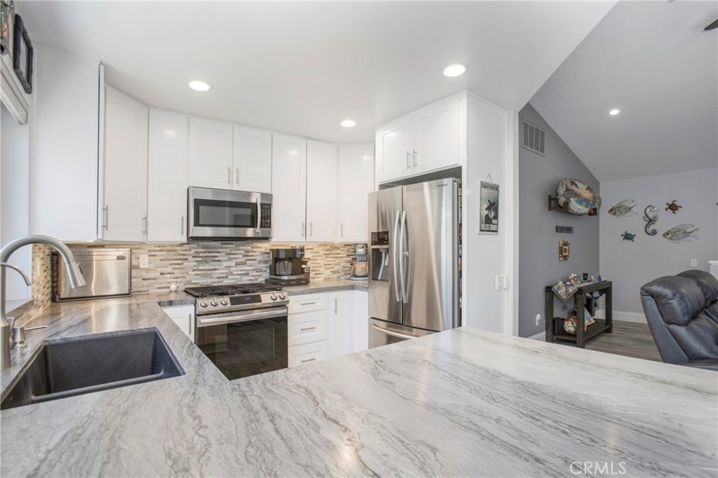 Nestled in the Heart of Laguna Niguel, you will find peace and serenity in the highly sought after and ocean close community of Encore in Marina Hills. The Jewel of Laguna Niguel! Owner has spared no expense and completely remodeled the home! New Mohawk vinyl plank flooring installed throughout the home, complemented by newer Milgard windows that enhance both energy efficiency and aesthetic appeal. The kitchen has recently been remodeled with new pure Quartz Tahoe Blue countertops & reverse osmosis water filtration. Kitchen also features a metal graphite farm sink paired with a modern touchless faucet, combining style with convenience. Both bathrooms have been tastefully remodeled, featuring new vanities, granite countertops, dual sinks and beautifully updated stonework in the showers. All soft close drawers and cabinets. This home also features recessed lighting with LED lights and all electrical for the tv's has been tucked into the wall. Oversized 2 car garage with shelving and epoxy flooring! This property features one of the largest driveways in the community, perfect for accommodating family gatherings and guest parking! The Marina Hills Community clubhouse offers a full-kitchen and fireplace adjacent to the pool area, a 75 ft. Junior Olympic size swimming pool, wader pool, spa, showers and restrooms. There are barbeque areas, 6 tennis courts and pickleball courts. A walking path off Parc Vista leads down to Salt Creek Trail by which you can walk all the way to Salt Creek Beach. Marina Hills Park has soccer fields, basketball courts, bocce ball courts, picnic tables and a play structure. Conveniently located near shopping, dining, hiking and biking trails, public and private schools, local beaches and the harbor.