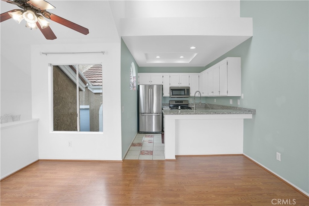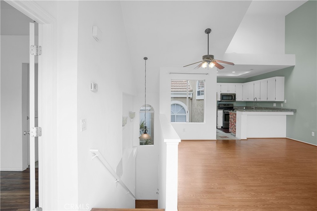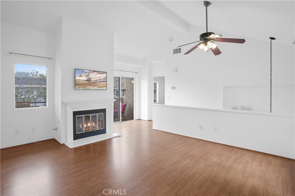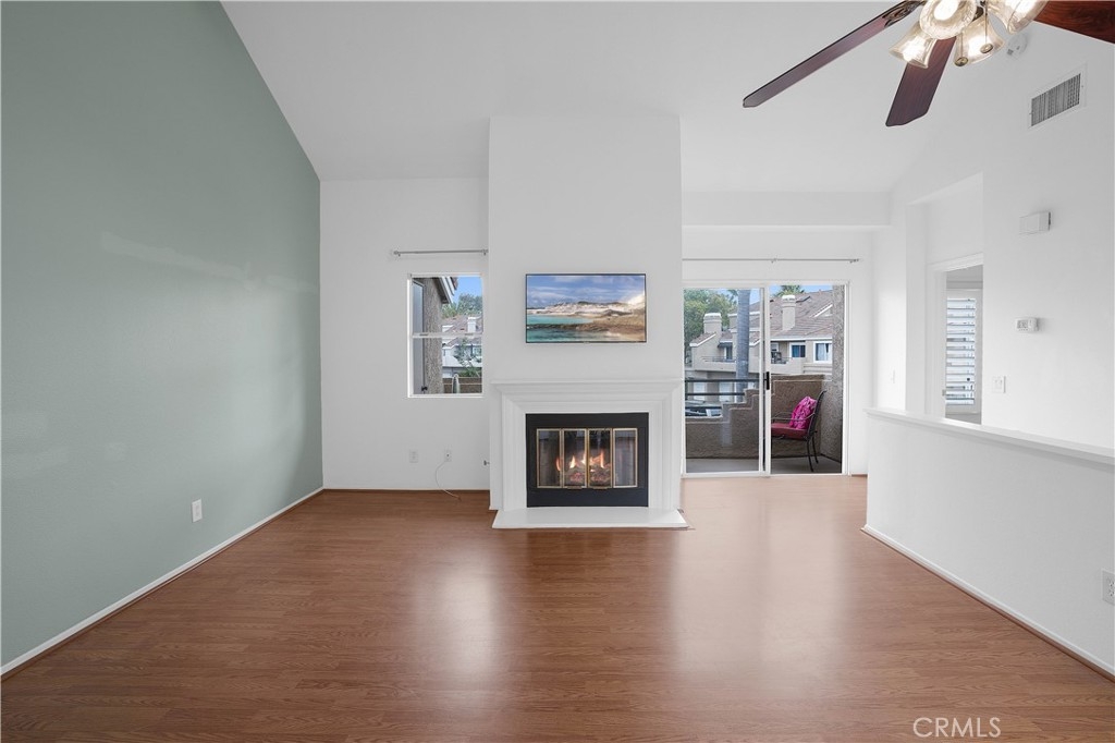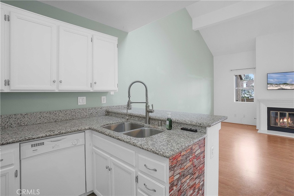 Fabulous one-bedroom + one-bathroom townhome ( no one above or below)located in the Expressions community of Laguna Niguel. Lite & Brite open floorplan with high ceilings. New paint. The kitchen has a granite breakfast bar open to the Living room, a Nuvia water filter, a fireplace in the living room, and access to the balcony. Laminate wood flooring is on the stairs, living room, and bedroom. A newer AC unit and garage door. Garage steps from the front door. The sizeable primary bedroom has plantation shutters, and the primary bathroom has an inside stackable washer/dryer closet, a newer granite bathroom countertop, new sinks, and a shower faucet. A one-car garage is next to the unit. The entire complex has been repiped, the roofs replaced, and the exterior painted. The association's dues cover water and trash. There is a resort-style pool and spa in the complex.
