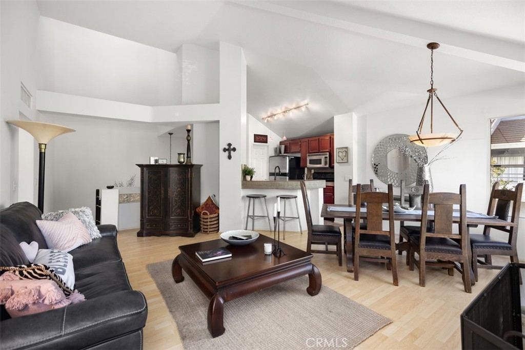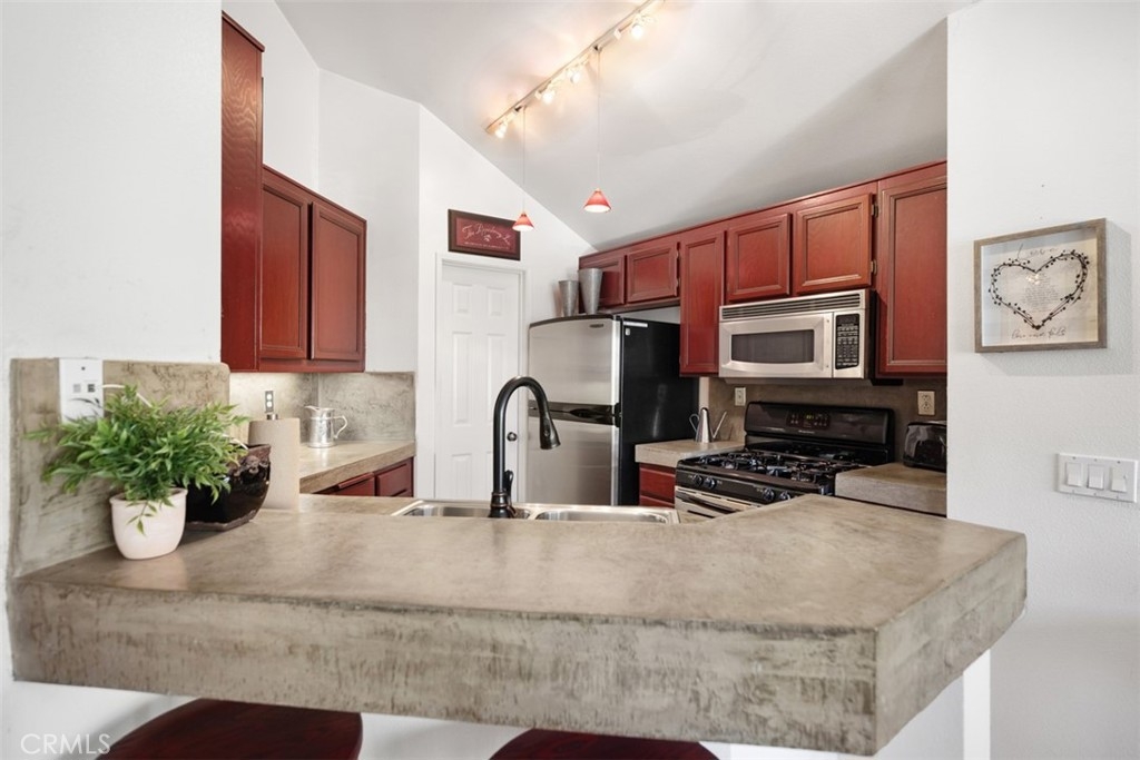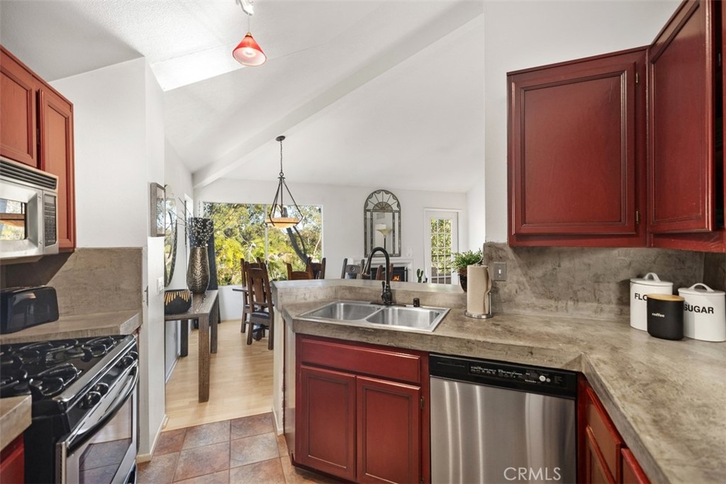 Priced to sell! This beautiful 2 bed 2 bath carriage unit in Expressions Tract at Rancho Niguel. Step into the bright living area. Living area has vaulted ceilings, laminated flooring and cozy gas fireplace. There is access to a private balcony off the living area and with a lovely view of trees and green area. The kitchen has cement countertops, tract lighting, large pantry, stainless steel sink, stove, microwave and dishwasher. Linen cabinet in hallway, great for storage. Washer dryer area w/doors and shelf for storage. Both bedrooms are light and bright. Master bath has walk in closet and shower/tub combo. Downstairs the 1 car garage is attached, providing easy access with groceries or shopping bags. Close to shopping, schools and entertainment. A must see!!