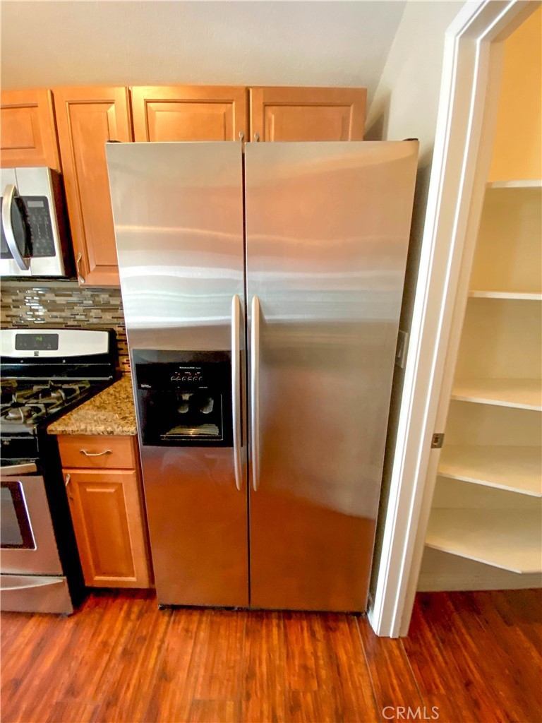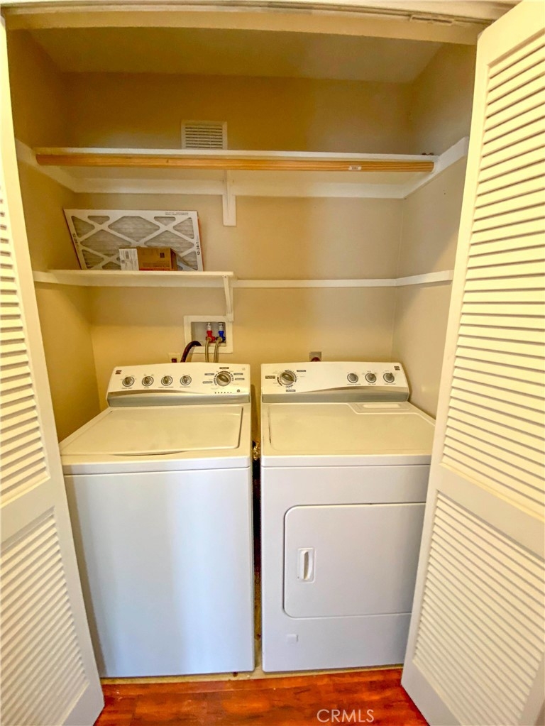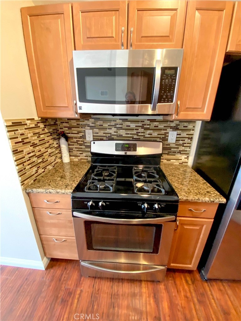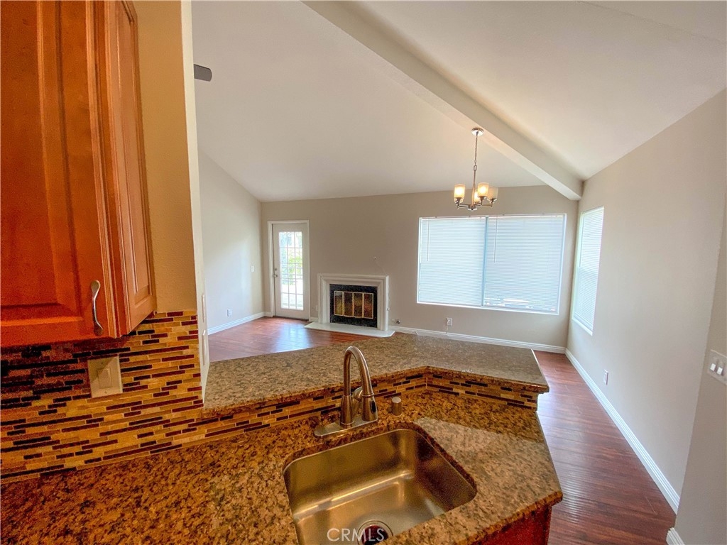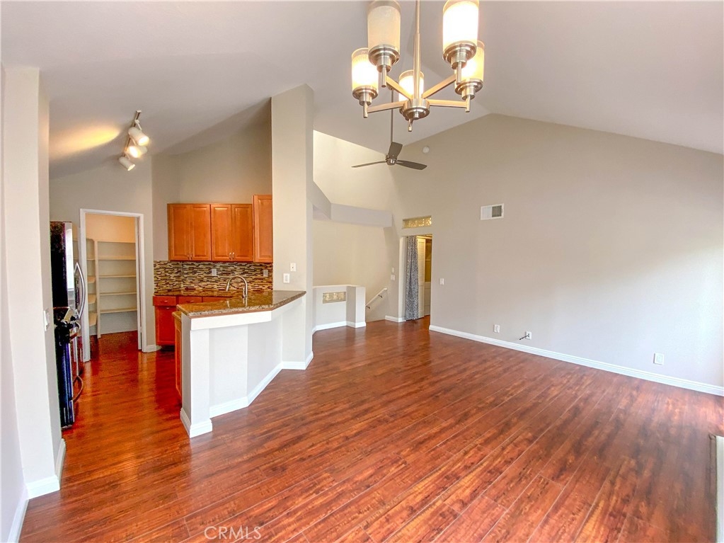 Exceptional upper level end unit with 2 bedrooms, 2 baths and direct access garage, located in the Seabreeze tract of the Expressions at Rancho Niguel community of Laguna Niguel. Great location near shopping, restaurants, and quick access to the 73 and the 5 freeways. Upper level unit is situated in the trees and has expansive views. Vaulted ceilings expand the interior space throughout. Renovated kitchen with granite counter tops, glass tile back splash, stainless appliances and included stainless refrigerator. Large walk in pantry. Upgraded laminate plank flooring, ceiling fans and contemporary lighting. Updated bathrooms with newer cabinets, lighting and mirrors. Interior laundry with included washer dryer. 1 car attached garage with direct entry. Home has been re-piped. HOA amenities include beautiful pools and spas.