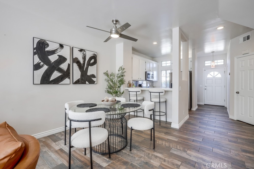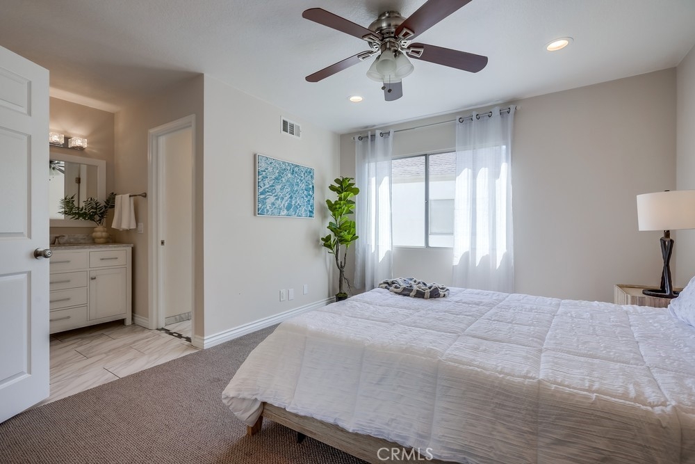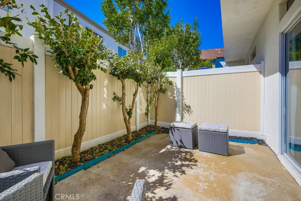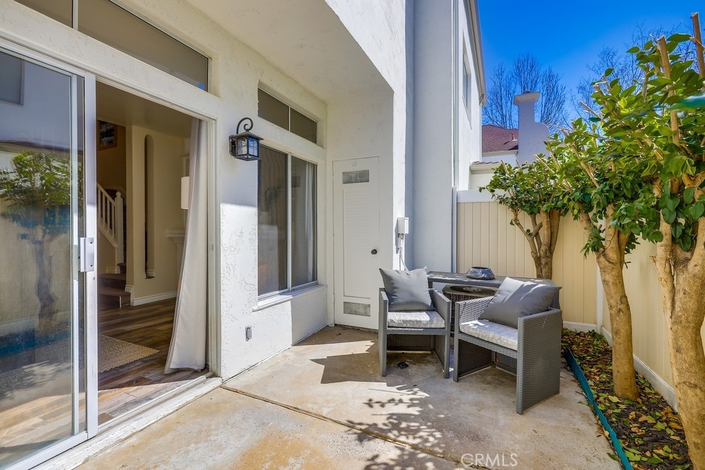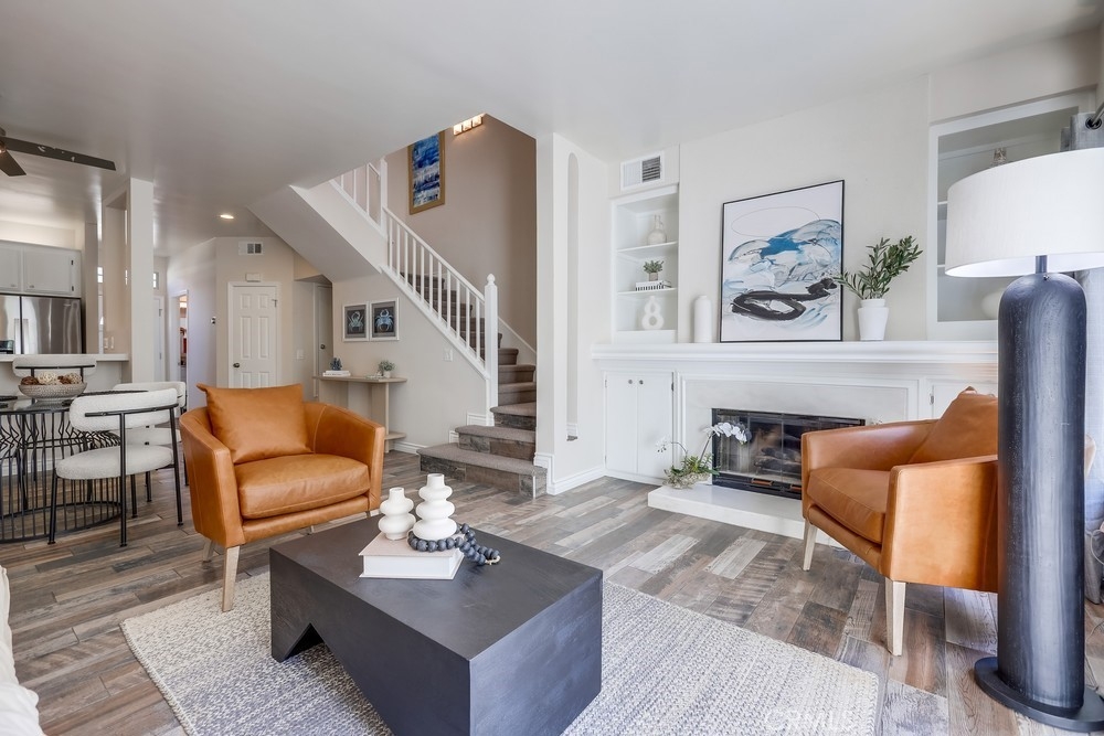 This spacious town-home in the highly sought-after Hampton Village offers 2 PRIMARY EN-SUITES with WALK -IN closets, along with 2.5 modern bathrooms, and attached garage. Enjoy the convenience of being minutes from beautiful beaches, major freeways, and nearby shopping centers for all your daily essentials. With approximately 1,200 square feet of thoughtfully designed space, this serene two-level town-home offers privacy with no neighbors above or below. This home and neighboring units with shared plumbing have been recently RE-PIPED, ensuring reliability. Throughout the residence you’ll find finishes such as plank-style ceramic flooring that mimics reclaimed wood, providing a timeless and durable aesthetic, as well as smooth finished walls. The kitchen is equipped with quartz countertops, stainless-steel appliances, including a brand new dishwasher, a convenient breakfast bar, and a separate dining area. The great room, offering direct access to a private, FULLY FENCED PATIO, features a cozy fireplace adorned with textured Venetian plaster and ample built-ins for storage. The updated bathrooms feature sleek cabinetry, stylish countertops, and custom subway tile accents. Additional features include ceiling fans, a main floor powder room, full-size washer and dryer within the home, and close access to community pool and spa. This gem of a community has been undergoing major renovations, updated community lighting and repaving will be completed soon.