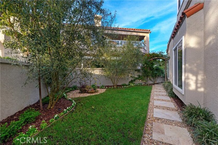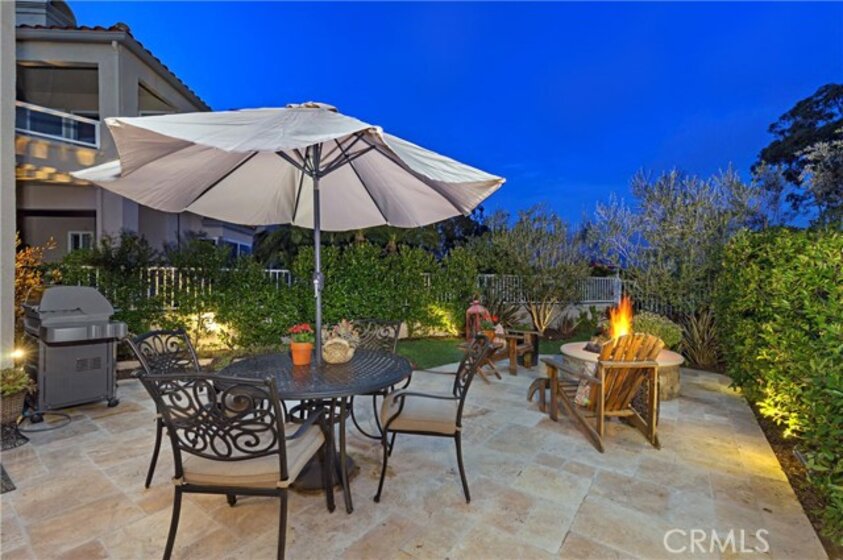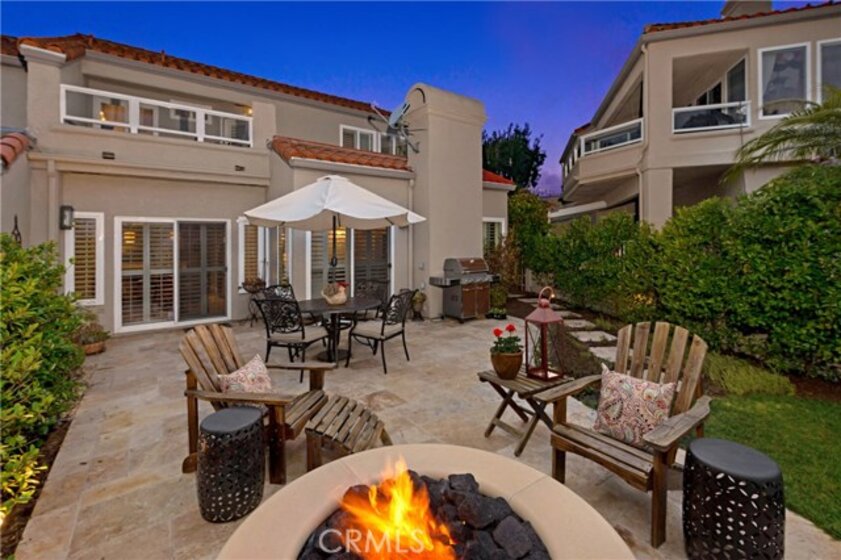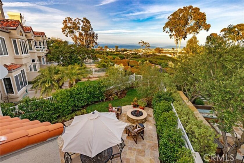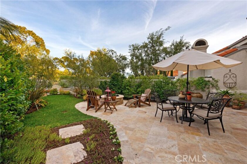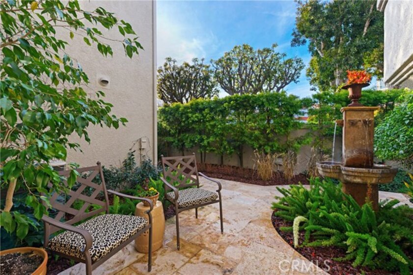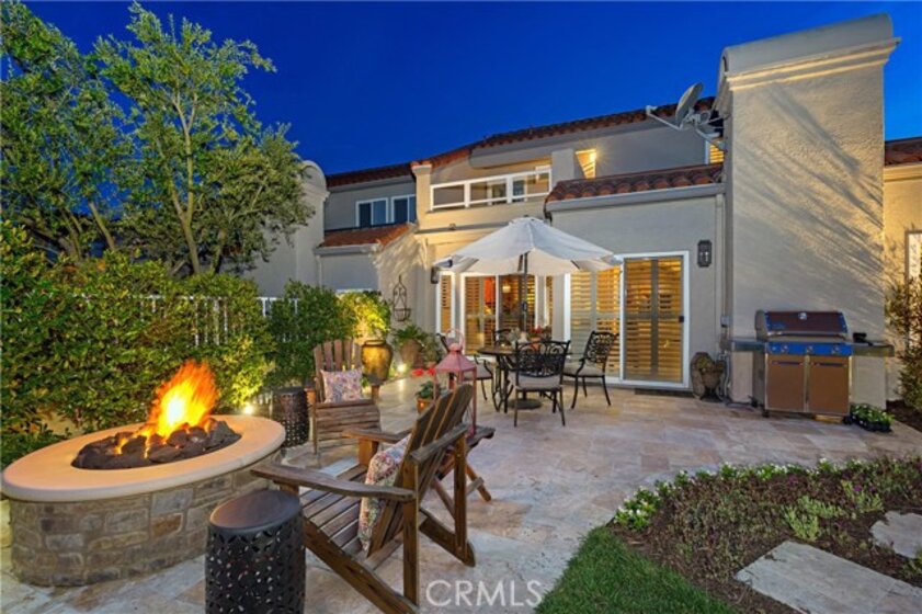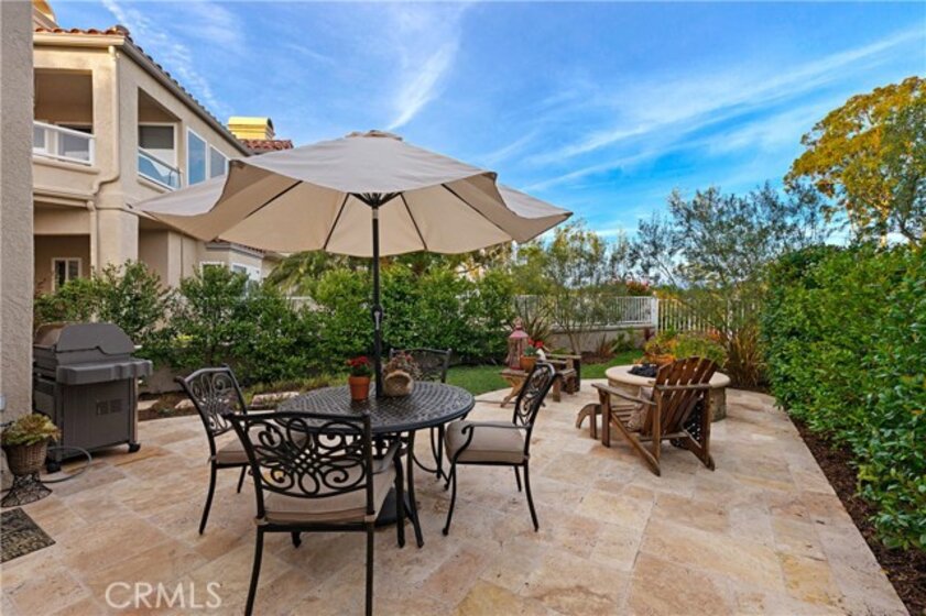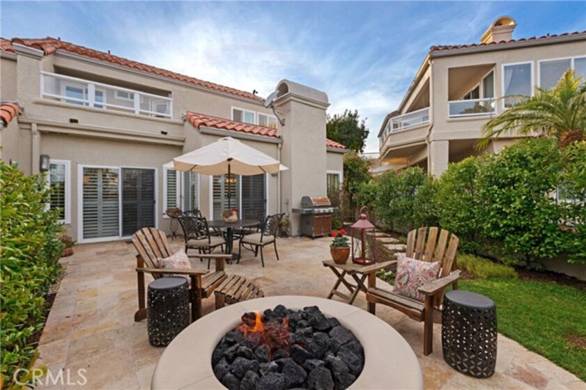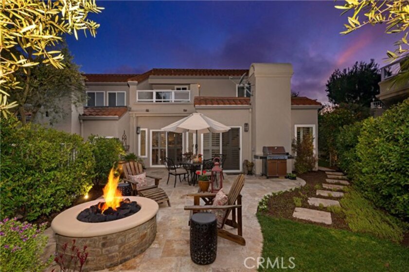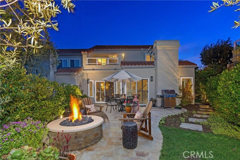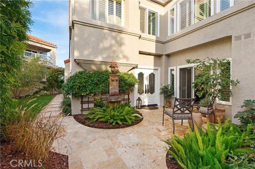 This elegant Laguna Sur property is uniquely located giving quiet privacy along with a spacious side yard and backyard to these 3 bedrooms 2 1/2 bath home. A travertine path leading to the iron gate into a quaint courtyard filled with the subtle sound of a bubbling Italian fountain. The leaded glass doors open to the bright open floor plan accented with expansive windows and volume ceilings. The spacious dining room is perfect for casual or formal entertaining for friends and family. Living room and breakfast nook open to the travertine patio and fire pit with a beautifully planted backyard accented with olive trees that surround the home. The remodeled kitchen includes stainless appliances quartz countertops and an L shaped counter with bars stools on one side. Plantation shutters and porcelain wood floors adorn the complete lower level and stairway. Finally, is the family room/den, a great place to relax and listen to the courtyard water feature. Master bedroom suite is a luxurious retreat with relaxing balcony and walk-in closet. Master bath has dual vanities, walk-in shower with new travertine tile, and freestanding tub. Completely reimagined and updated 2 years ago by the current owner the property exudes casual sophistication. THIS IS A VERY DOG FRIENDLY YARD FENCED AND PLENTY OF SPACE.