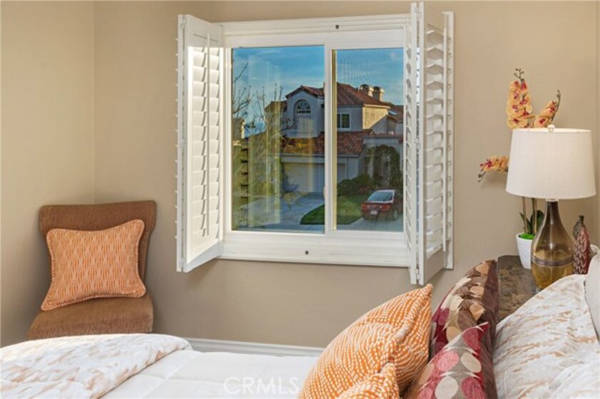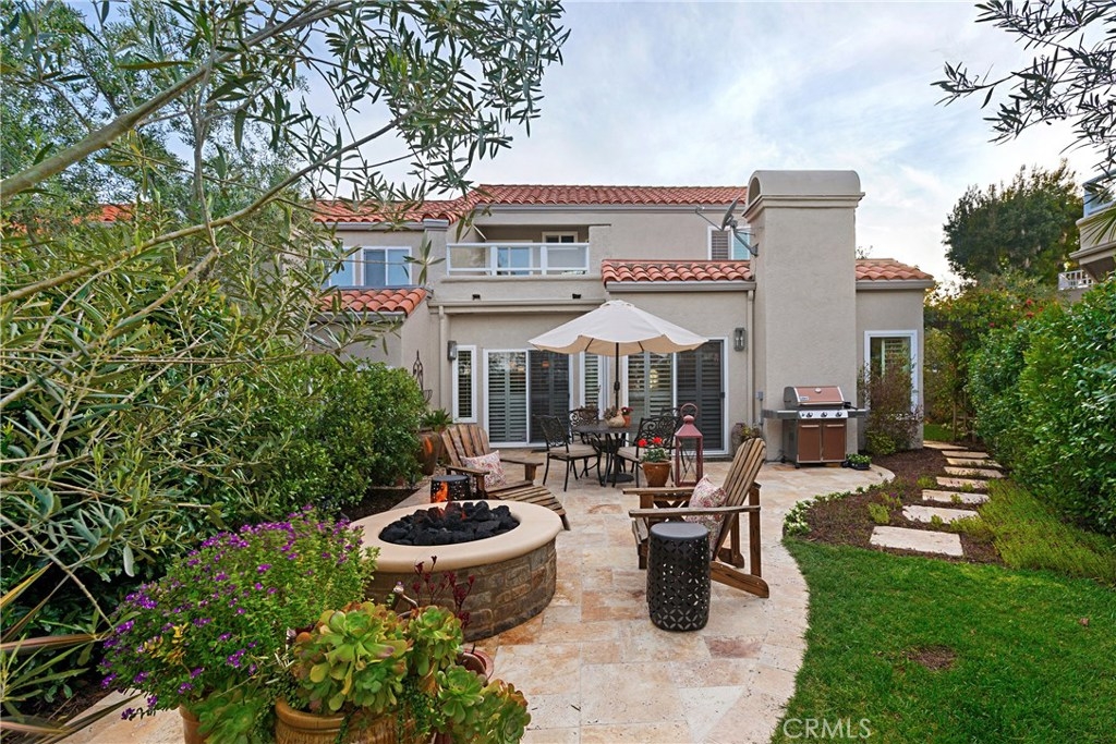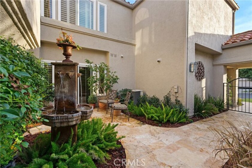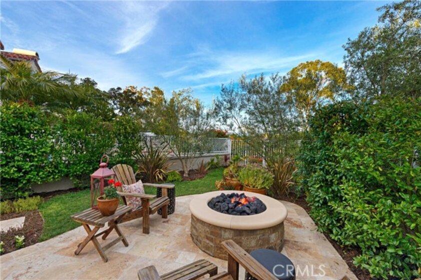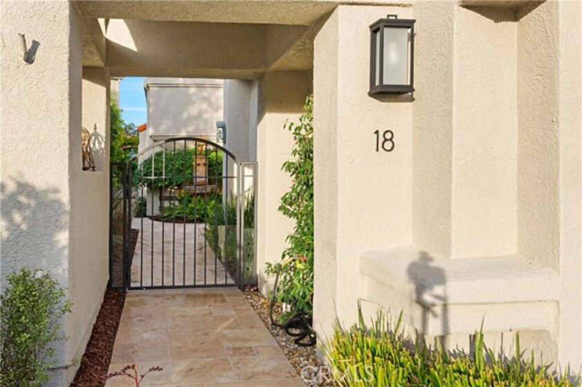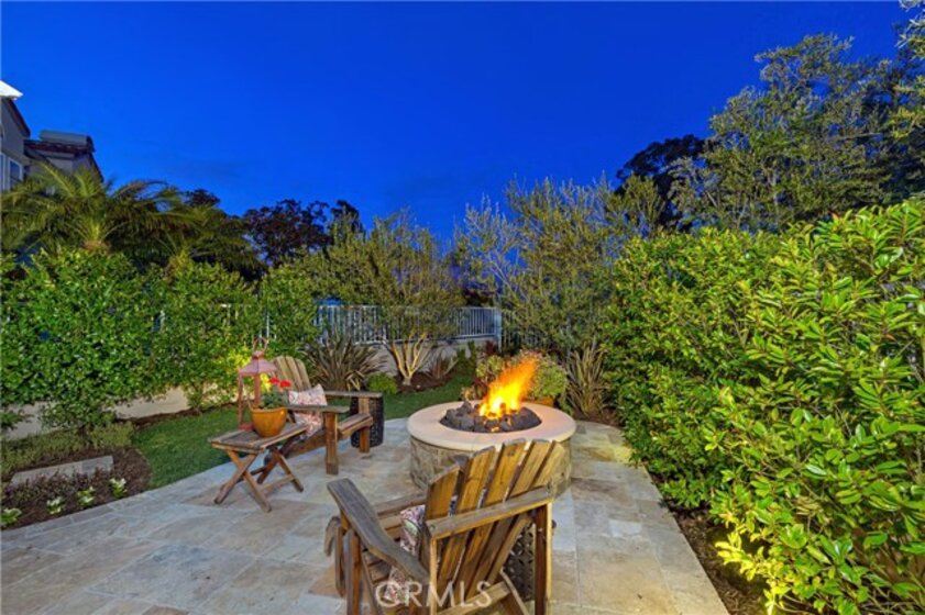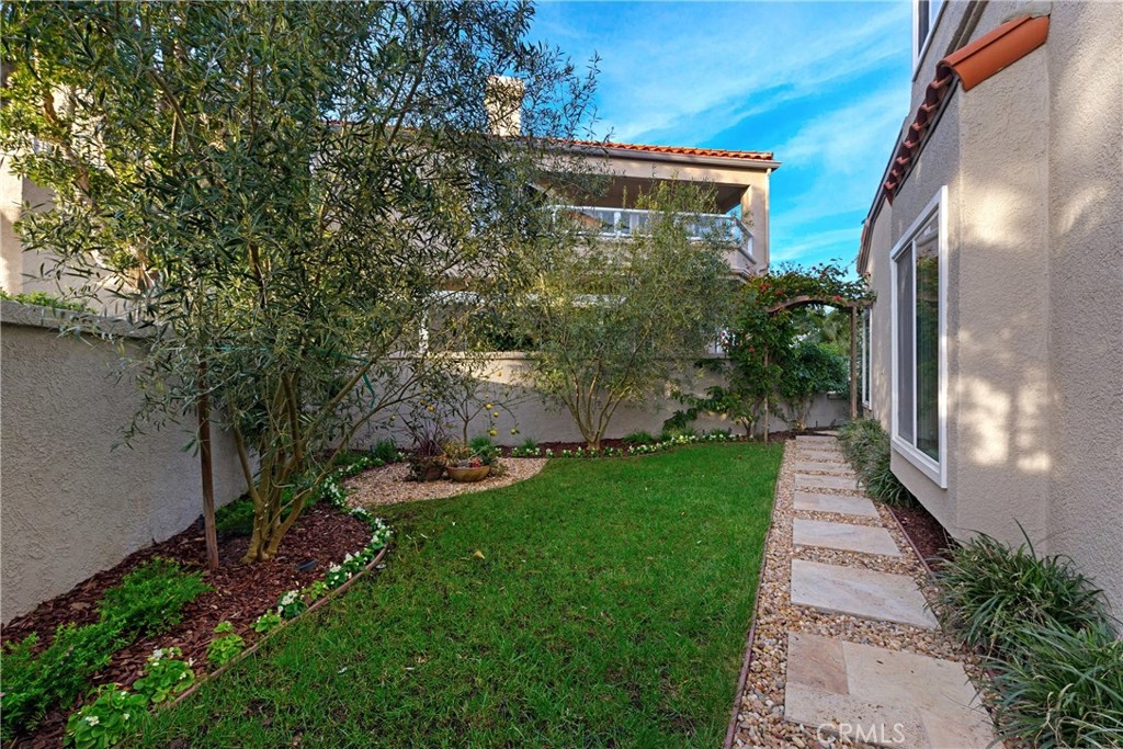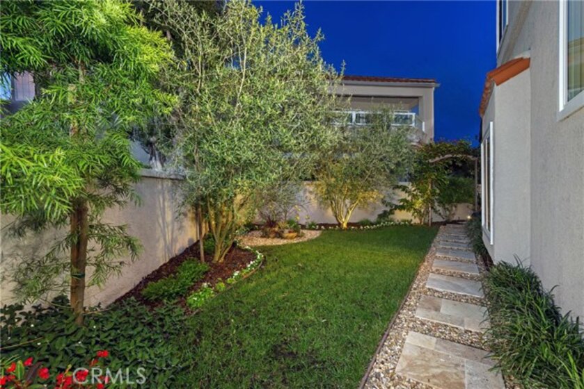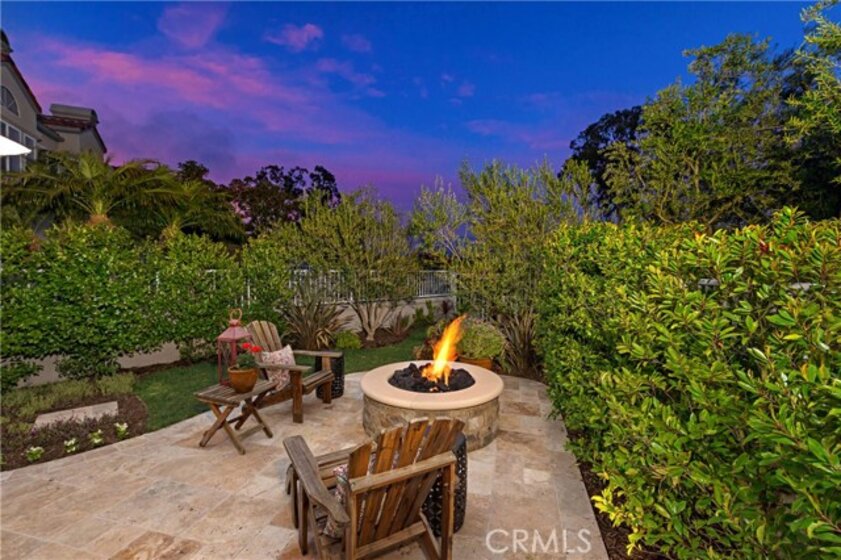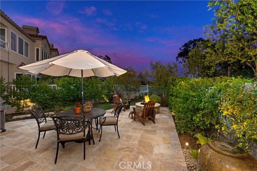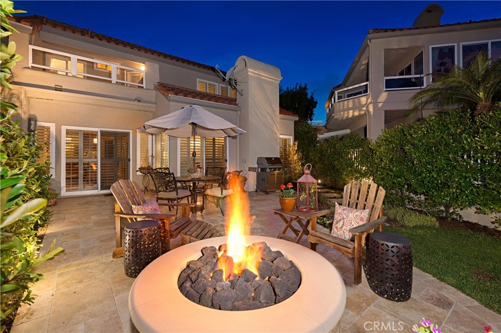 This elegant Laguna Sur property is uniquely located giving quiet privacy along with a spacious side yard and backyard to these 3 bedrooms 2 1/2 bath home. A travertine path leading to the iron gate into a quaint courtyard filled with the subtle sound of a bubbling Italian fountain. The leaded glass doors open to the bright open floor plan accented with expansive windows and volume ceilings. The spacious dining room is perfect for casual or formal entertaining for friends and family. Living room and breakfast nook open to the travertine patio and fire pit with a beautifully planted backyard accented with olive trees that surround the home. The remodeled kitchen includes stainless appliances quartz countertops and an L shaped counter with bars stools on one side. Plantation shutters and porcelain wood floors adorn the complete lower level and stairway. Finally, is the family room/den, a great place to relax and listen to the courtyard water feature. Master bedroom suite is a luxurious retreat with relaxing balcony and walk-in closet. Master bath has dual vanities, walk-in shower with new travertine tile, and freestanding tub. Completely reimagined and updated 2 years ago by the current owner the property exudes casual sophistication. THIS IS A VERY DOG FRIENDLY YARD FENCED AND PLENTY OF SPACE.