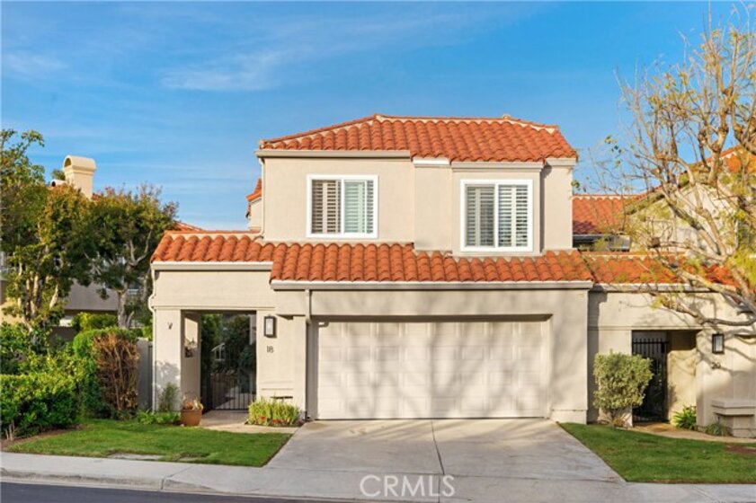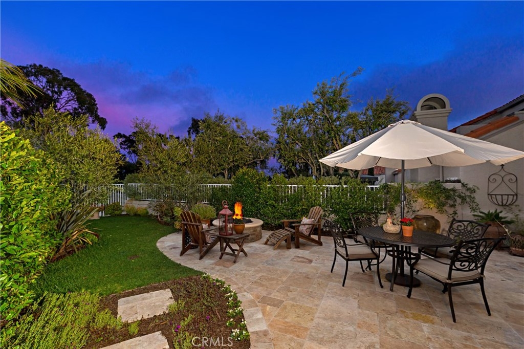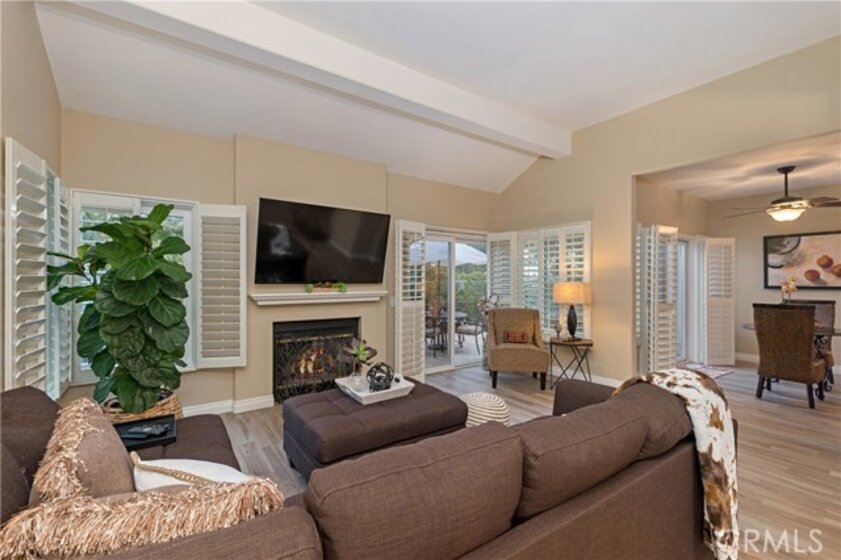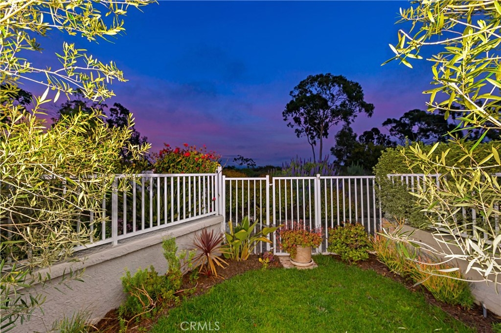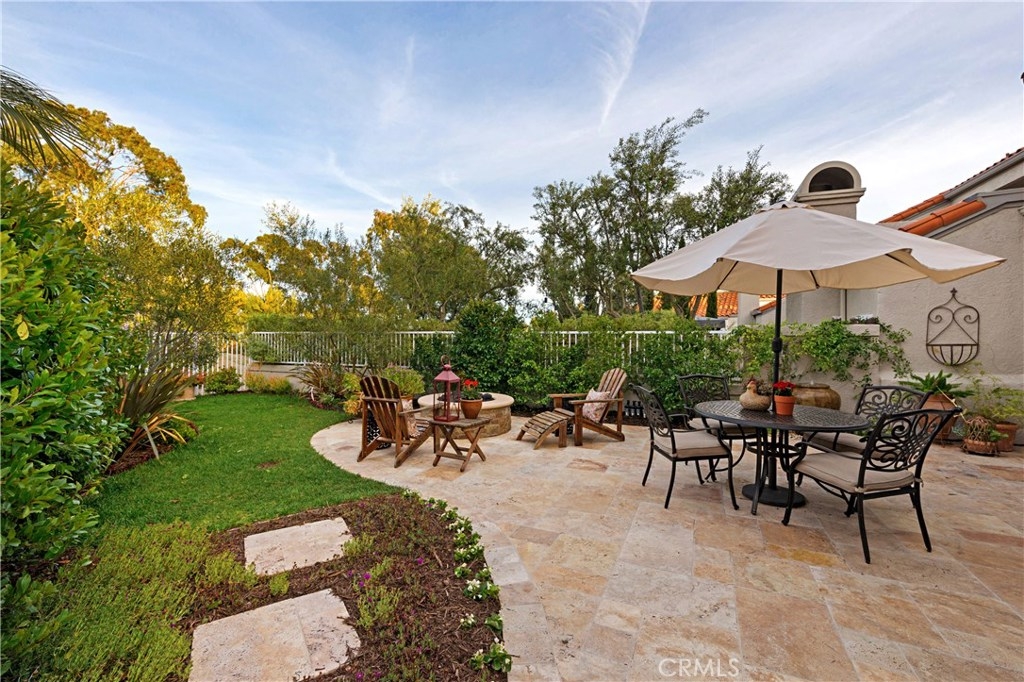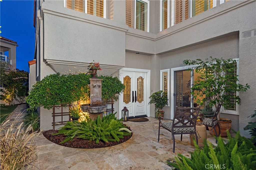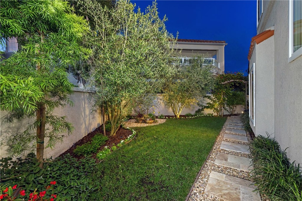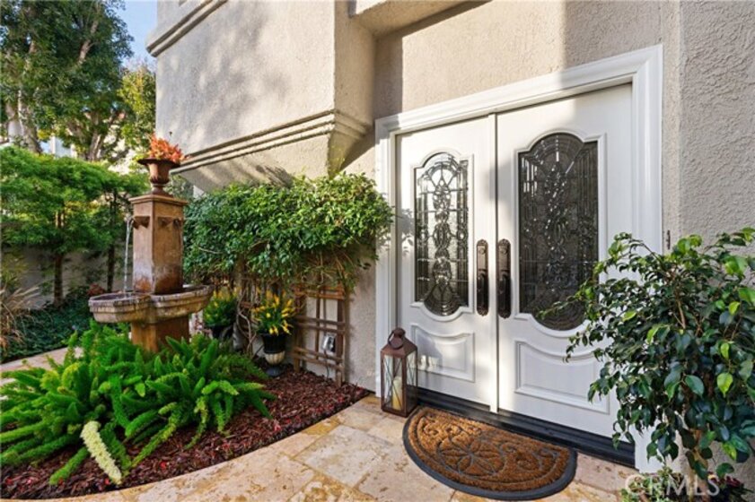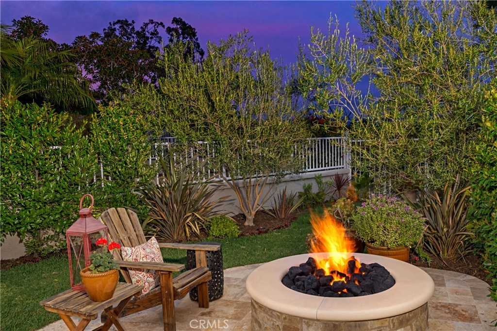 This elegant Laguna Sur property is uniquely located giving quiet privacy along with a spacious side yard and backyard to these 3 bedrooms 2 1/2 bath home. A travertine path leading to the iron gate into a quaint courtyard filled with the subtle sound of a bubbling Italian fountain. The leaded glass doors open to the bright open floor plan accented with expansive windows and volume ceilings. The spacious dining room is perfect for casual or formal entertaining for friends and family. Living room and breakfast nook open to the travertine patio and fire pit with a beautifully planted backyard accented with olive trees that surround the home. The remodeled kitchen includes stainless appliances quartz countertops and an L shaped counter with bars stools on one side. Plantation shutters and porcelain wood floors adorn the complete lower level and stairway. Finally, is the family room/den, a great place to relax and listen to the courtyard water feature. Master bedroom suite is a luxurious retreat with relaxing balcony and walk-in closet. Master bath has dual vanities, walk-in shower with new travertine tile, and freestanding tub. Completely reimagined and updated 2 years ago by the current owner the property exudes casual sophistication. THIS IS A VERY DOG FRIENDLY YARD FENCED AND PLENTY OF SPACE.