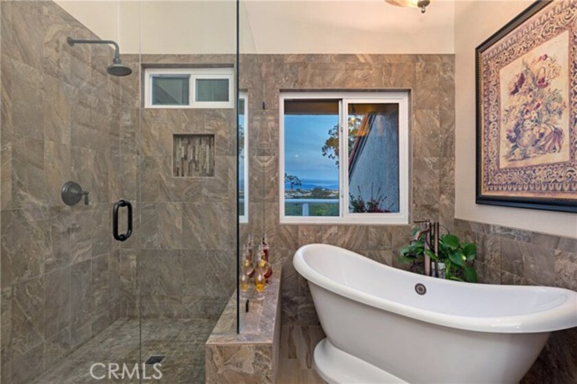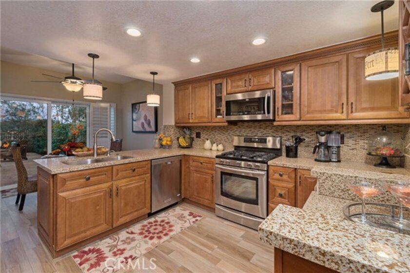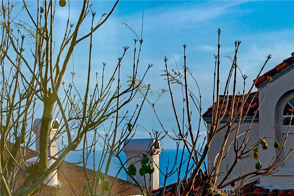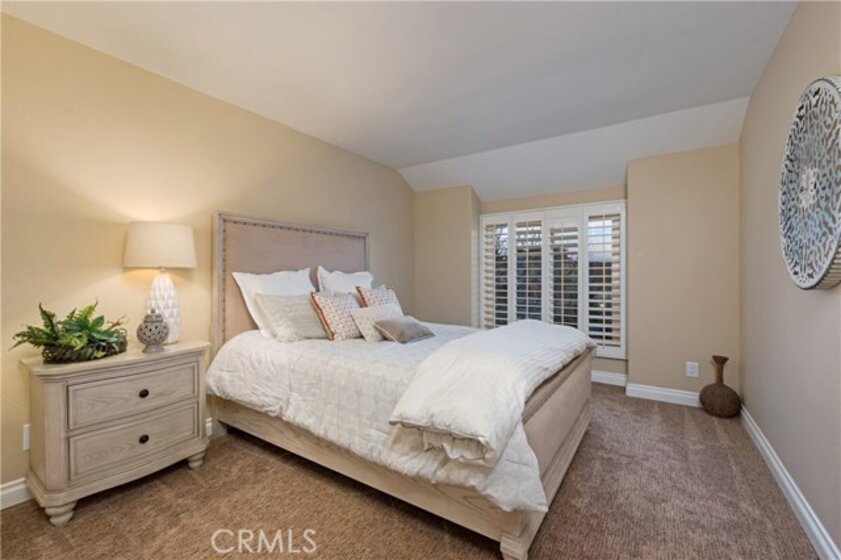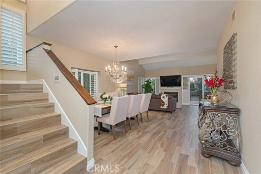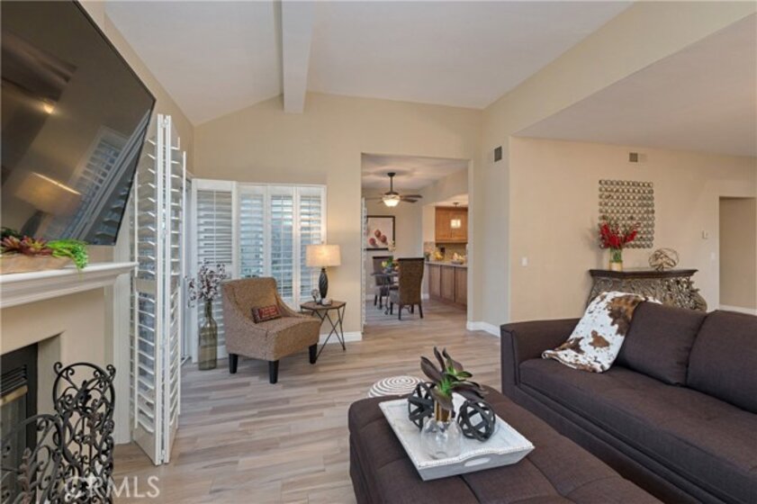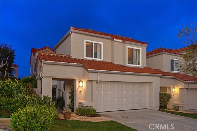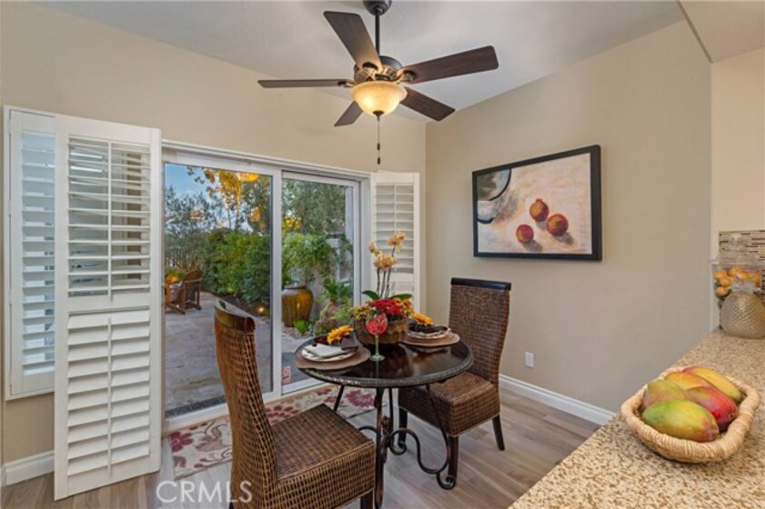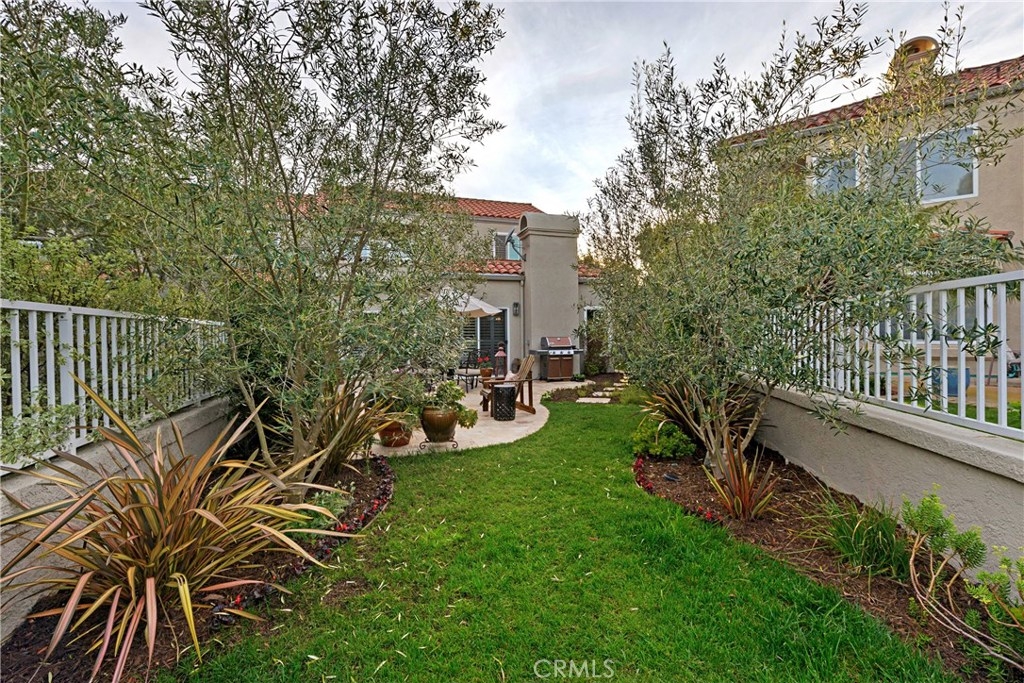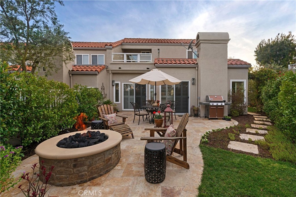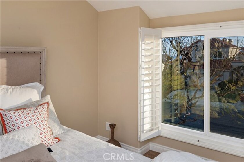 This elegant Laguna Sur property is uniquely located giving quiet privacy along with a spacious side yard and backyard to these 3 bedrooms 2 1/2 bath home. A travertine path leading to the iron gate into a quaint courtyard filled with the subtle sound of a bubbling Italian fountain. The leaded glass doors open to the bright open floor plan accented with expansive windows and volume ceilings. The spacious dining room is perfect for casual or formal entertaining for friends and family. Living room and breakfast nook open to the travertine patio and fire pit with a beautifully planted backyard accented with olive trees that surround the home. The remodeled kitchen includes stainless appliances quartz countertops and an L shaped counter with bars stools on one side. Plantation shutters and porcelain wood floors adorn the complete lower level and stairway. Finally, is the family room/den, a great place to relax and listen to the courtyard water feature. Master bedroom suite is a luxurious retreat with relaxing balcony and walk-in closet. Master bath has dual vanities, walk-in shower with new travertine tile, and freestanding tub. Completely reimagined and updated 2 years ago by the current owner the property exudes casual sophistication. THIS IS A VERY DOG FRIENDLY YARD FENCED AND PLENTY OF SPACE.