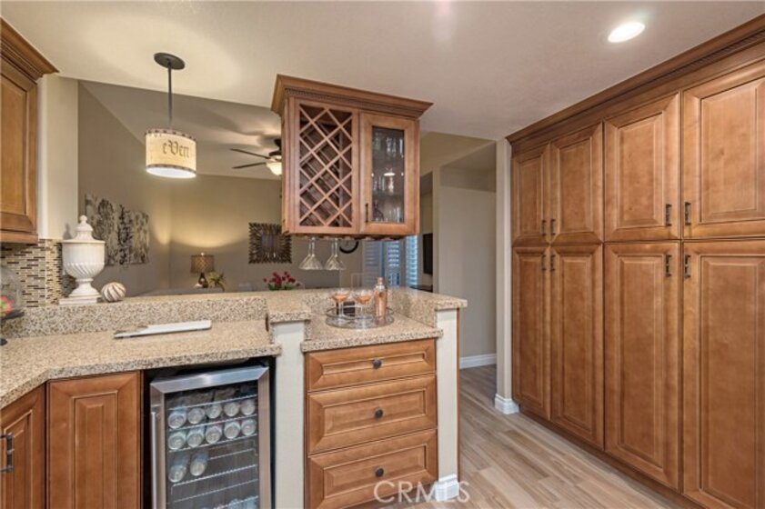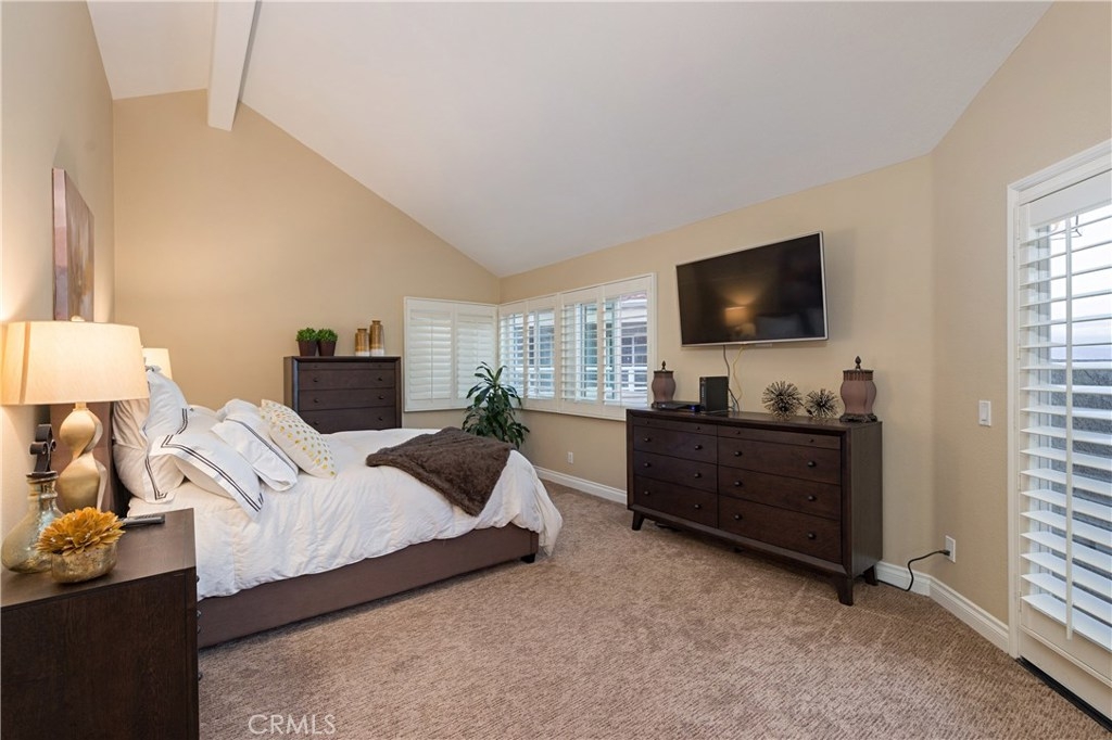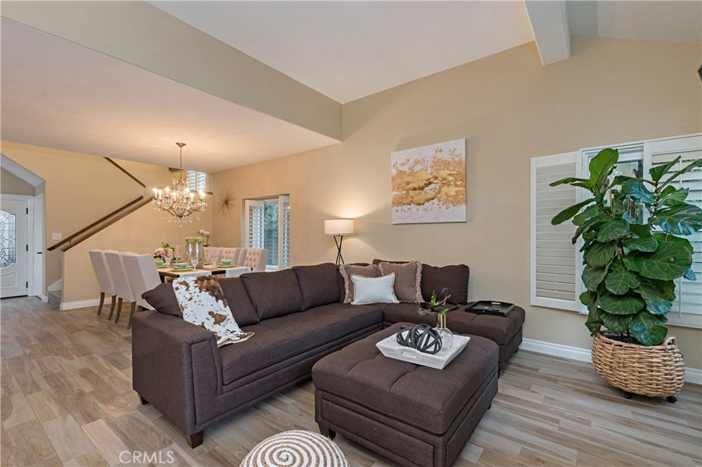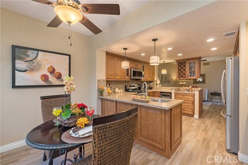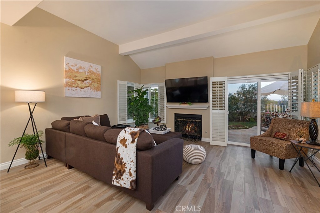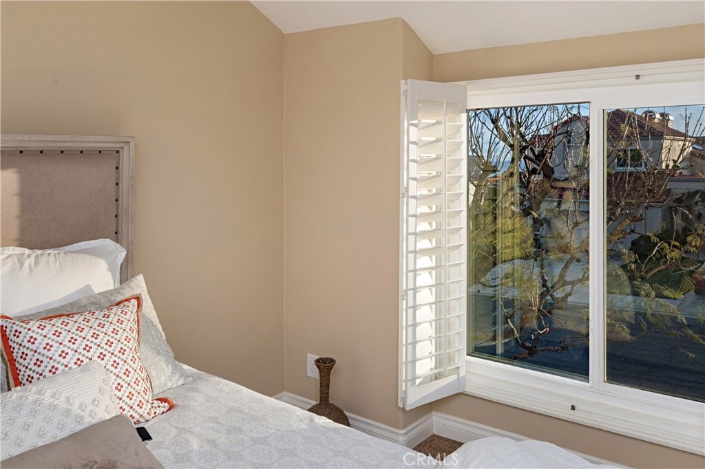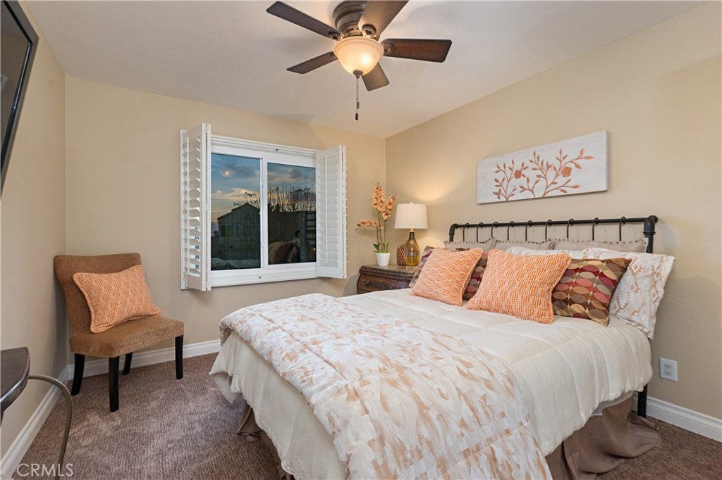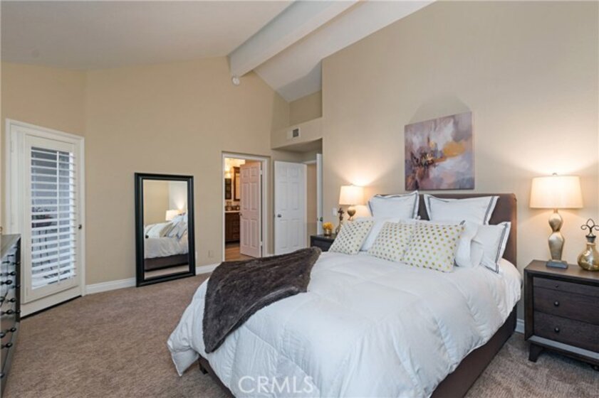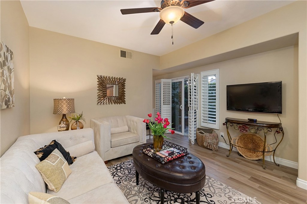 This elegant Laguna Sur property is uniquely located giving quiet privacy along with a spacious side yard and backyard to these 3 bedrooms 2 1/2 bath home. A travertine path leading to the iron gate into a quaint courtyard filled with the subtle sound of a bubbling Italian fountain. The leaded glass doors open to the bright open floor plan accented with expansive windows and volume ceilings. The spacious dining room is perfect for casual or formal entertaining for friends and family. Living room and breakfast nook open to the travertine patio and fire pit with a beautifully planted backyard accented with olive trees that surround the home. The remodeled kitchen includes stainless appliances quartz countertops and an L shaped counter with bars stools on one side. Plantation shutters and porcelain wood floors adorn the complete lower level and stairway. Finally, is the family room/den, a great place to relax and listen to the courtyard water feature. Master bedroom suite is a luxurious retreat with relaxing balcony and walk-in closet. Master bath has dual vanities, walk-in shower with new travertine tile, and freestanding tub. Completely reimagined and updated 2 years ago by the current owner the property exudes casual sophistication. THIS IS A VERY DOG FRIENDLY YARD FENCED AND PLENTY OF SPACE.