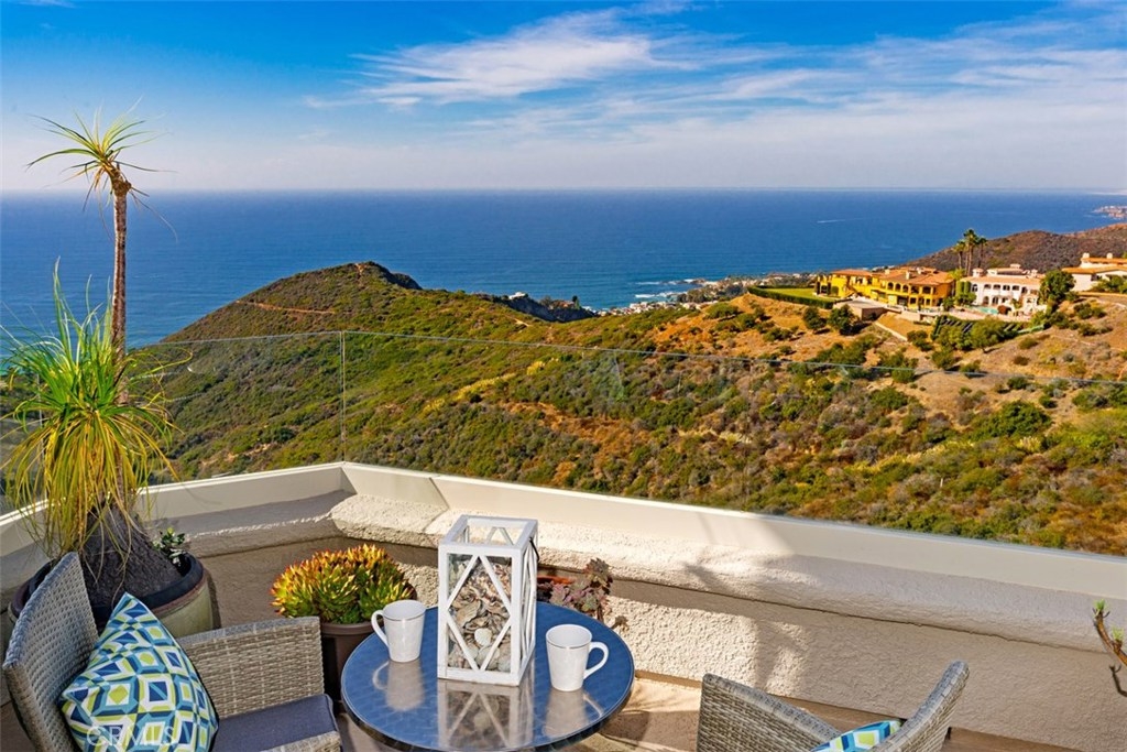 Floating above picturesque Laguna Beach, the awe-inspiring views of Catalina Island, the azure blue Pacific Ocean, white water waves and canyon views from this coastal paradise will take your breath away. Views stretch from Laguna Beach to Palos Verdes. The premier, front row location maximizes the opportunity to capture all the views throughout the generous living spaces and perfectly situated decks. Enter the home through the private courtyard and open the front door to a thoughtfully designed sanctuary for entertaining and coastal living with a gorgeous vaulted ceiling, skylight and open living and dining room floor plan. Day time light glints off the ocean horizon and evening lights sparkle from the surrounding hills, displayed in stunning fashion from spacious windows in the dual living rooms and master suites. Beautifully done, the 2-bedroom design includes two full baths plus two half-bathrooms. MAIN FLOOR MASTER Laguna Sur, in which this home resides, is a resort-like guard gated community offering pools, tennis courts and access to some of the best ocean view hiking anywhere. The home’s prime location is within close proximity to the Gold Coast’s desirable beaches – 1000 Steps, Aliso Beach and West Street Beach, resort hotels Ritz Carlton, Monarch Beach Resort and the Montage, as well as the area’s notable eateries, boutique shopping, and cultural entertainment venues.