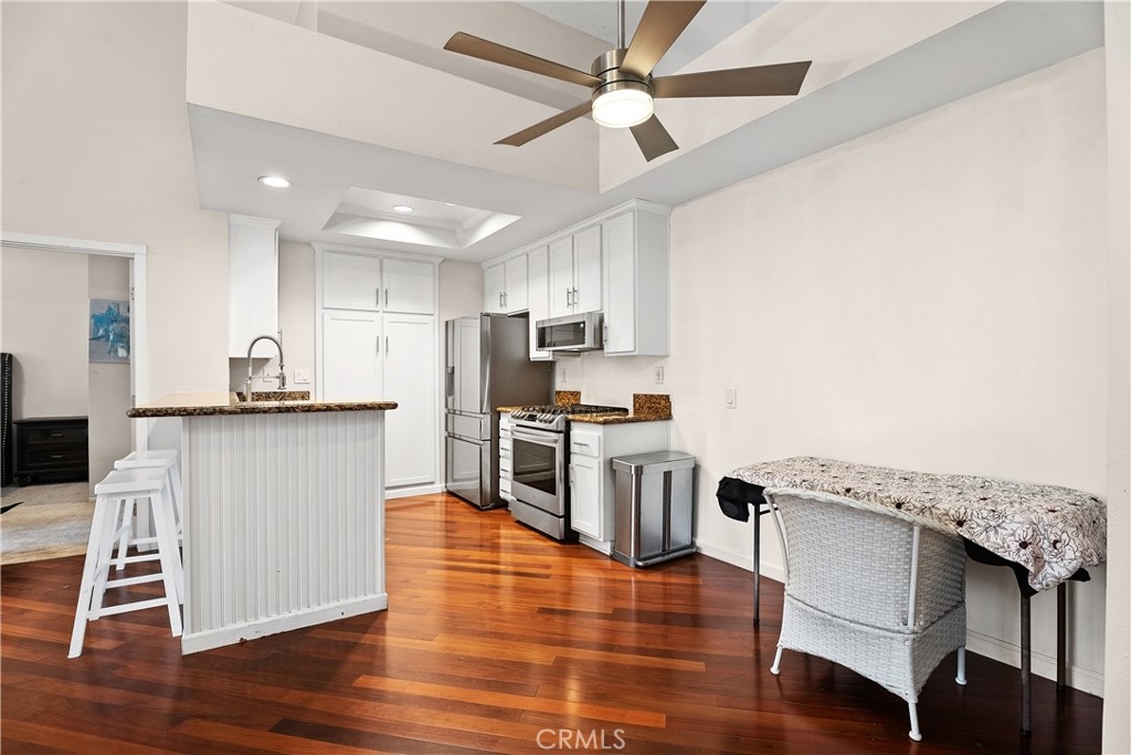 Penthouse 2 bed, 2 bath single level home with DUAL PRIMARY SUITES that both open to an enormous entertainer's dream balcony overlooking Milano at Rancho Niguel. Featuring tall architectural ceilings, rich wood floors, and a cozy gas fireplace, this unit was designed to bring the outside in, with loads of natural light and an open concept feel. The perfectly proportioned kitchen features tumbled granite countertops, stainless steel appliances, pristine white cabinetry with a large pantry, and recessed lighting. Both bedrooms are well sized with vaulted ceilings, recently remodeled private baths, and large closets. Convenient inside laundry room includes custom cabinetry and shelving. The resort style amenities of Milano at Rancho Niguel include a swimming pool, spa, gym, clubhouse, plus 6 EV charging stations. All this and just a short stroll to a plethora of shops, restaurants, grocery stores, movie theatres, and award winning Bergeson Elementary School! An absolutely perfect spot to call home!