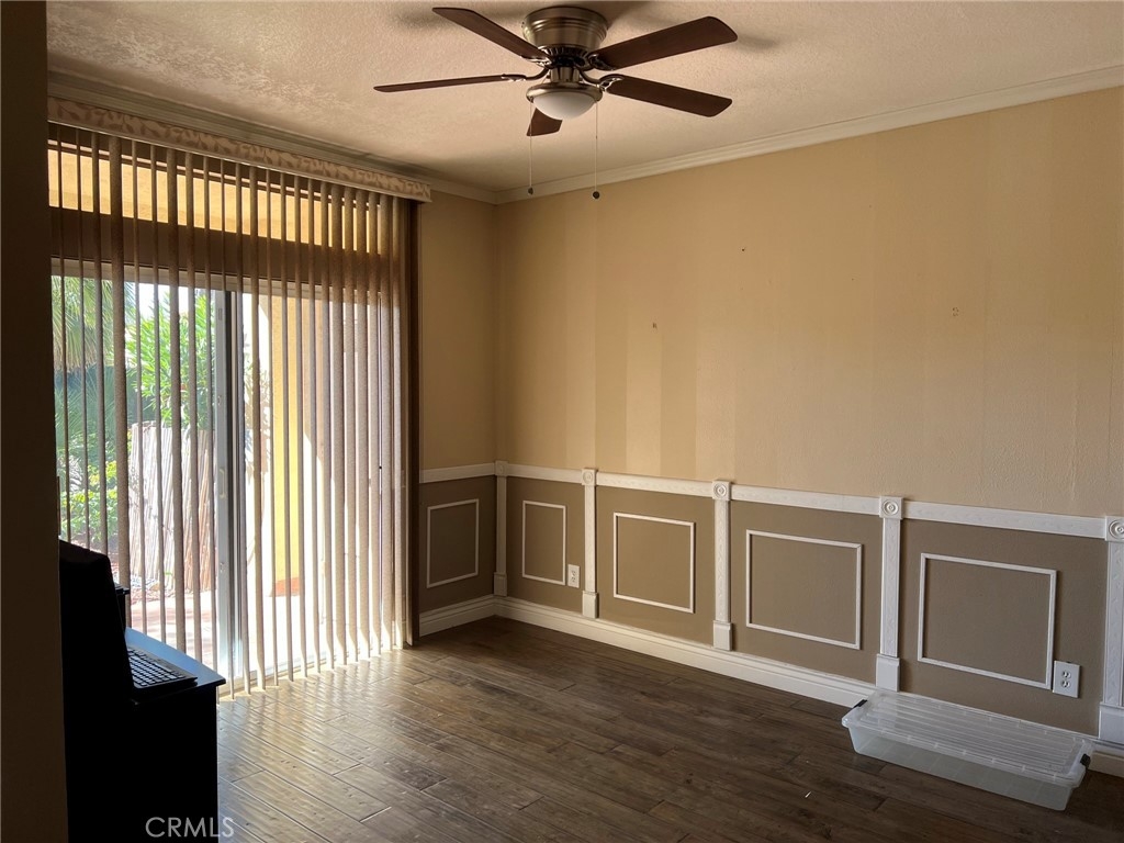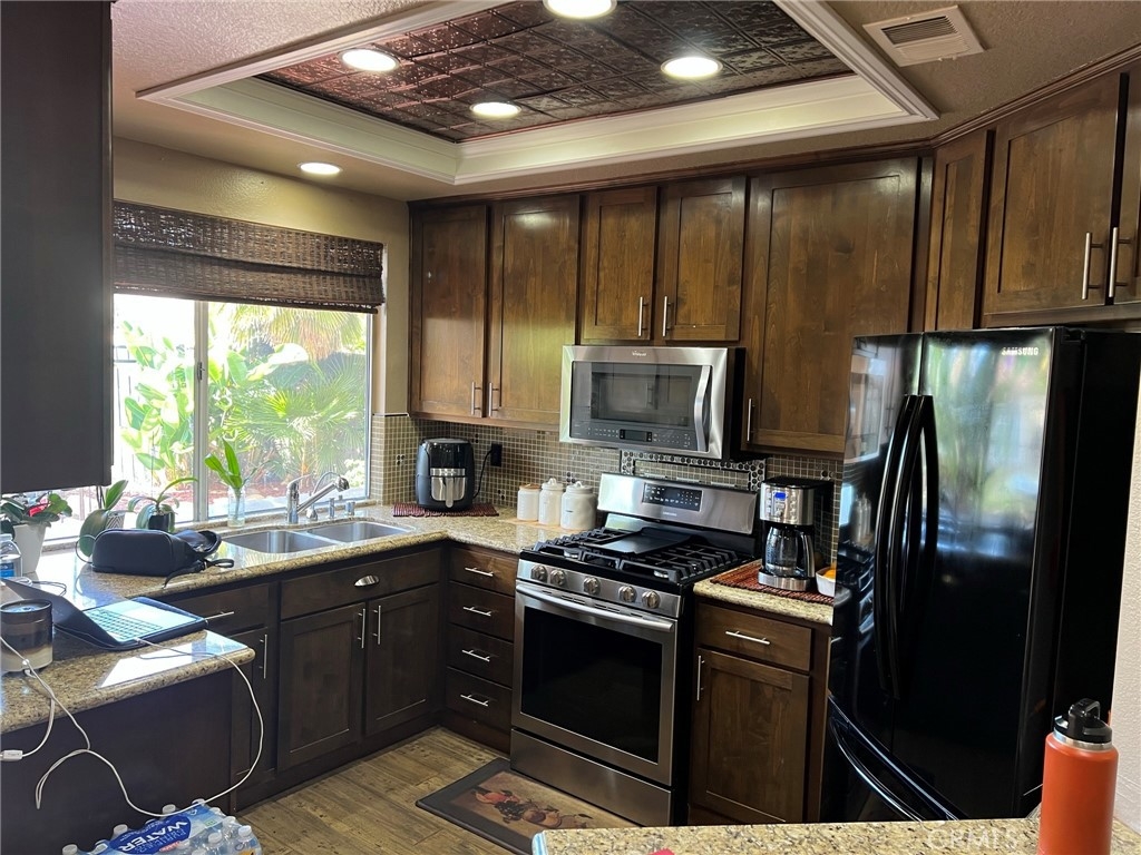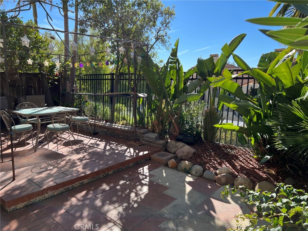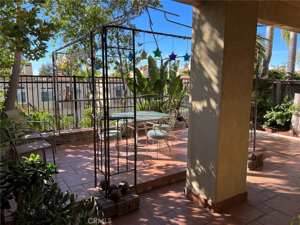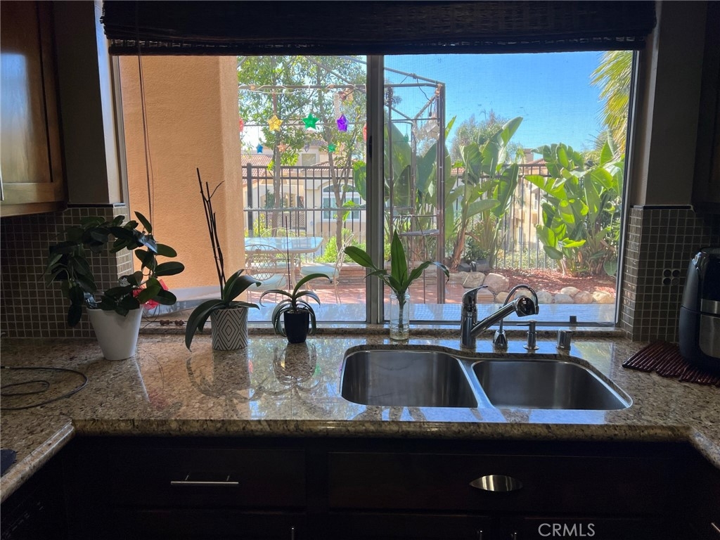 This condo features upgrades that stands out as one of the best in this price range. There is direct access to the garage for one car, in addition to an assigned carport (#183). Gorgeous custom kitchen cabinets feature soft closing. Granite countertops with alluring tiled backsplash and recessed lighting. Distressed wood-flooring throughout aside from the bathrooms which have tile flooring. Color coordinated verticals over the sliding glass doors in the master bedroom and dining area. Custom painting with a variety of textures on the walls throughout. Master bath includes travertine in the shower and custom tiled countertops in the vanity, including dual shell shaped basins and brass plated fixtures. A large walk-in closet with mirrored doors is adjacent to the vanity. Inviting backyard is all tile with palm trees and giant bird of paradise giving it a tropical touch with increased privacy. Hurry! This one won't last!
