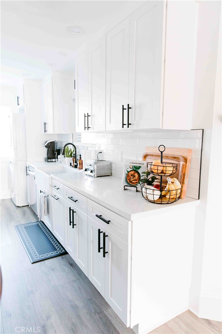 Welcome to coastal bliss in Laguna Niguel! Discover this charming, single-level two-bedroom condo that's perfect for creating your dream lifestyle. Upon entering, you'll be greeted by a spacious family room adorned with hardwood flooring and sliding glass doors, which open up to an updated backyard complete with a built-in barbecue. The heart of this lovely home is the brand new kitchen, featuring pristine white cabinets and farmhouse sink and tile backsplash. A convenient stackable washer and dryer are tucked away near the sunlit kitchen window, now included with the property! Both generously-sized bedrooms are complemented by remodeled bathrooms, including a full bath with a separate shower and toilet area. The home is polished off with crisp white crown molding in the family room, fresh paint throughout, and upgraded plumbing piping for your peace of mind. But wait, there's more! Enjoy the perks of the HOA pool access just a stone's throw away, perfect for those warm summer days. And when the beach calls your name, Salt Creek Beach is only a few miles down the road, ready to satisfy your coastal cravings. This Laguna Niguel gem is now equipped with a new air conditioning system to keep you comfortable all year round. Welcome to your new slice of paradise in Laguna Niguel!
