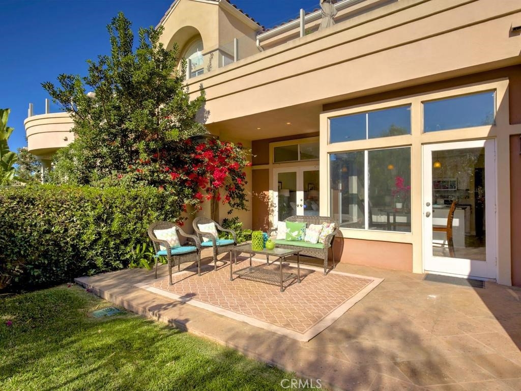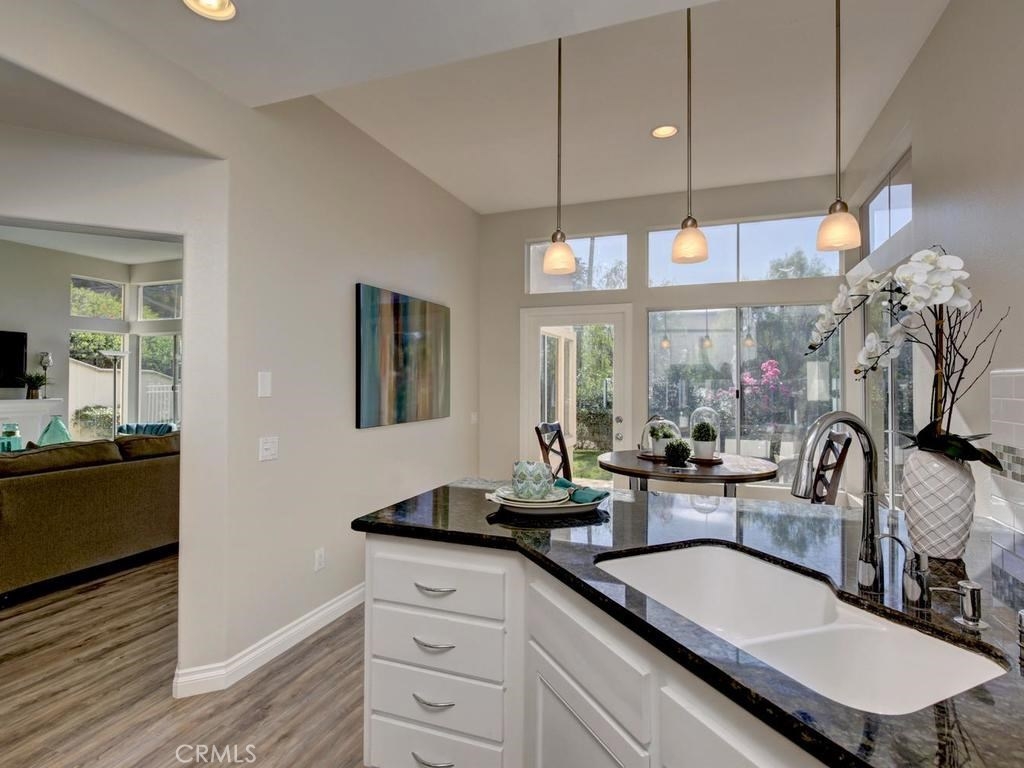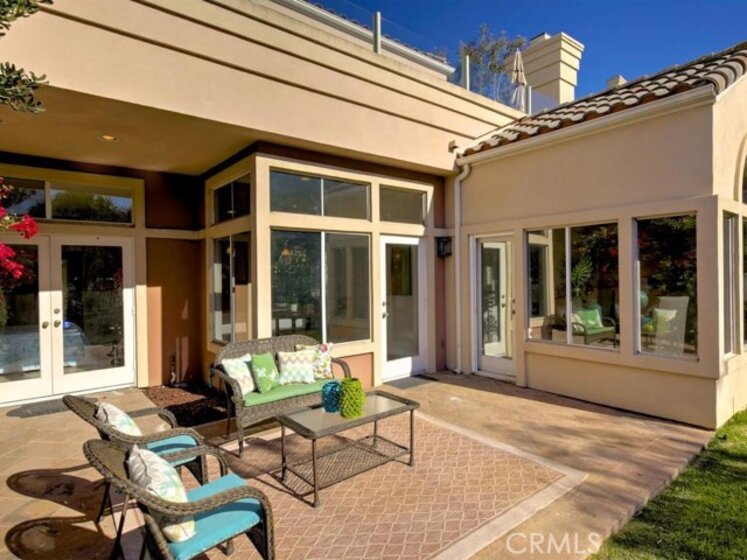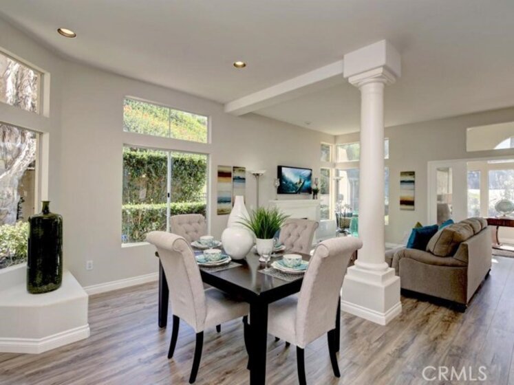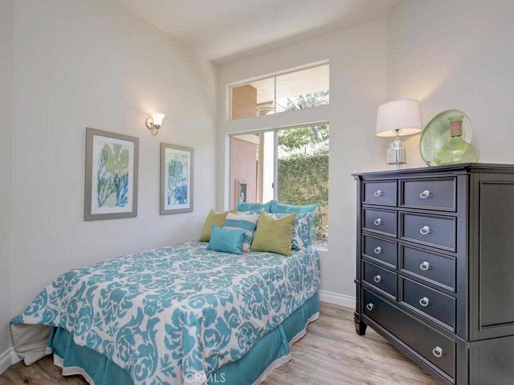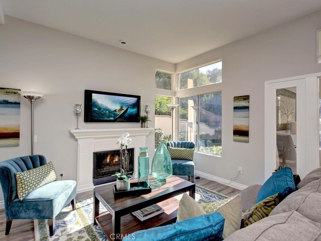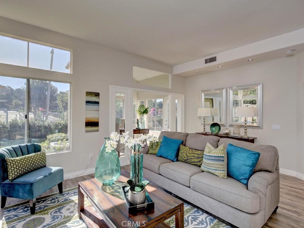 A showcase home, this updated Bear Brand Riviera ocean-close single-level is perfectly situated for a walkable lifestyle. As you approach the residence, you will notice fine architectural touches like stately columns, a plethora of windows, and the tasteful frosted half glass front door. The equally divine interior begins with a great room featuring new wood laminate flooring, recessed lighting, and a warm fireplace. The kitchen is appointed with granite countertops, a mosaic-tile backsplash, both recessed and delicate pendant lighting, wainscoting, and quality stainless steel appliances. Light floods into the home through the dining area that opens to the kitchen and the sun room/den, which can be closed off to convert into a third bedroom/guest room if needed. The en suite Master bedroom has a large walk-in closet, and direct access to the oversized backyard through French doors. The well-balanced floor plan includes a sunny second bedroom, inside laundry, and attached two-car garage. The spacious backyard is very private with no homes behind, a stamped concrete patio, and ample landscaped grass. Riviera at Bear Brand is a short walk to the community pool and spa, Bear Brand park, the well-regarded St. Anne school, and Ocean Ranch shopping center, which includes Trader Joe's, Cinepolis, Peet's coffee and more. A few miles from the Ritz, St. Regis Monarch Beach, Monarch Beach Golf Links, and Salt Creek/Strands beaches, this home is centrally located in paradise.
