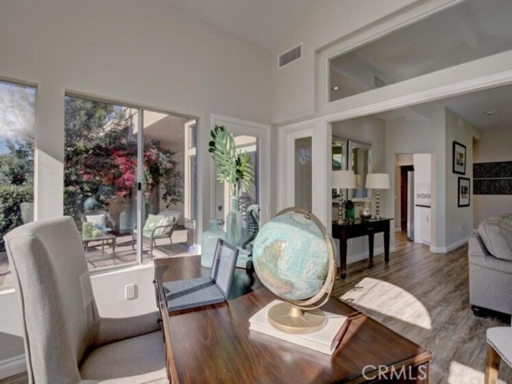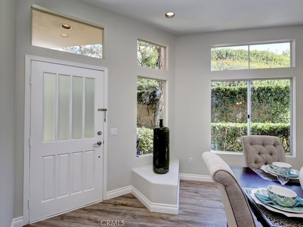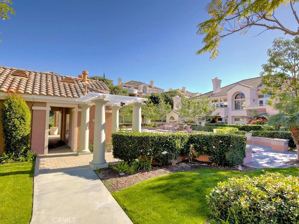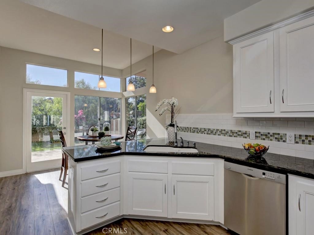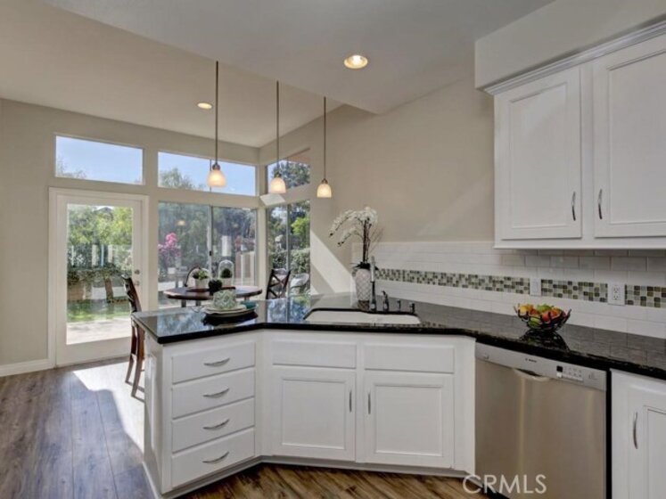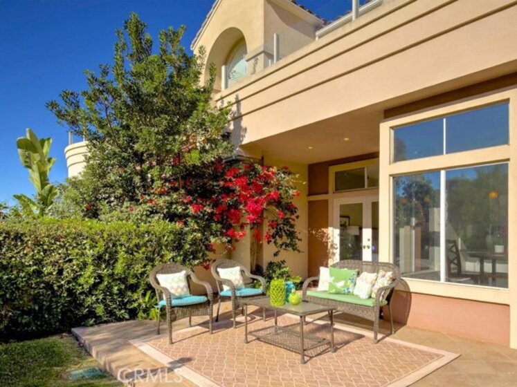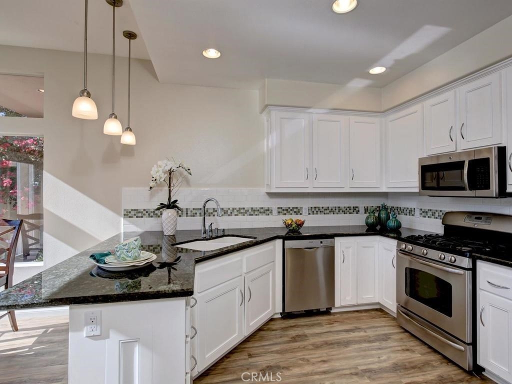 A showcase home, this updated Bear Brand Riviera ocean-close single-level is perfectly situated for a walkable lifestyle. As you approach the residence, you will notice fine architectural touches like stately columns, a plethora of windows, and the tasteful frosted half glass front door. The equally divine interior begins with a great room featuring new wood laminate flooring, recessed lighting, and a warm fireplace. The kitchen is appointed with granite countertops, a mosaic-tile backsplash, both recessed and delicate pendant lighting, wainscoting, and quality stainless steel appliances. Light floods into the home through the dining area that opens to the kitchen and the sun room/den, which can be closed off to convert into a third bedroom/guest room if needed. The en suite Master bedroom has a large walk-in closet, and direct access to the oversized backyard through French doors. The well-balanced floor plan includes a sunny second bedroom, inside laundry, and attached two-car garage. The spacious backyard is very private with no homes behind, a stamped concrete patio, and ample landscaped grass. Riviera at Bear Brand is a short walk to the community pool and spa, Bear Brand park, the well-regarded St. Anne school, and Ocean Ranch shopping center, which includes Trader Joe's, Cinepolis, Peet's coffee and more. A few miles from the Ritz, St. Regis Monarch Beach, Monarch Beach Golf Links, and Salt Creek/Strands beaches, this home is centrally located in paradise.