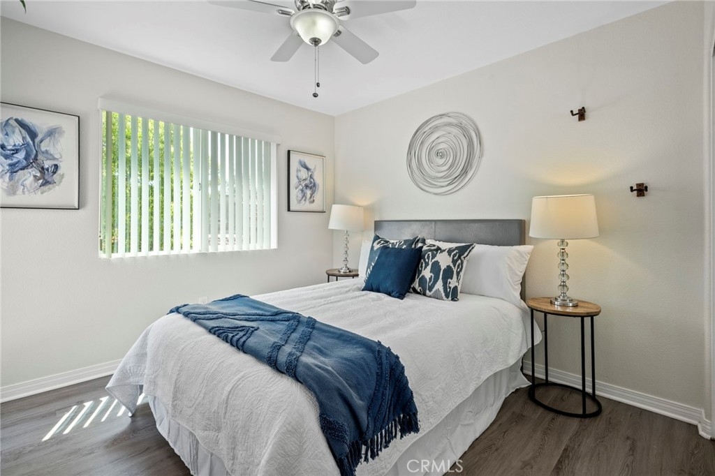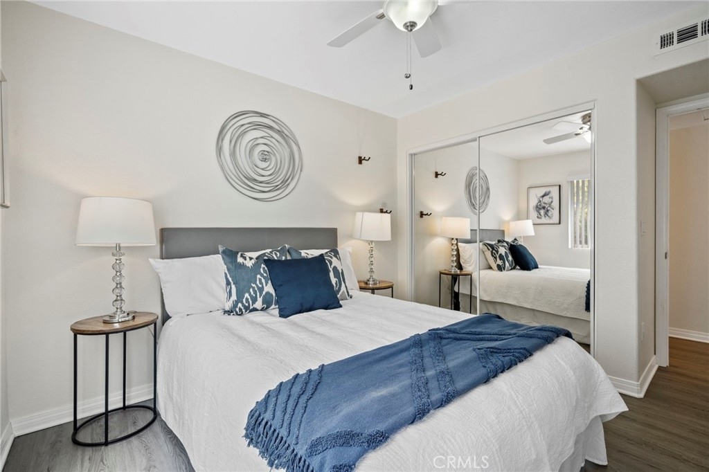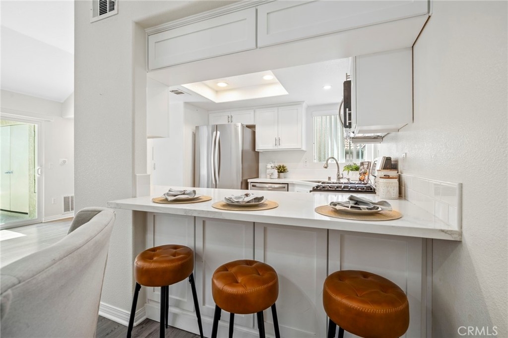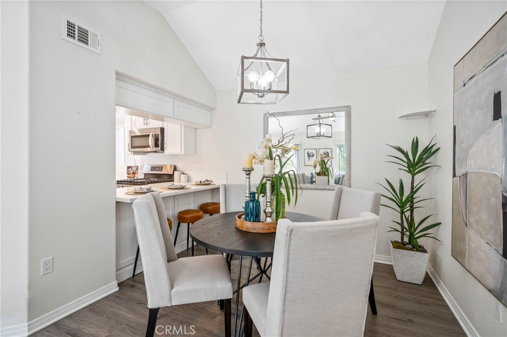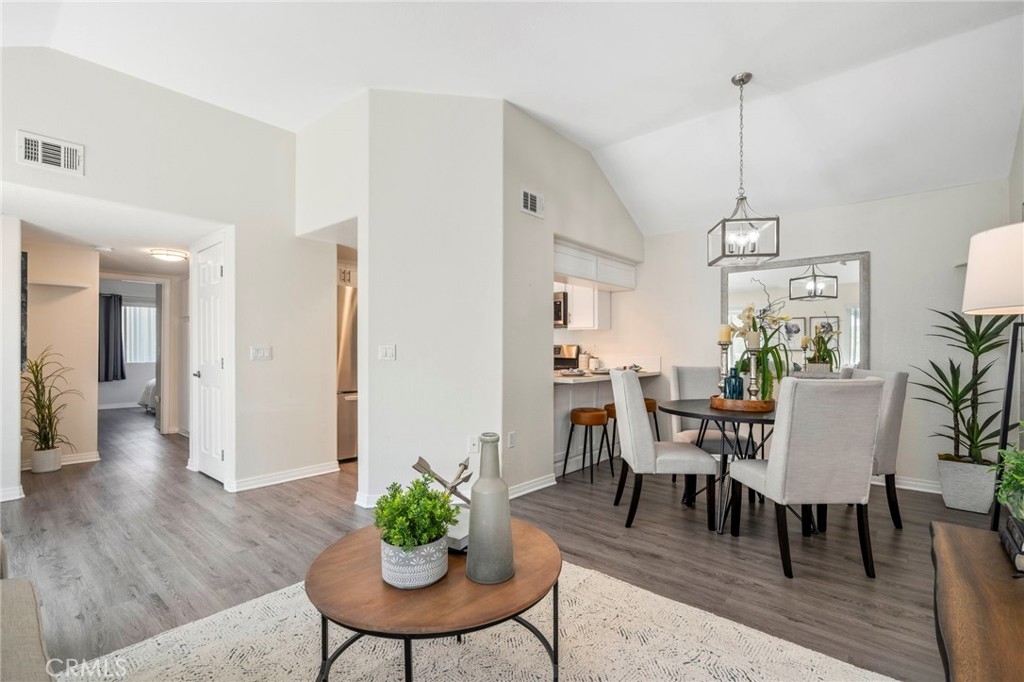 Welcome to 28241 Sorrento #124—a beautifully remodeled, light-filled upper-level condo nestled in the peaceful Villa Mira community of Laguna Niguel. This stylish 2-bedroom, 2-bathroom home offers approximately 900 square feet of thoughtfully upgraded living space designed for comfort, functionality, and modern charm. Step into an open-concept layout featuring vaulted ceilings, updated vinyl flooring and abundant natural light throughout. The dining area is accented by an elegant chandelier, while the remodeled kitchen showcases classic white shaker cabinets, a deep farmhouse sink, and sleek stainless steel appliances—ideal for entertaining or everyday living. Both generously sized bedrooms are outfitted with ceiling fans and mirrored sliding closet doors, creating a bright and airy retreat. The primary bathroom has been tastefully updated with a walk-in shower, sliding glass doors, and a luxurious rain shower head. The guest bathroom features a shower-over-tub combo and a modern vanity. Enjoy serene outdoor living on the private balcony, which offers peaceful hillside views and is accessible from both the living room and guest bedroom. Practical amenities include in-unit laundry hookups on the patio, hallway storage, a detached one-car garage with built-in cabinetry, and up to two additional permitted parking spaces. Trash included in HOA fee. Villa Mira offers residents access to two sparkling pools, two relaxing spas, and a newly renovated clubhouse—perfect for social gatherings. Ideally located just minutes from the 5 and 73 freeways, shopping at Costco and The Shops at Mission Viejo, popular restaurants, scenic parks, and the world-renowned beaches of Dana Point and Laguna Beach. This turnkey home is a true gem, offering a tranquil yet connected lifestyle in the heart of South Orange County. Don’t miss the opportunity to make it yours!