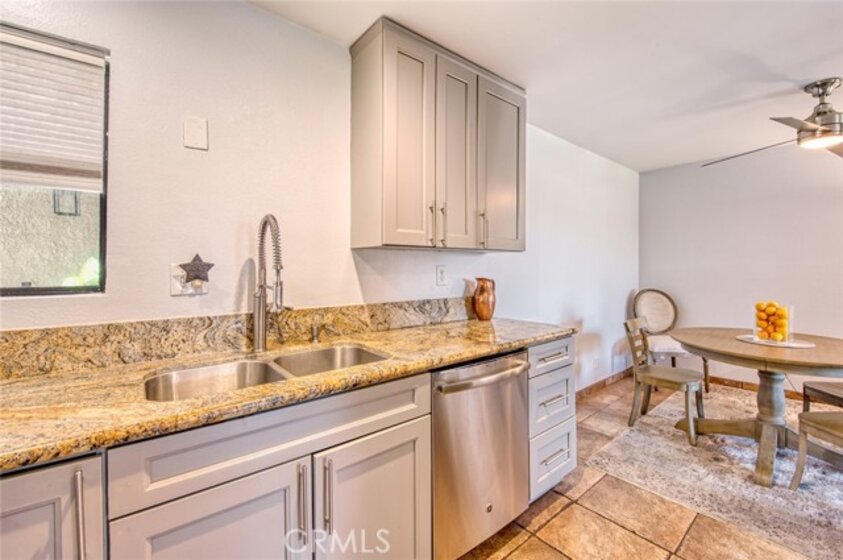 GREAT INVESTMENT OPPORTUNITY - ASSUMABLE LOW INTEREST VA LOAN IS OPEN TO NON-MILITARY ! Step into this spacious and beautifully updated 2-bedroom, 2-bath Condo tucked away in a quiet, private part of the community. As soon as you walk in, you're greeted with stunning views of the Saddleback Mountains and rolling green hills—your own peaceful retreat. To the left, you’ll find a freshly painted, thoughtfully redesigned kitchen that flows effortlessly into the open dining and living areas. With its stylish grey tones, granite countertops, custom cabinets, upgraded stovetop hood, stainless steel appliances, and elegant fixtures, this kitchen is as functional as it is beautiful. Hosting friends or simply enjoy a quiet evening is easy with the generous, partially covered patio that offers plenty of space to relax or entertain—indoors and out. Your primary suite includes dual sinks and plenty of space to unwind, while the second bedroom features a charming French door leading straight out to the patio. Throughout the home, you’ll love the mix of hardwood and tile flooring, mirrored closet doors and Central A/C for those warmer days. There’s also tons of storage both inside the unit and in the garage. It’s just a short stroll to the community center, pool and spa, with quick access to local shopping and freeways—making life just that much easier.