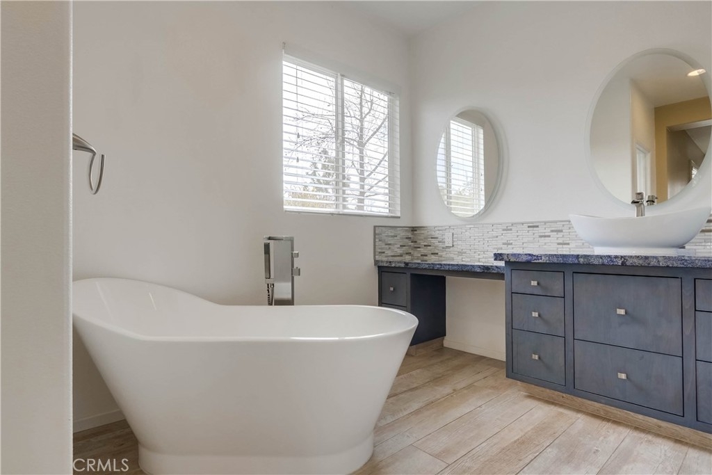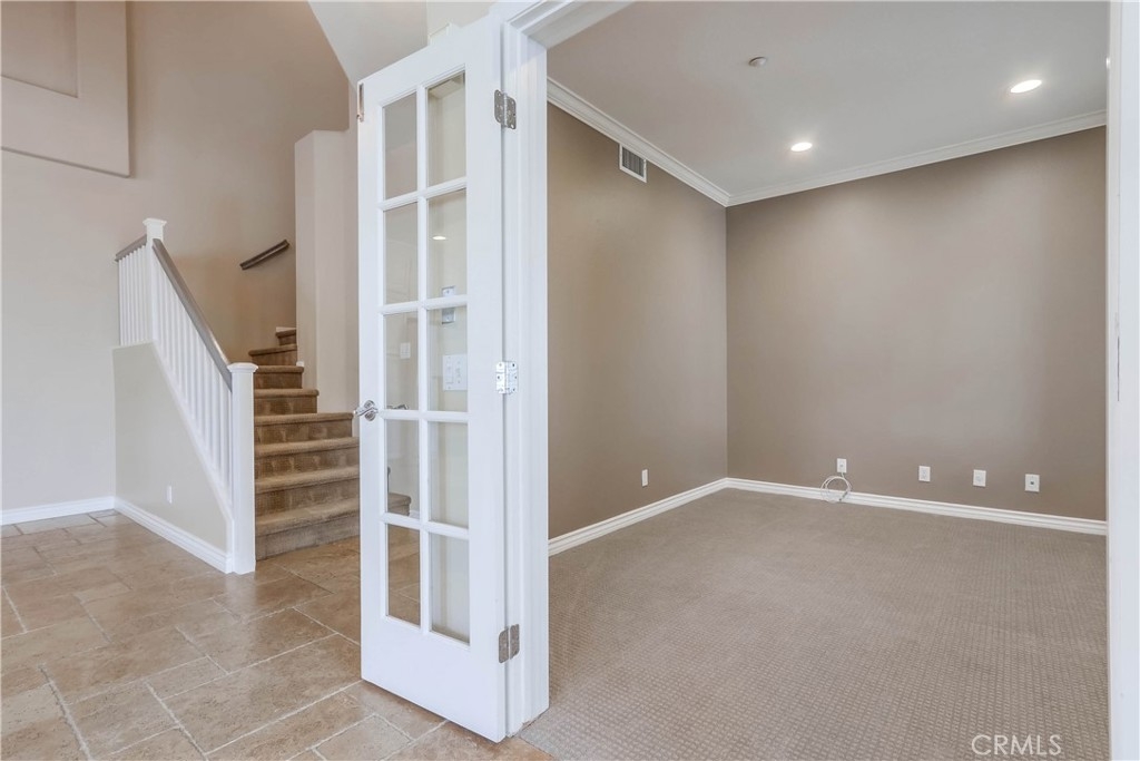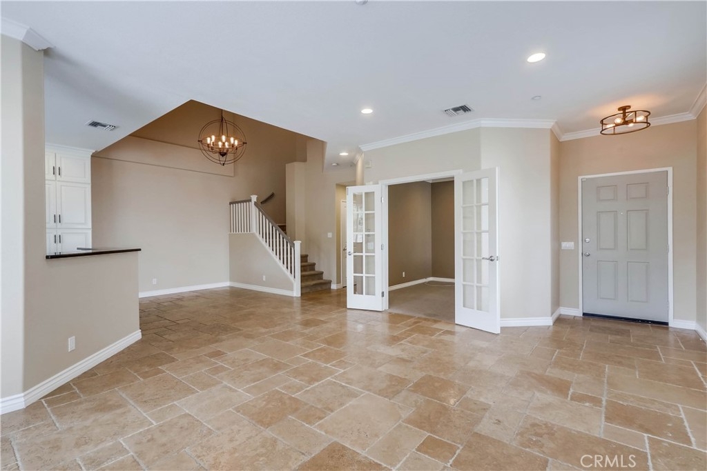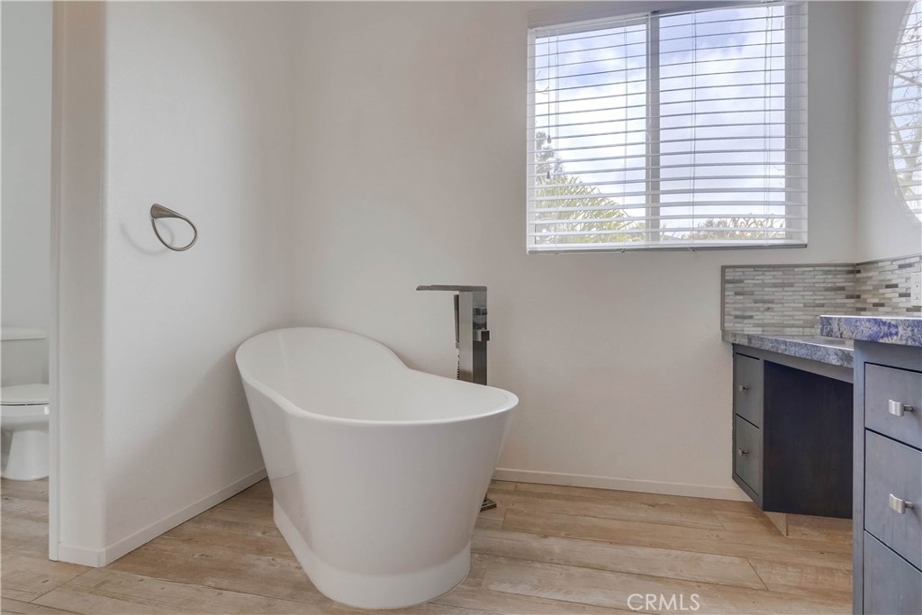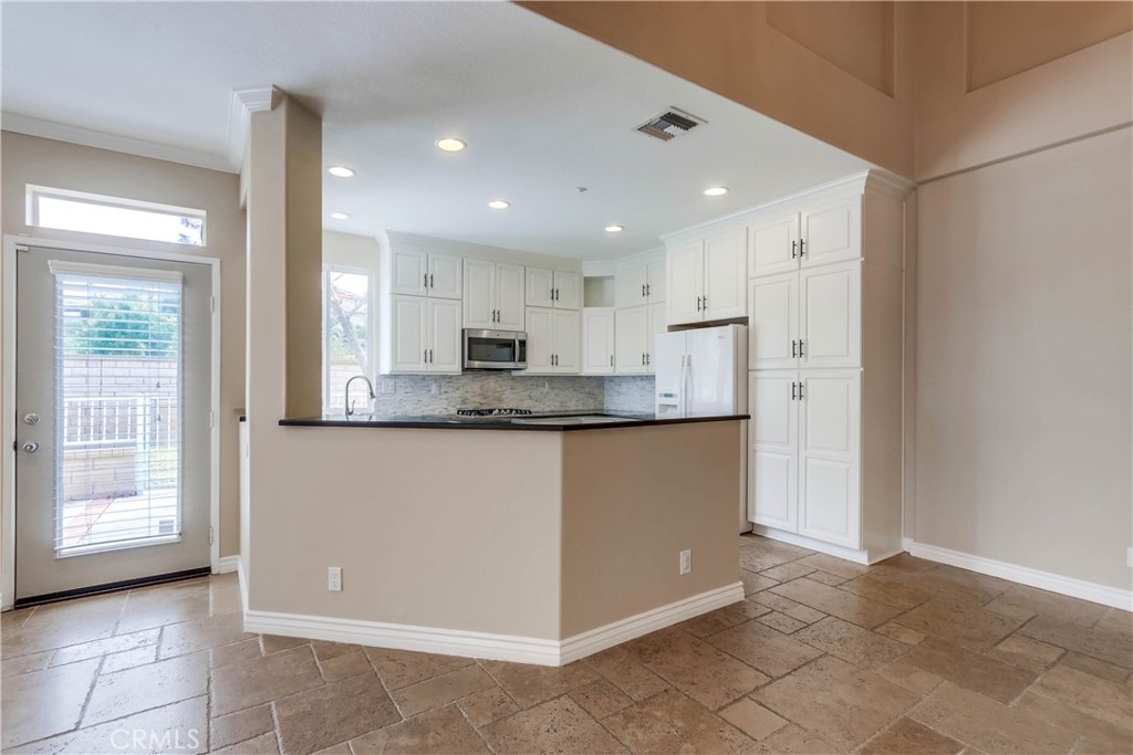Beautifully updated and improved, prized end unit ideally located on a peaceful greenbelt in the desirable gated community of Village Niguel Gardens. The well-designed open floor plan, neutral paint palette, gorgeous tile floors, plantation shutters, crown molding, and modern custom light fixtures set the stage for the perfect living environment. The living area is filled with natural light and boasts a cozy fireplace, built-in cabinetry, and direct access to the back patio creating an ideal in-door-outdoor living area. French doors open to a main level bonus room perfect for home office/den or 4th bedroom with full bath just steps away. Remodeled Dream Kitchen with white shaker cabinetry, Granite countertops, gorgeous full glass tile backsplash, matching stainless-steel appliances, updated farmhouse sink, upgraded hardware and fixtures, and is open to the living and dining areas creating a family friendly space. The master suite is a peaceful retreat with 2 closets including a walk-in closet, and a spectacular remodeled master bath with custom vanity, glass tile backsplash, stylish modern sink & faucet, freestanding soaking tub, and an oversized step in shower with rainfall shower head and custom tile. The back patio is a private oasis overlooking a tranquil greenbelt creating a harmonious space for relaxing and entertaining. Community amenities include 2 pool areas and is located within walking distance of shopping, dining, and parks, just minutes from local beaches.