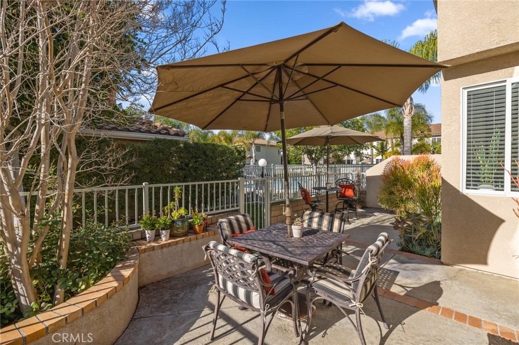HIGHLY PRIZED CORNER TOWNHOME, 4 BEDROOMS INCLUDING A MAIN FLOOR BEDROOM/OFFICE, 3 FULL BATHS, UPGRADED INTERIOR, BACKS TO GREENBELT AND LOCATED IN A DESIRABLE GATED COMMUNITY! Perfectly situated on an interior lot, with great curb appeal, backing to a greenbelt with enclosed privacy and steps away from a serene pool, creating an extension to your own backyard for entertaining! Exceptionally designed open floor plan, lots of windows, natural light, neutral colors, high ceilings and an indoor-outdoor living atmosphere. Main floor bedroom/office with double door entry and nearby full bathroom. Gourmet kitchen opens to the main living and dining areas and features abundant countertop and storage space, newer stainless steel Bosch appliances, granite counters, recessed lights and a custom built in glass front cabinet for displaying your favorite dishes or art. Living room with gas fireplace surrounded by updated white moulding, built-in cabinetry, tile flooring, multiple windows overlooking outdoor greenery and direct access to a private back patio. Interior highlights include custom paint, raised baseboards and new Plantation shutters throughout the home. Upstairs master suite and bath provide a peaceful sanctuary with a separate tub and shower, dual sinks, his/her closets including a walk-in closet and a second mirrored closet. Two additional upstairs bedrooms are spacious, light and share a full bathroom. Low maintenance back patio with surrounding greenbelt and a tranquil area for relaxing while only steps away from one of two community pools. Direct access 2 car garage with built-in cabinet storage, overhead storage, finished flooring and washer/dryer enclave. Located in the private gated community of Village Niguel Gardens with resort style amenities including multiple pools/spas and tennis courts. A prime location with nearby access to Laguna Niguel Regional Park and lake, Whole Foods, toll roads, restaurants, shopping, hiking trails and world class local beaches.