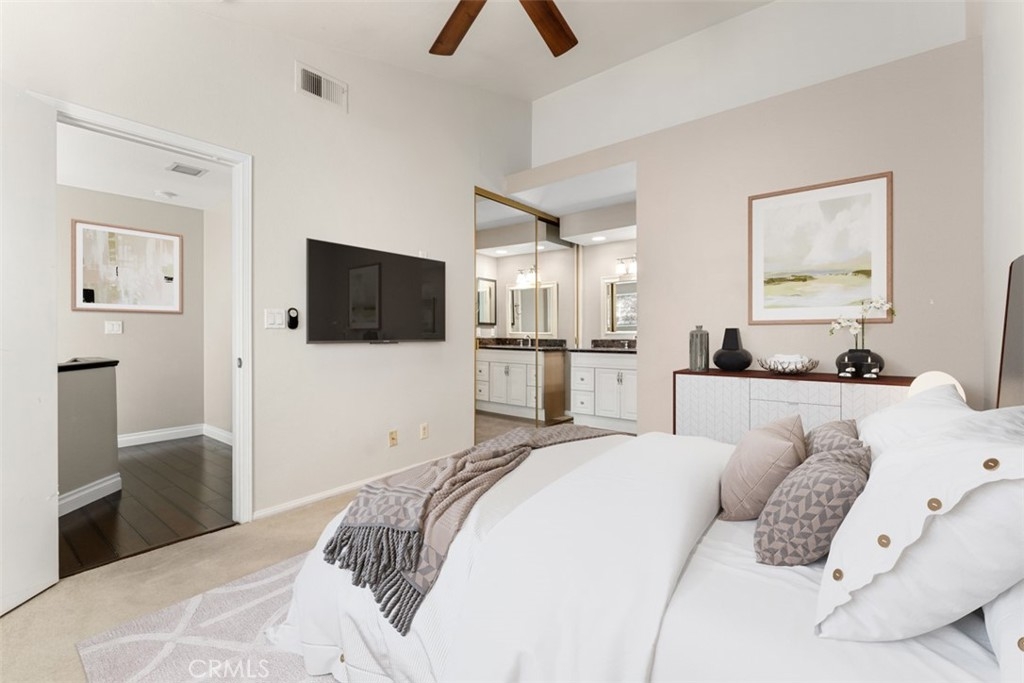 Show and sell this amazing 2 story condo in the community of Village Niguel. The unit boast 2 master suites upstairs each with its own bathroom and a bathroom downstairs. The kitchen has an open view to the dining area and also the living room. Step outside of the living room onto your oversized fenced in patio. The unit also features a front porch to enjoy that nice morning or evening settings. The property is virtually staged.