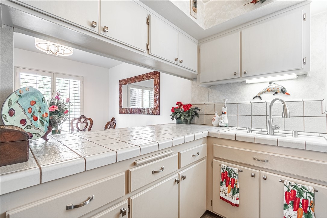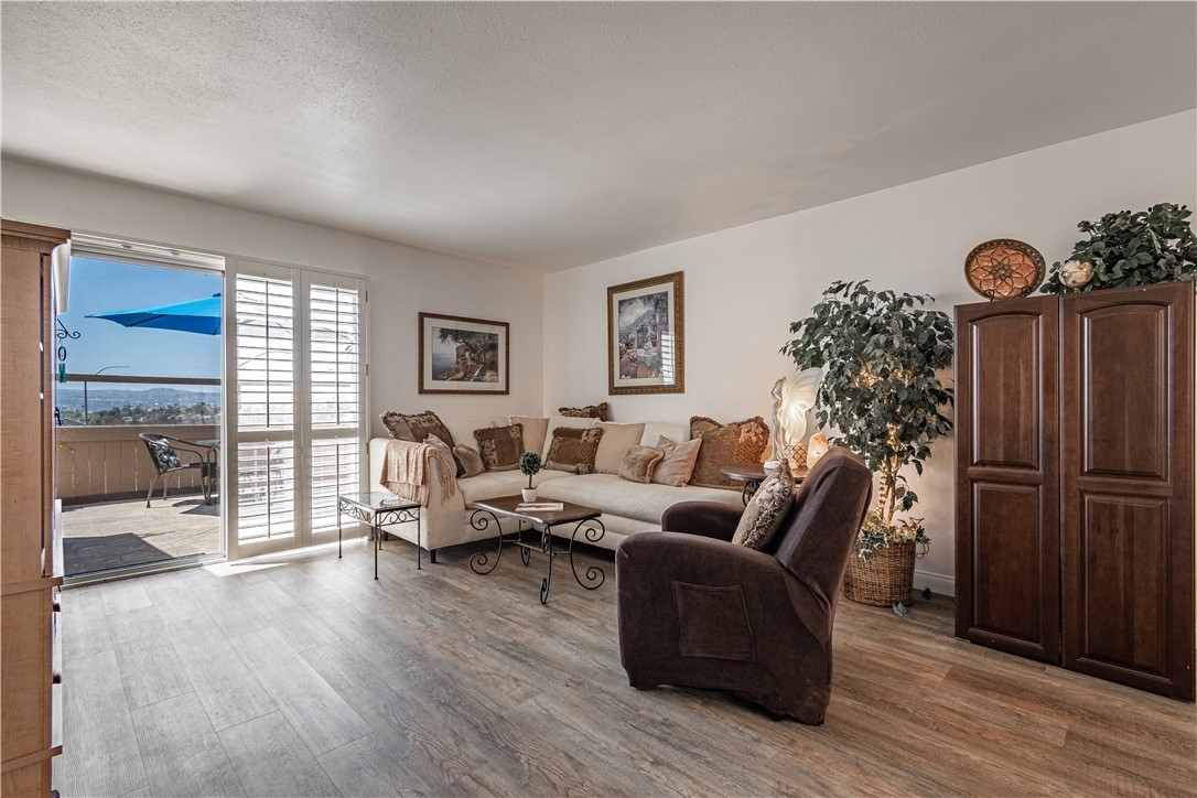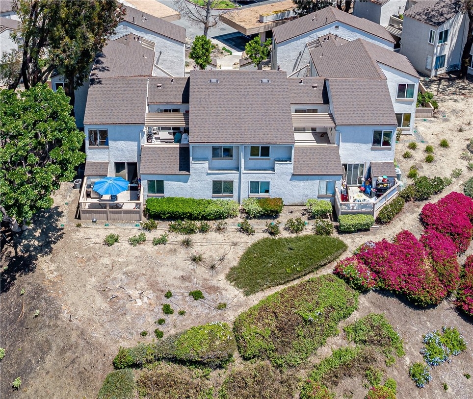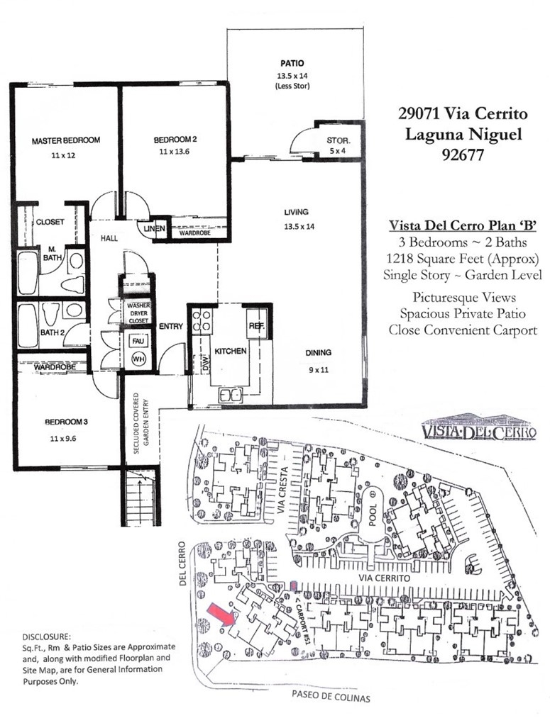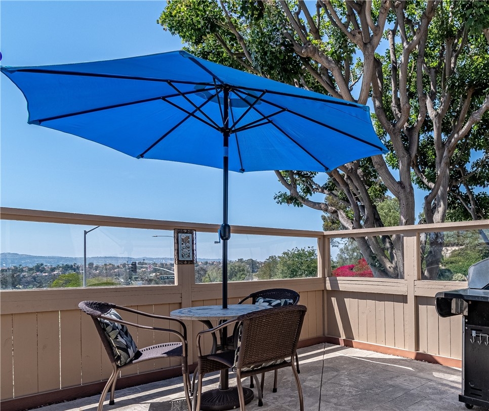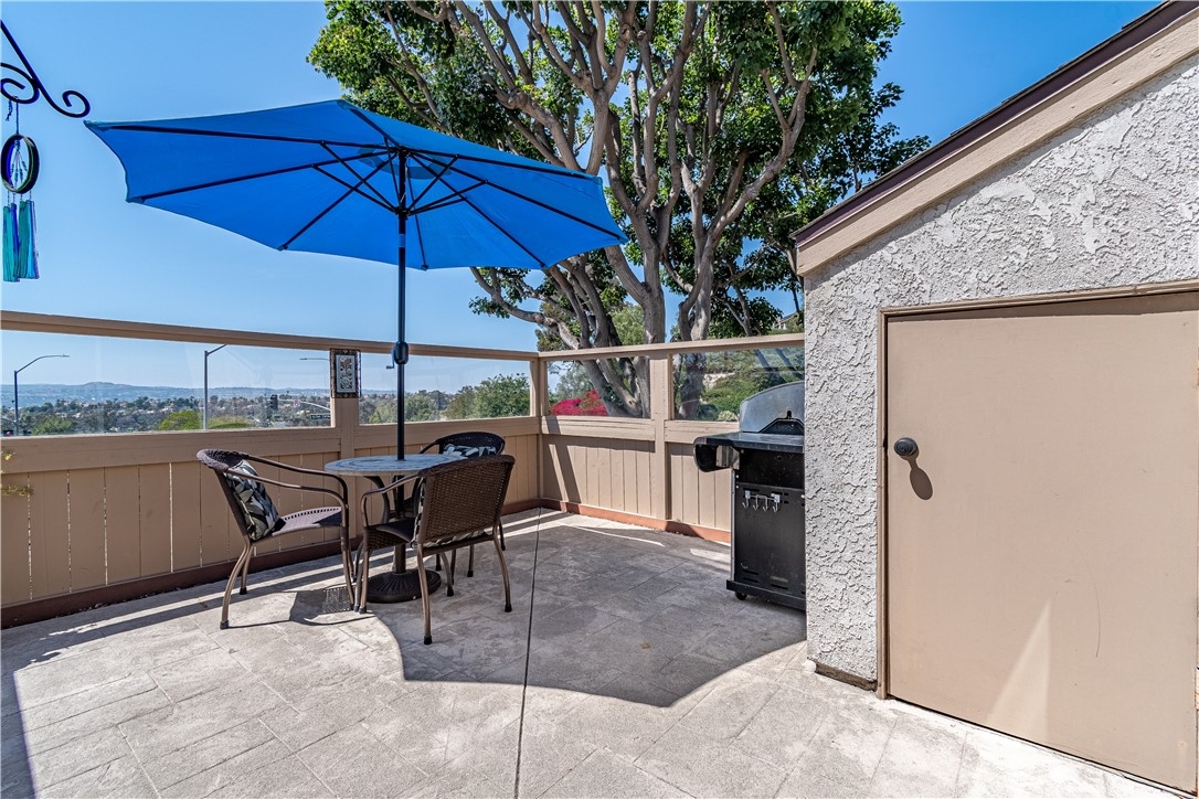 In the delightful little community of Vista del Cerro, this affordable and rare single story condo offers a hillside corner location with a large enjoyable patio. Surrounded by plenty of open space it benefits from ocean breezes and incredible city light, mountain and sunset views. Pride of ownership is evident in this stunning and well maintained home by the original owner. Starting with a secluded covered entry which features a screened door allowing for a cross breeze. Freshly painted, with numerous upgrades, this light & airy floorplan features a dining and living space that opens to a spacious patio with custom colored concrete and heavenly horizon views. Plantation shutters adjust the amount of light and breeze flowing through each room. Other notable upgrades include remote controlled ceiling fans/light fixtures, mirror wardrobes & extra closet shelves. Enjoy the added value of 4½” baseboards, luxury vinyl wood flooring, remodeled baths, refinished tubs/showers, designer lighting and mirrors. Central A/C, forced air heating, a 50 gallon gas water heater and ceiling fans lend themselves to a cost effective, comfortable living space. Convenient space saving interior laundry accommodates a stacked electric washer/dryer. A light & cheerful kitchen loaded with upgrades, stainless steel 3-drawer dishwasher, 5-burner gas stove and French-door refrigerator. Ceramic tile countertops enhance the 2-tone painted cabinetry with brushed nickel hardware. A comfortable master suite offers dual wardrobe closets leading the way to a remodeled master bath with Crème de Marfil marble top, porcelain sink and etched wave tub enclosure. The spacious second bedroom is the perfect size for bed, desk, lounging chair and more! The third bedroom (or hm office) overlooks the front courtyard where it enjoys views of some of the most beautiful full moons. The remodeled second bath showcases a 35” tall rich wood vanity, midnight blue granite top and deep porcelain sink. Home includes one covered carport conveniently located in front of building with additional open parking throughout the community. Vista del Cerro is a small community of only 60 units on 2 small interior streets making it a very private and cozy community and features a refreshing pool, spa and clubhouse.