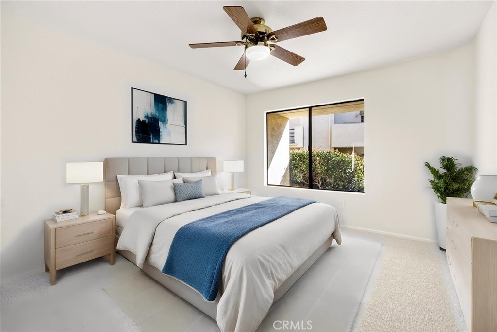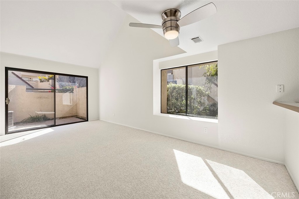 Welcome to this charming two-bedroom end unit nestled in the tranquil community of Crystal Cay of Laguna Heights. As you step through the front door, you're greeted by the warmth of brand-new carpeting and freshly painted walls, giving the space a modern and inviting ambiance. A generous slider leads to the intimate private outdoor patio, perfect for al fresco dining or quiet reflection. The kitchen has been refreshed with white painted cabinetry, and a convenient dining counter is ideal for that morning cup of coffee. One of the two bedrooms is located downstairs, with a full bath and laundry service that includes the stackable washer and dryer. Upstairs, you will be surprised to find a separate open loft area, ideal for separate den, office or “hang out” space … accented by a cozy fireplace creating a welcoming ambiance. The primary suite is spacious with a dual vanity en-suite bathroom, mirrored wardrobe doors, and a large window that allow plenty of natural light to flow in. Meandering pathways throughout the development are ideal for relaxing evening strolls, or head out for an energetic walk to the nearby nature trails. Desirable HOA amenities include two separate pools, and a fun gated “dog park” is tucked just around the corner. Super convenient location with your favorite restaurants, shopping, and parks nearby. Whether you're looking for a peaceful sanctuary to call home or a cozy retreat to escape to, this affordably priced property will surely exceed your expectations.