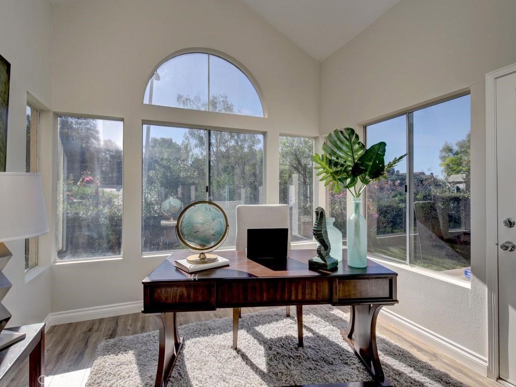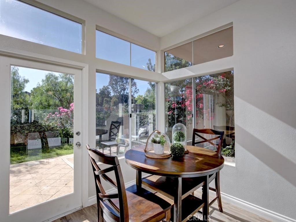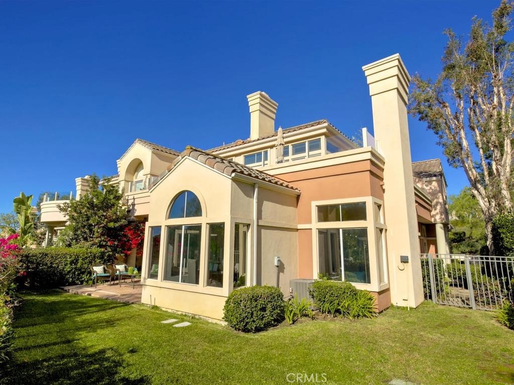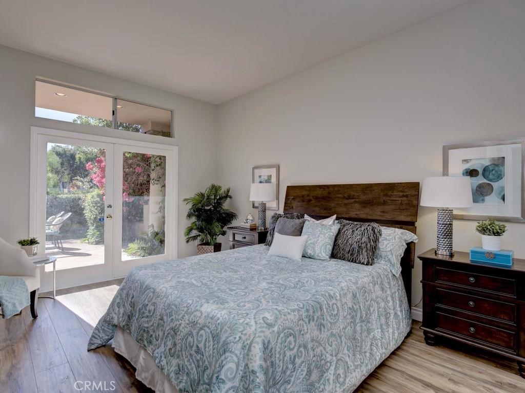 A showcase home, this updated Bear Brand Riviera ocean-close single-level is perfectly situated for a walkable lifestyle. As you approach the residence, you will notice fine architectural touches like stately columns, a plethora of windows, and the tasteful frosted half glass front door. The equally divine interior begins with a great room featuring new wood laminate flooring, recessed lighting, and a warm fireplace. The kitchen is appointed with granite countertops, a mosaic-tile backsplash, both recessed and delicate pendant lighting, wainscoting, and quality stainless steel appliances. Light floods into the home through the dining area that opens to the kitchen and the sun room/den, which can be closed off to convert into a third bedroom/guest room if needed. The en suite Master bedroom has a large walk-in closet, and direct access to the oversized backyard through French doors. The well-balanced floor plan includes a sunny second bedroom, inside laundry, and attached two-car garage. The spacious backyard is very private with no homes behind, a stamped concrete patio, and ample landscaped grass. Riviera at Bear Brand is a short walk to the community pool and spa, Bear Brand park, the well-regarded St. Anne school, and Ocean Ranch shopping center, which includes Trader Joe's, Cinepolis, Peet's coffee and more. A few miles from the Ritz, St. Regis Monarch Beach, Monarch Beach Golf Links, and Salt Creek/Strands beaches, this home is centrally located in paradise.