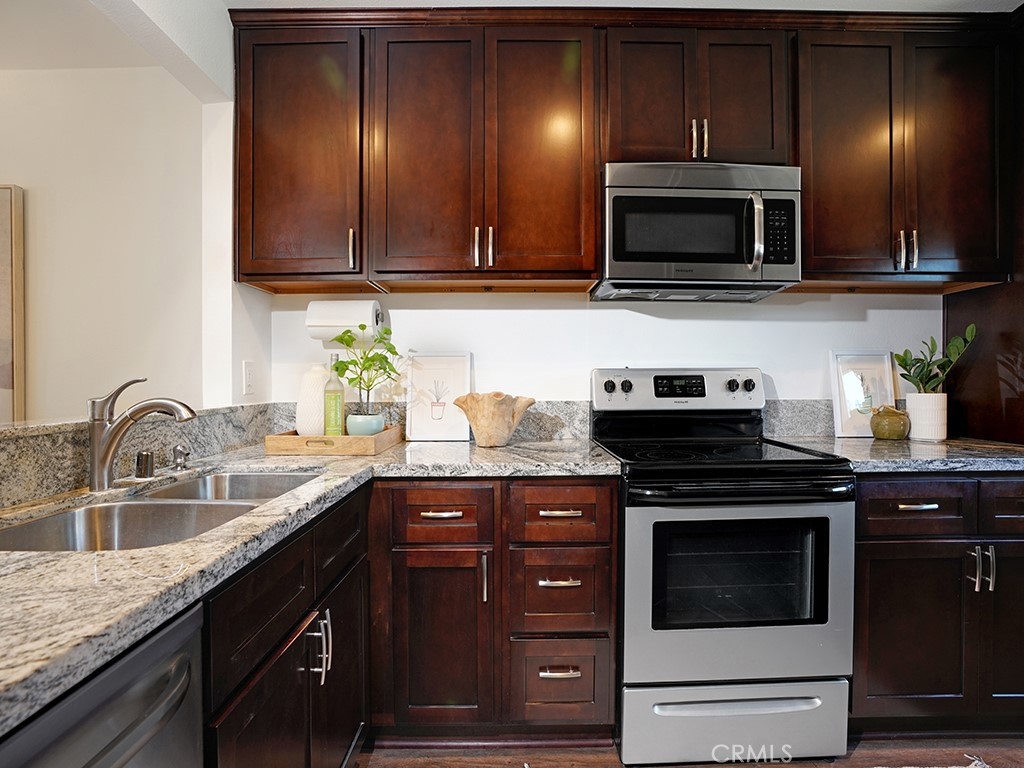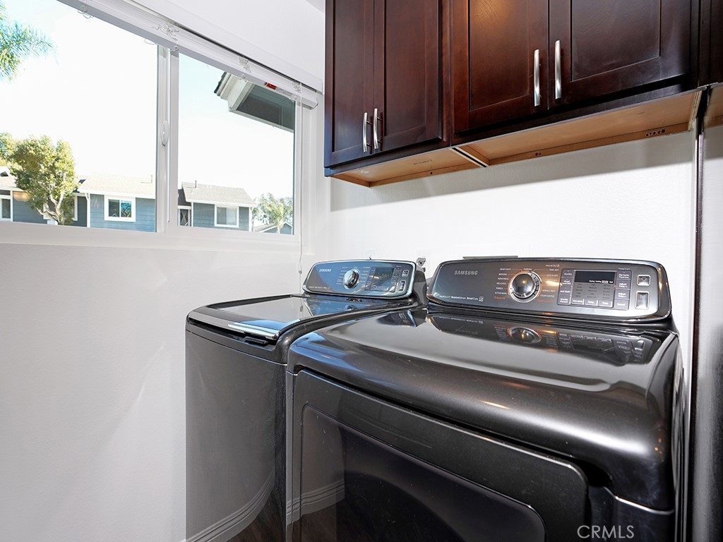 Prepare to fall in love with this beautifully updated townhome minutes from amazing restaurants, shopping, Regional and Wilderness parks, and the most popular beaches in OC! As you enter the property, you are led into a spacious living/dining room that has an abundance of natural light. The galley kitchen and both upstairs bathrooms have been updated with shaker style cabinetry and gorgeous granite countertops. The kitchen also features newer stainless-steel appliances, full-size washer and dryer, and a large pantry! The living/dining room and kitchen also have newer durable laminate style flooring throughout while the stairs and upstairs bedrooms have brand new luxury carpeting and upgraded tile flooring in the bathrooms. The primary bedroom features a large walk-in closet and a private en suite bathroom. The entire interior of the property has been freshly painted and all windows have been upgraded with dual pane windows. This light and bright home has a nice size patio with vinyl fencing and two additional storage spaces. The HOA amenities include a pool, spa, and barbecue area, exterior landscape maintenance, water, and trash. There is one assigned carport and ample open parking throughout the community. With nobody above or below you, you have the feeling of ultimate privacy in this turn-key home!