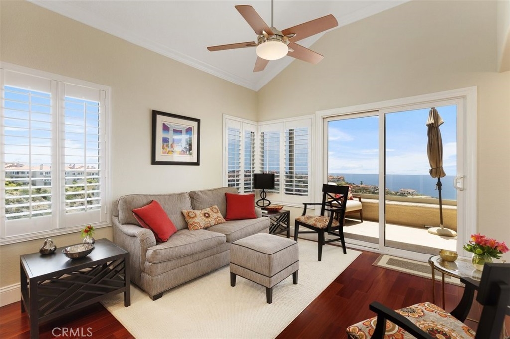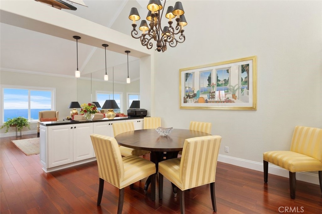 Located at the end of a cul de sac street, this beautiful Laguna Sur Villa enjoys spectacular views of the Pacific, Catalina and San Clemente Islands, breathtaking sunsets and twinkling lights evening lights sprinkled across the hills. Exquisite design and outstanding craftsmanship have been implemented in a recent extensive remodel to make this villa a masterpiece of quality and appeal. It is an extraordinary blend of modern and timeless classic design, a step above others. Several floor to ceiling mirrors reflect the wonderful ocean views which are visible from most major rooms. An important upgrade was the addition of glass railings on both decks to maximize the viewing area from both inside and from the decks. The main floor boasts rich Brazilian rosewood floors, vaulted ceilings, a spacious dining room with a custom black granite topped serving peninsula and a living room with fireplace, all with wonderful ocean views and opening up to one of the spacious ocean view decks. Also on this level, the kitchen/breakfast nook /family room has been opened up and boasts a great gas cook top, custom cabinets (some lighted) and a wonderful island which is just right for food prep, serving, and visiting with the chef. Downstairs is a private and extensive primary suite with office nook with a built-in desk and a retreat area large enough for a small sofa and TV. A dual sided fireplace separates that area from the rest of the luxurious ocean view bedroom area which opens to another spacious ocean view deck. A lovely bath with jetted tub, large shower and a roomy walk-in closet complete this dedicated primary suite floor. The upper level boasts two bright and sunny guest rooms with a dual bath in between. The landing has been extended and leads to a finished play area/storage room with a secret entrance concealed behind the bookcase! Fresh paint, new doors and hardware, new shutters, new crown molding, wide baseboards, a new staircase banister, new light fixtures, new carpet, new remote control ceiling fans, and new cabinets were added during the recent remodel. The turnkey condition of this extraordinary home, with the nearby community tennis courts, pool and spa, provides one with the chance to move in and enjoy an endless summer vacation in your own home. Enjoy the picturesque "South County Riviera" area of Orange county with nearby beaches, world class luxury hotels, Dana Point Harbor and wonderful restaurants and shopping .