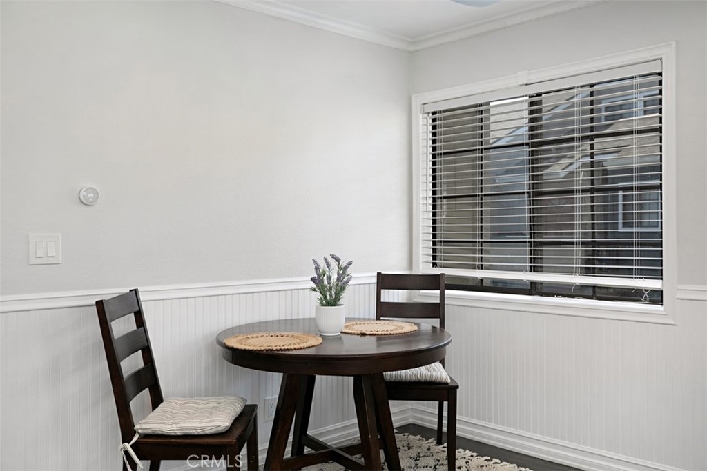 Immaculate and upgraded upper-level condo with two bedrooms and two baths. Centrally located in the gated community of Village Niguel Terrace, this home is an end unit with no one above or below. Warm hardwood floors, fresh paint, recessed lighting throughout compliment a bright and open floorplan. Enter into a spacious living room with vaulted ceilings that flows into the dining area with wainscoting. The kitchen features granite counters with backsplash, stainless steel appliances and white cabinets. The master bedroom offers a spacious balcony along with a remodeled, ensuite full bathroom. The secondary bedroom is generously sized, adjacent to the remodeled hall bathroom with walk-in shower. Additional features include an indoor stackable laundry closet, crown molding, framed custom door frames, central air and recently repiped. Enjoy a spacious front patio for outdoor dining along with the community pool and spa with lush landscaping, tennis courts and dog park. One car garage directly below with additional parking space is permitted. Close proximity to local shopping, dining and Laguna Niguel Regional Park & Lake.