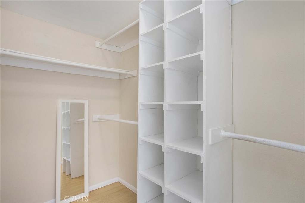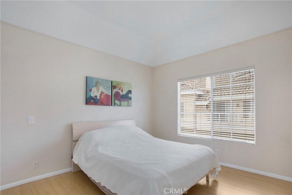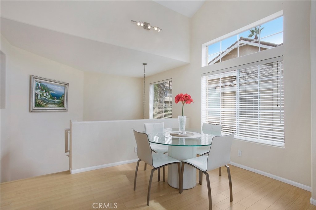 What an opportunity to own in scenic and affordable Laguna Niguel, halfway between Los Angeles and San Diego. A highly sought after end unit, this 861 sq ft townhouse packs plenty of smartly designed and open living space. Beautiful, easy to maintain wood flooring runs throughout most of the main living areas. Positive energy permeates from light provided by the cathedral ceiling, kitchen skylight, and windows. The bedroom boasts space, ensuite with dual sinks, and a good-sized walk in closet complete with everything in place to store all wardrobe attire. Another bonus is the balcony that awaits through the sliding glass doors. Clean, elegant lines throughout lend a chicness that you will enjoy every moment in your new home. Located in Del Prado, a well-maintained community complete with amenities from all ages from playgrounds to an oversized pool and spa, this is a must-see.