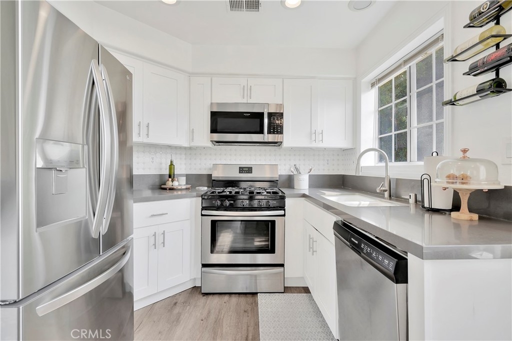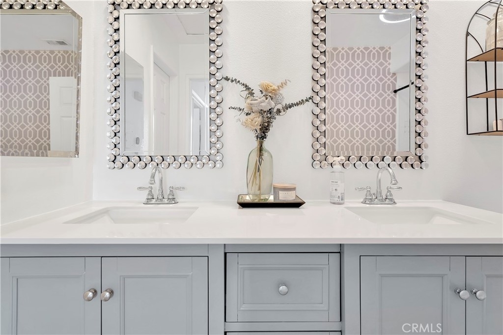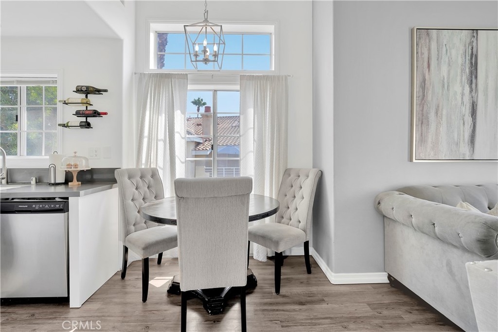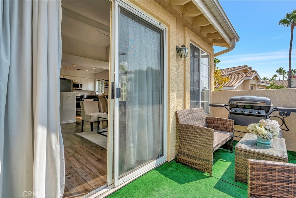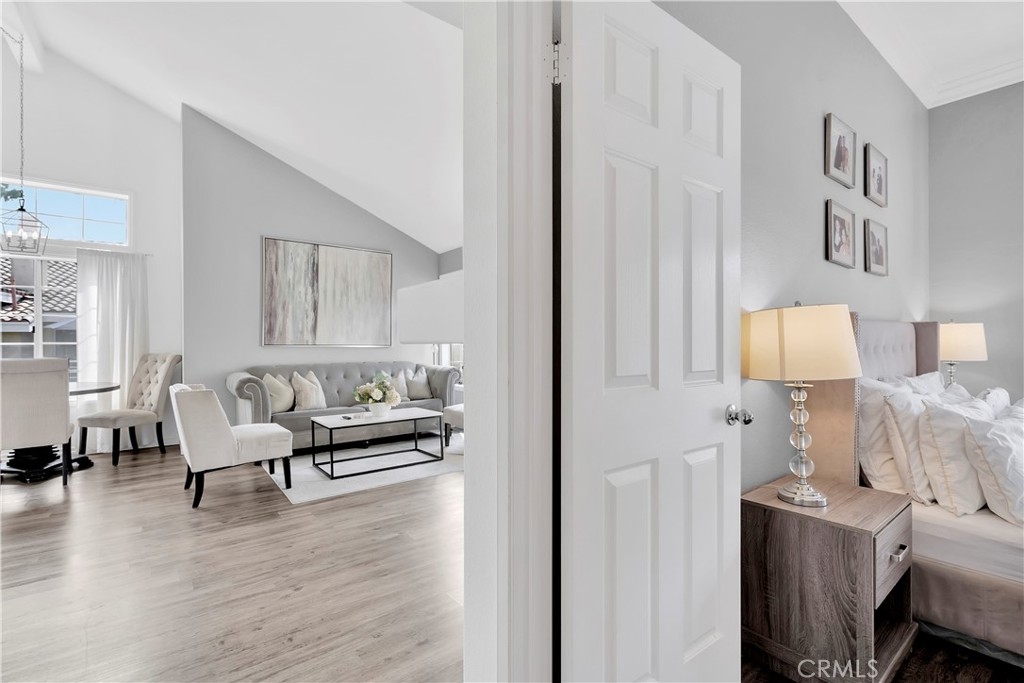 Pristine and highly upgraded, prepare to fall in love with this prized upper-level corner unit, ideally located in the desirable Del Prado community. The gated front patio entrance welcomes you into the home and up the curved staircase with custom chandelier to the light filled open-concept floorplan with a freshly painted interior and living area blessed with vaulted ceilings, sleek wood laminate flooring, built-in media nooks, cozy fireplace with gorgeous herringbone tile fireplace surround, and direct access to the private balcony with wonderful views providing an ideal indoor-outdoor living space. The breathtaking kitchen has been stylishly designed with Quartz countertops, custom tiled backsplash, matching stainless-steel appliances, updated faucet and fixtures, and beautiful white shaker cabinetry. The sunny dining area is open to the kitchen and living area, perfect for entertaining with family and friends. The master bedroom is a spacious private retreat with a double door entry and a walk-in closet with built-in closet organizer. The bath has been spectacularly remodeled with gorgeous cabinetry, a Quartz topped dual vanity, updated fixtures and hardware, and custom framed vanity mirrors. The 2nd bedroom includes custom built-in wardrobe organizer. Additional fine features and amenities include Ecobee Smart Thermostat (google home activated), Bluetooth speaker air vent in bathroom, updated custom lighting throughout the home, and a Vivint Smart Home camera doorbell and security system. The private balcony provides a wonderful space for relaxing and BBQing while enjoying wonderful sunset views. The oversized direct access garage includes Epoxy floors. The well-maintained community amenities include a sparkling community pool and spa, and picnic areas. Superbly located within walking distance to an abundance of dining, shopping, theater, and fitness center. Easy Toll Road and Freeway access, just minutes from local beaches. No Mello Roos!