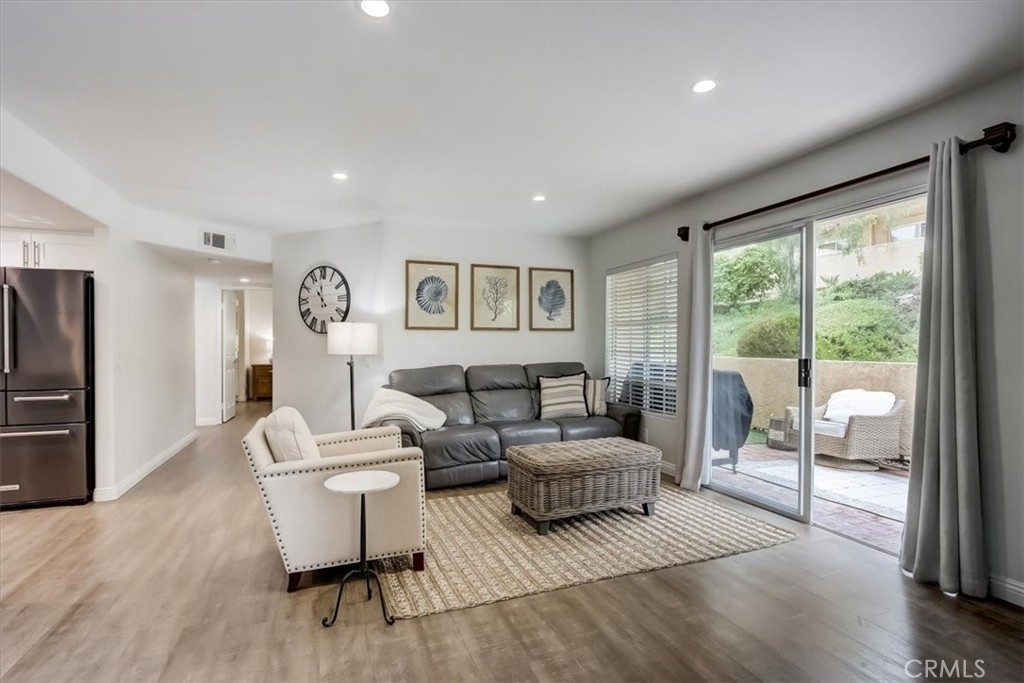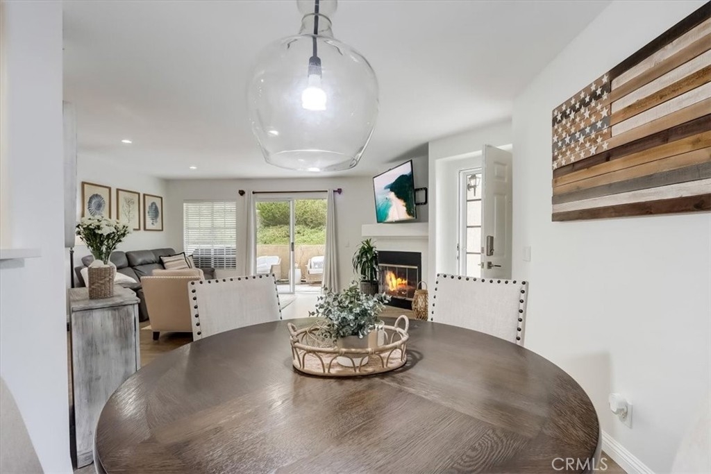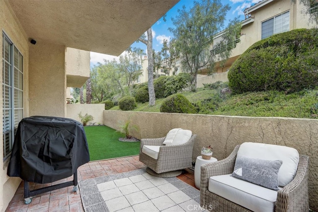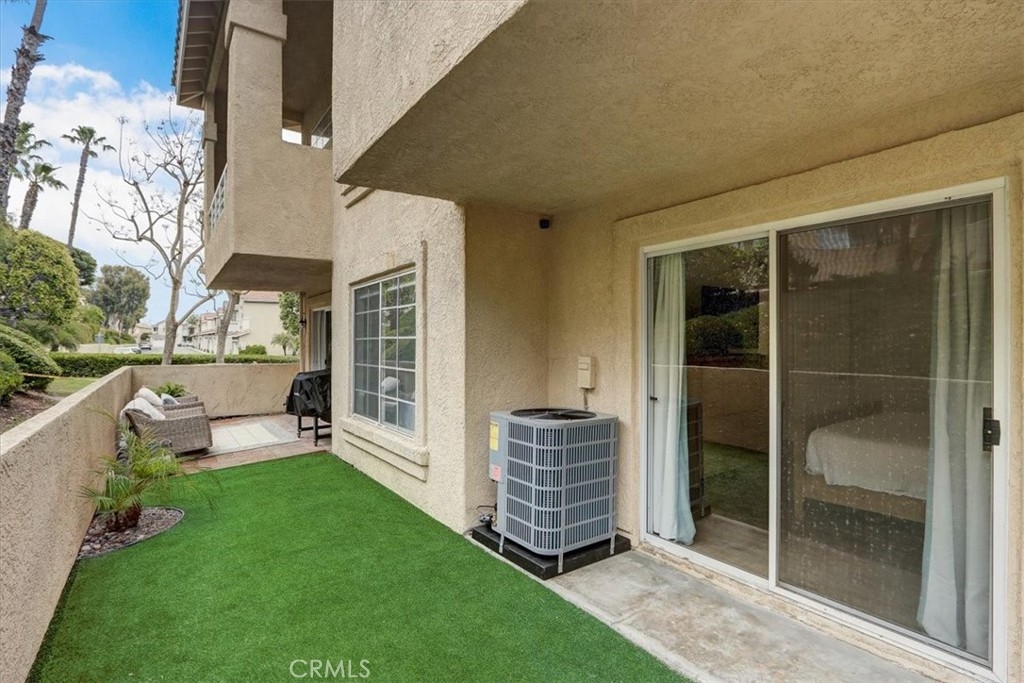 Beautifully remodeled, this Del Prado condo is truly turnkey! Warm vinyl wood floors, recessed lighting and custom finishes throughout complement the bright and open floorplan. Enter into the inviting living room featuring a cozy fireplace and sliding doors to the back patio that seamlessly flows to the dining area and to the kitchen. The kitchen is upgraded with fresh white cabinets, quartz counters, subway tile backsplash and stainless steel appliances. Down the hall, the primary bedroom offers light-catching sliding doors to the back patio and an en-suite primary bathroom with a quartz topped vanity with dual sinks and a walk-in shower with decorative tile. The secondary bedroom is generously sized, features a shiplap wall and is adjacent to the full hall bathroom. Additional features include a brand new HVAC, newer water heater and direct-access to the two-car garage with convenient laundry hook ups. Relax in the spacious back patio featuring low-maintenance artificial grass. Enjoy the nearby community pool, spa and playground. Located near shopping and dining options, easy freeway and toll road access and award-winning schools!