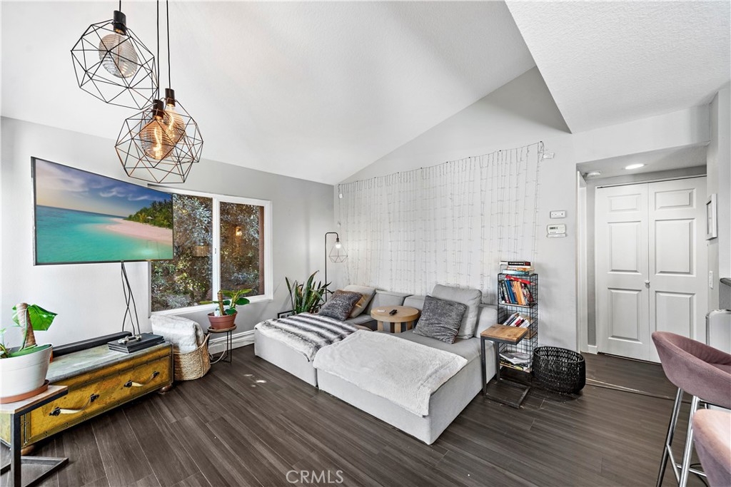 Welcome home to this cozy one-bedroom, one-bathroom condo nestled in beautiful Laguna Niguel. The lovely pool and surrounding area gives the feeling of resort living. Situated on the peaceful second story, the patio is surrounded by lovely landscaping that adds privacy and a tranquil view. The kitchen boasts shaker-style cabinets and lovely quartz countertops and opens to dining and a spacious living room. The cozy living room sports vaulted ceiling, large windows, and slider leading to the lovely patio, allowing plenty of natural light to bathe the living area. All windows have been upgraded with Milgard double-pane windows. New flooring in the living room and bedroom. The laundry is conveniently located, with plenty of room for full-size washer & dryer in the hall. The spacious bedroom has a walk-in closet and is light and bright. Nice size bathroom with bathtub and shower. The one-car garage is conveniently located with high ceiling and has plenty of room for storage. This lovely condo is surrounded by wonderful shopping, restaurants, car wash, regional park, beaches, and the 73 and 5 freeway.