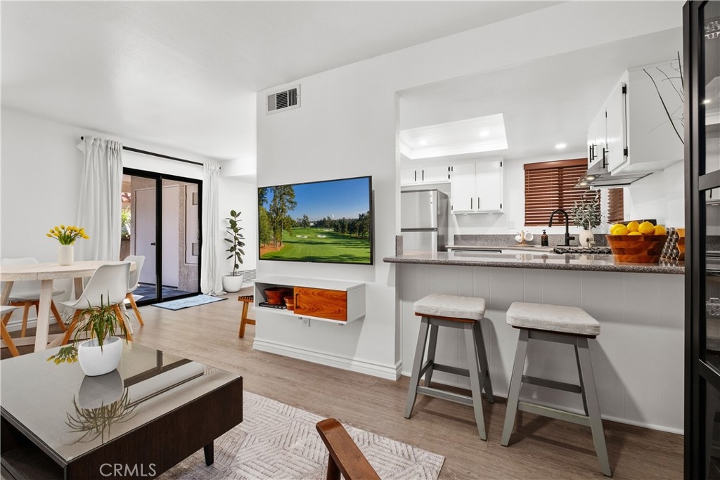 Welcome to 28112 Mariposa Unit 165 — a thoughtfully updated 2-bedroom, 2-bathroom Villamira condo located in the heart of Laguna Niguel. This single-level home features newer luxury vinyl plank flooring throughout, creating a clean, modern foundation that complements a variety of interior styles. The open-concept layout offers comfortable flow between the living, dining, and kitchen spaces, ideal for everyday living and casual entertaining. The kitchen is appointed with stainless steel appliances and a farmhouse sink, reverse osmosis water filtration and refreshed slide-out racks in the cabinets. Step outside to a generously sized private patio—perfect for morning coffee, evening unwinding, or container gardening. Both bedrooms are well-proportioned, with the primary suite offering an en-suite bath with remodeled shower, tiled flooring and ample closet space. The second bathroom has been completely remodeled with a new tub-in-shower, vanity, LED mirror, and tile flooring. The unit includes newly installed LED smart switches throughout, full-sized laundry in the storage closet on the patio, a convenient one-car garage and ample guest parking. Additionally, the entire community was re-piped with PEX several years ago. The complex was painted in 2023 and new asphalt laid in late 2024. Villamira is very well maintained with swimming pools, spas, and a clubhouse all surrounded by lush landscaping. Conveniently located near shopping, dining, parks, and the coast, this updated condo is move-in ready and primed for easy Southern California living.