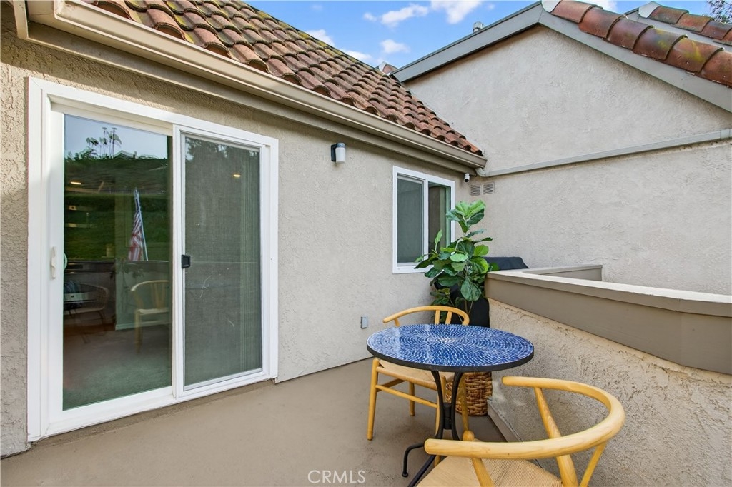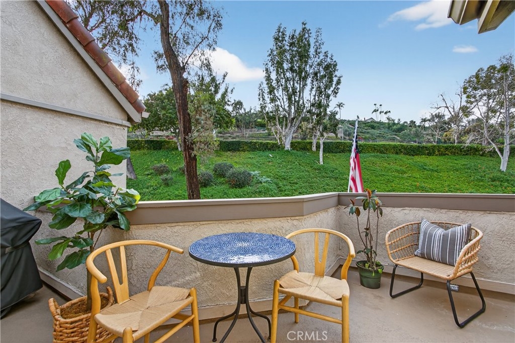 Welcome to easy living in the highly desirable VILLA MIRA community. This UPDATED UPPER-LEVEL, END UNIT has 2 bedrooms, 1 fully remodeled bath, and 796 square feet of bright, open living space with HIGH CEILINGS and no one above you. This floor plan just works. The RENOVATED KITCHEN opens seamlessly to the dining and living areas, creating a connected, airy space that feels larger than expected. Whether you're hosting friends or enjoying a quiet night in, the layout makes everyday living simple and comfortable. Step outside to your PRIVATE PATIO overlooking VIEWS OF a peaceful greenbelt and landscaped hillside. With plenty of room for seating, it’s the perfect place for morning coffee, evening unwinding, or listening to music and relaxing at the end of the day. A convenient LAUNDRY CLOSET is located right on the patio. The bathroom has been COMPLETELY REMODELED with impressive, high-end finishes including Grohe, Hansgrohe, and Graff fixtures, a Duravit sink and toilet, a Geberit in-wall flush system, and a Robern medicine cabinet. Every detail was thoughtfully selected for both style and quality. As an END UNIT, the home enjoys abundant natural light, enhanced by DOUBLE-PANE WINDOWS that add comfort and efficiency. Living upstairs with soaring ceilings creates an open, elevated feel that truly defines “easy living.” This home also includes a DETACHED GARAGE plus ample guest parking nearby... a rare and valuable convenience. Villa Mira residents enjoy two pools, a spa, a clubhouse, and beautifully maintained grounds. The HOA continues enhancing the community with DROUGHT-FRIENDLY LANDSCAPING, keeping curb appeal attractive and low maintenance. Located in a quiet, friendly South Orange County neighborhood close to beaches, dining, shopping, and major freeways, this home offers comfort, convenience, and a relaxed coastal lifestyle all in one.