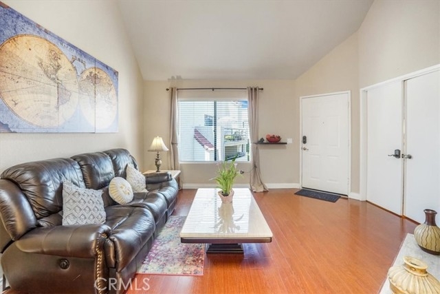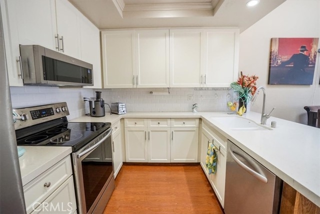 Welcome to your gem home in Laguna Niguel featuring HIGH VAULTED ceilings, open floor plan, updated kitchen with two bedrooms, and two full bathrooms. Quietly nestled in the back of the track, this end unit is up one flight of steps with no one above you. The entry welcomes all with a spacious living area, updated fireplace, eating area and updated kitchen. The kitchen features white cabinetry, quartz countertops, and a timeless subway tile backsplash. All this topped off with stainless-steel appliances, plus the included refrigerator. Added features include spacious bedrooms with high ceilings, added light fixtures in the closets, an in-unit washer and dryer, also included, and parking for two cars with one being an assigned coveted end spot carport with storage! You are close to one of the two swimming pools, but not so close that you hear them. Quick access to the back parking for friends and family. Mere steps away from the "Bluff Trail" for fun hikes and all the open space behind the track. Crystal Cay boasts amenities including a dog park, two pools and spas, greenbelts and walking paths, and trash collection is included with your HOA dues. The beach is a short drive away along with the Mission Viejo Mall for shopping and dining. Easy access to the 5 freeway and 73 Toll Road. Come see your new home today!